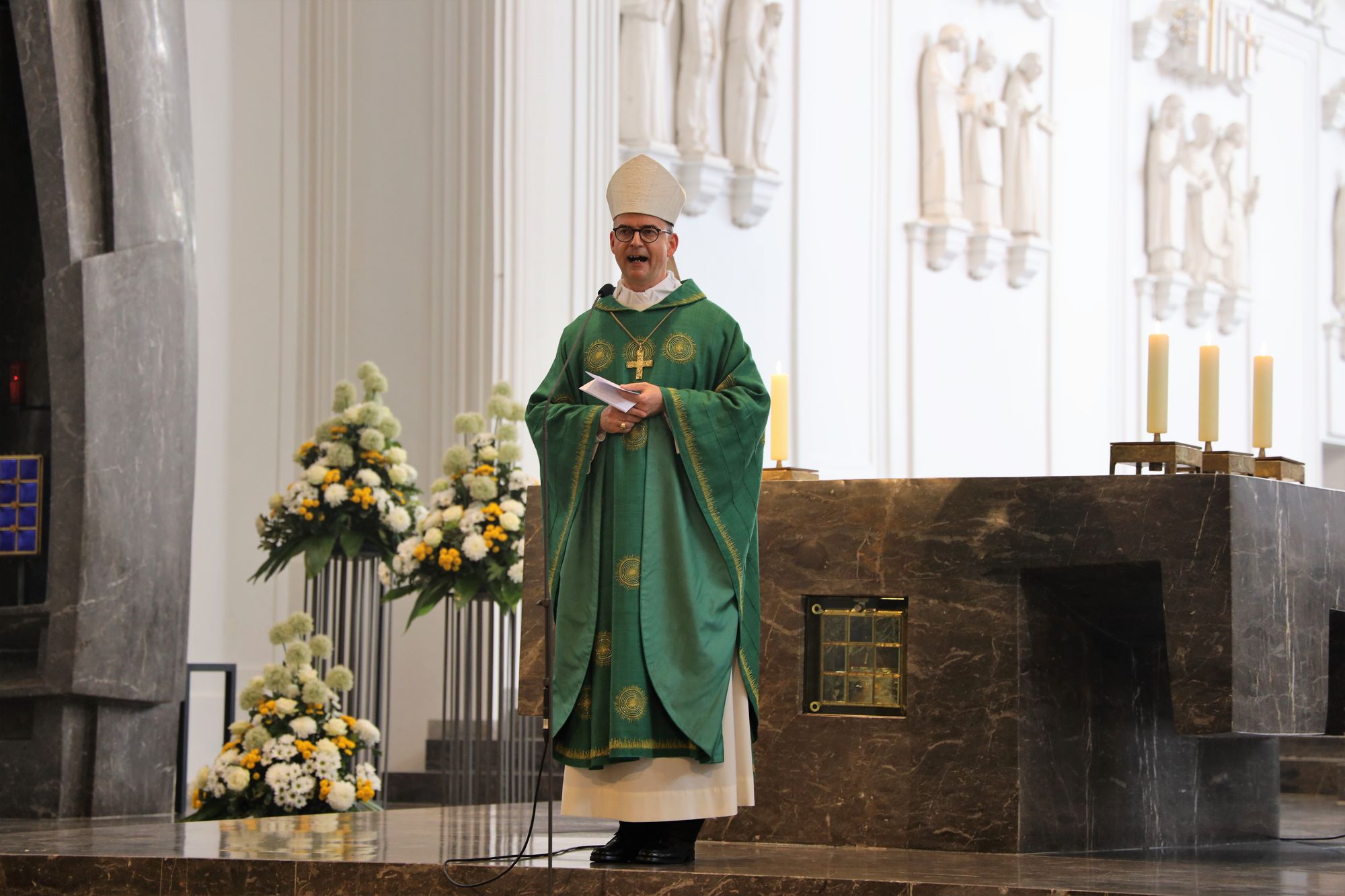 In seiner Predigt deutete Bischof Jung das Gleichnis von der selbstwachsenden Saat. Es sei lehrreich, was das geistige Wachstum der Kirche als Ganzes, aber auch jedes einzelnen Menschen betreffe. Dass etwas wachse, bleibe Geschenk und Gnade, betonte der Bischof. Wie der Bauer im Evangelium könnten auch die Menschen nur einen Beitrag dazu leisten, indem sie für die passende Bodenqualität, geeignetes Saatgut und den richtigen Zeitpunkt der Saat sorgten. „Die Saat, sie wächst von selbst, und nicht, weil der Mensch es erzwingt“, betonte der Bischof.