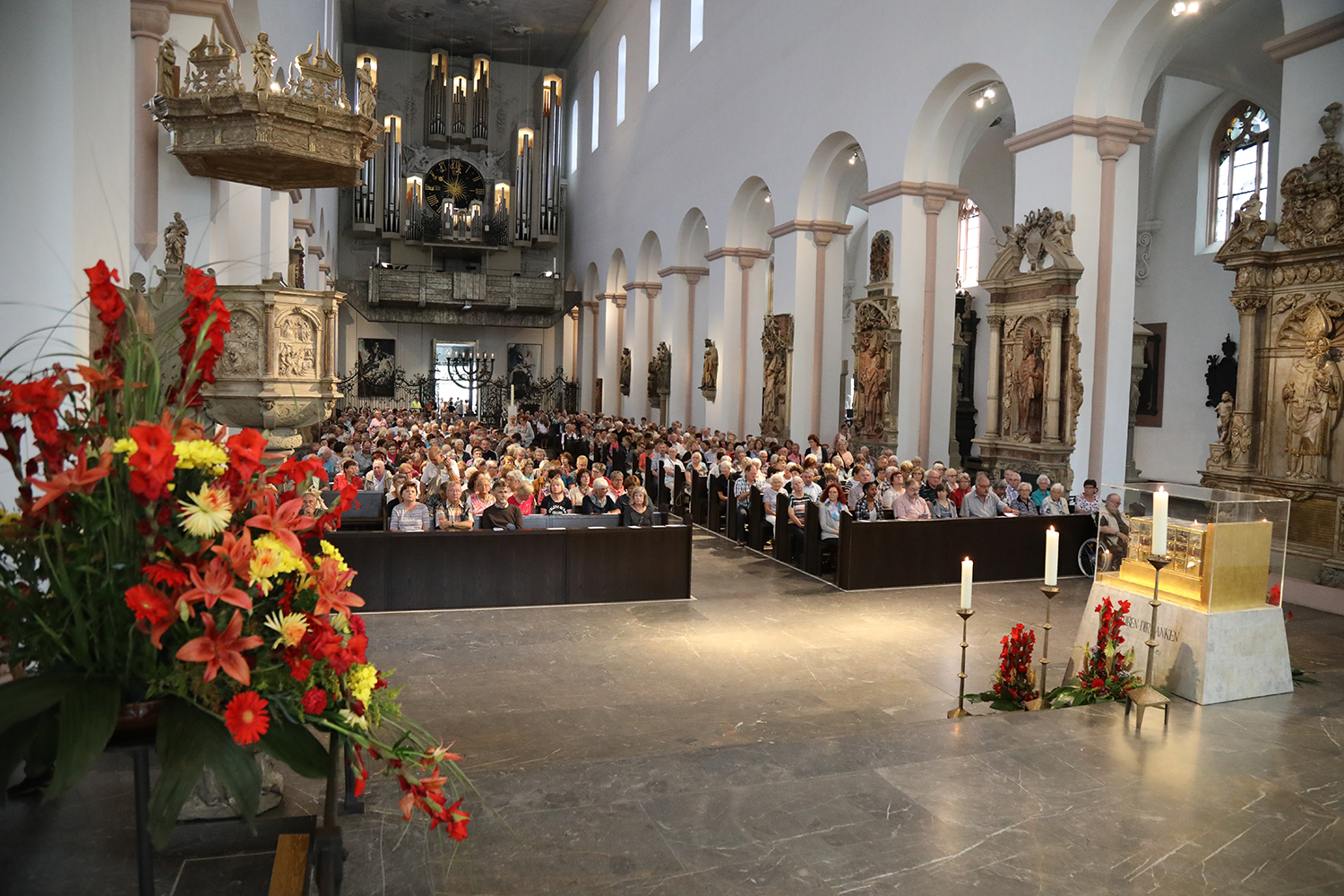 Würzburg (POW) Die Frankenapostel waren Menschen, die Jesus in ihrem Herzen getragen haben. Daran hat Weihbischof Ulrich Boom bei einem Pontifikalamt zur Kiliani-Wallfahrt der Dekanate Karlstadt, Lohr, Ochsenfurt und Kitzingen erinnert. Rund 900 Menschen waren am Mittwoch, 12. Juli, in den Kiliansdom gekommen, um der drei Frankenapostel zu gedenken. Aus den Dekanaten Karlstadt und Lohr pilgerten rund 500 Menschen mit neun Bussen nach Würzburg. Johannes Weismantel, Leiter des Diözesanbüros Main-Spessart, organisierte die Fahrt. „Es ist schön, dass sich so viele Menschen die Zeit genommen haben, bei der Wallfahrt mitzumachen“, sagte er. Jeweils ein Bus hielt für eine kurze Statio unter anderem bei den Kilianskirchen in Wohnrod und Thüngen. In Würzburg zogen die Wallfahrer anschließend singend und betend am Mainufer entlang über die Alte Mainbrücke in den Kiliansdom ein. Dass so viele Menschen in den Dom gepilgert seien, sei eine gute Botschaft, ein gutes Zeichen des Glaubens, sagte Weihbischof Boom zu Beginn des Gottesdienstes.