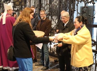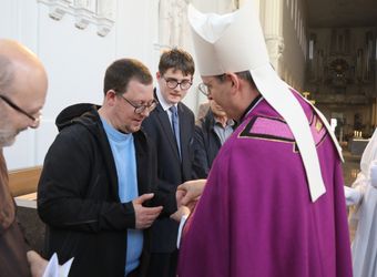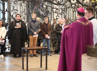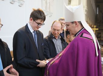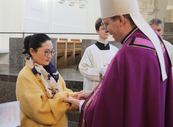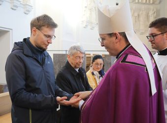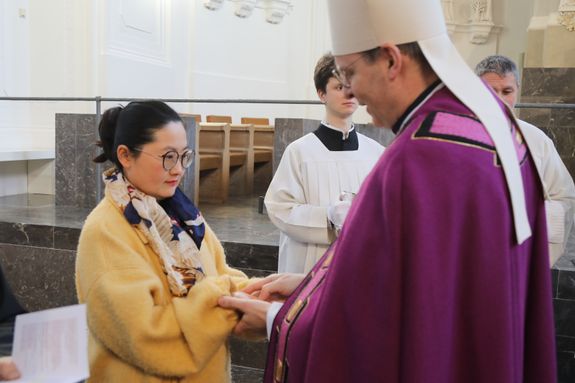 Würzburg (POW) Insgesamt zwei Frauen und acht Männer aus der Diözese Würzburg möchten in die katholische Kirche aufgenommen werden. Weihbischof Paul Reder erteilte ihnen am Sonntag, 9. März, im Auftrag von Bischof Dr. Franz Jung im Würzburger Kiliansdom die Zulassung zu Taufe, Firmung und Eucharistie. Der Weihbischof salbte sie dazu mit Katechumenenöl und segnete sie. Nach mindestens einem Jahr der Vorbereitung werden sie an Ostern oder in der Osterzeit in ihren Heimatgemeinden in die Gemeinschaft der Kirche aufgenommen.
