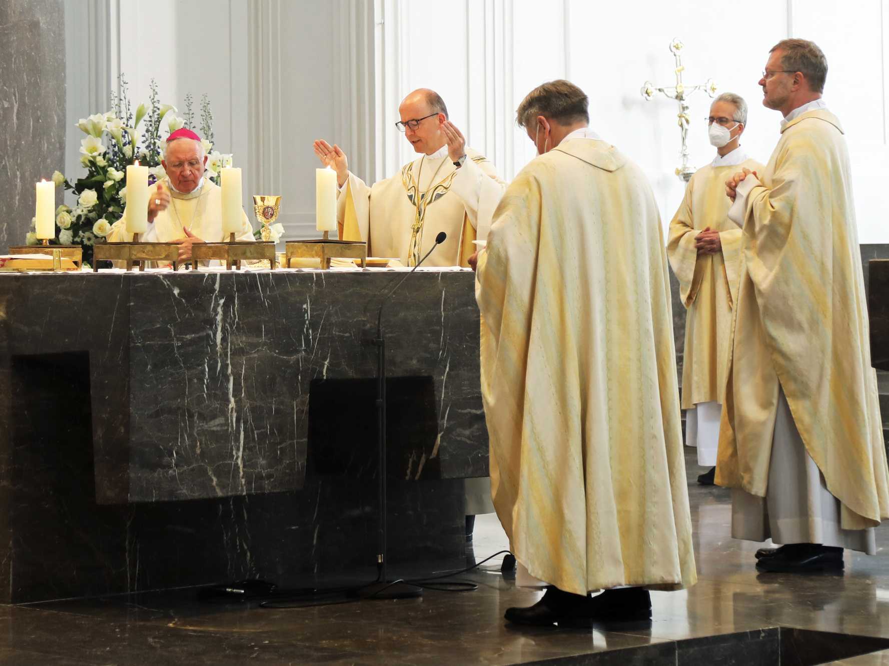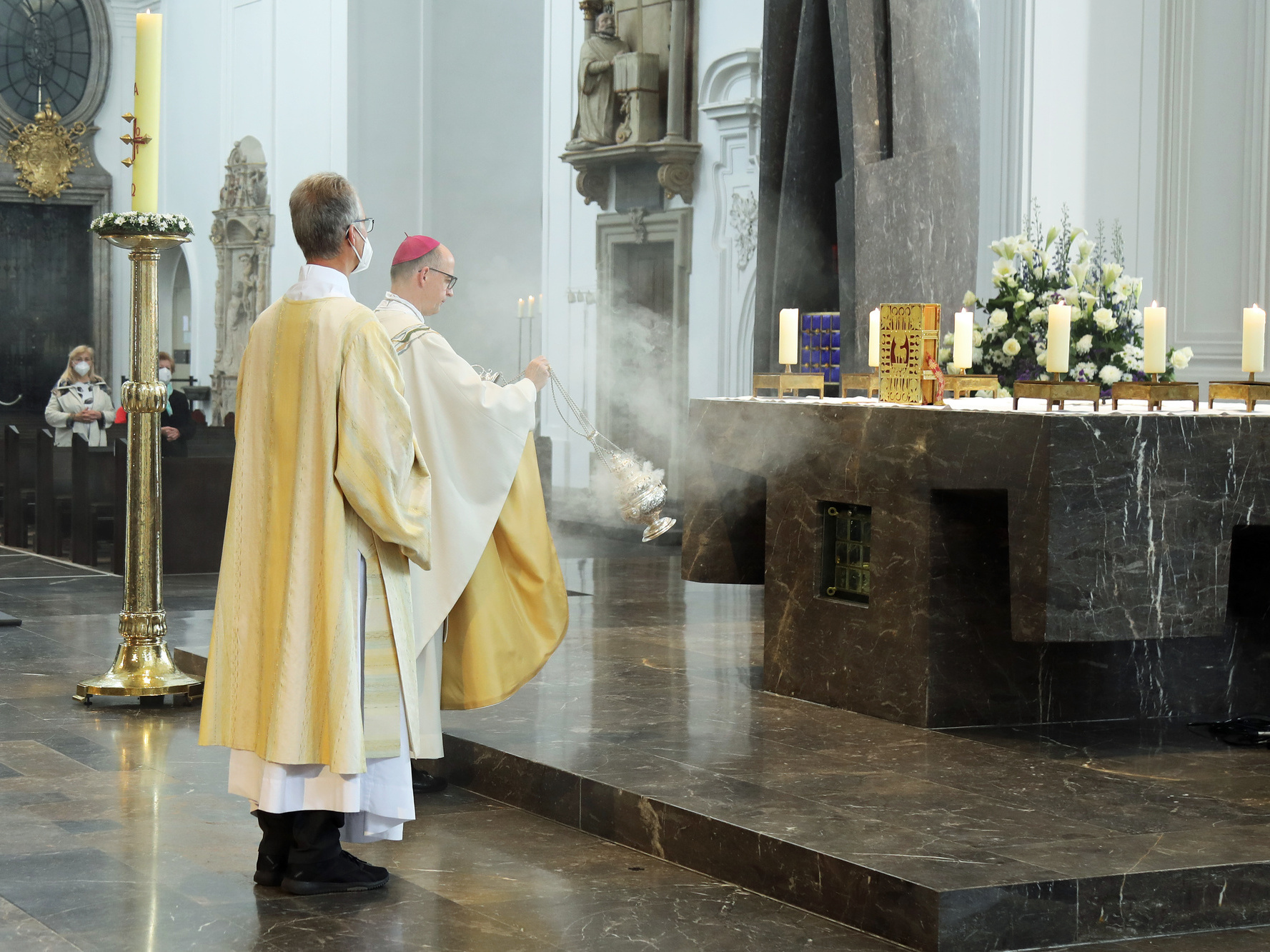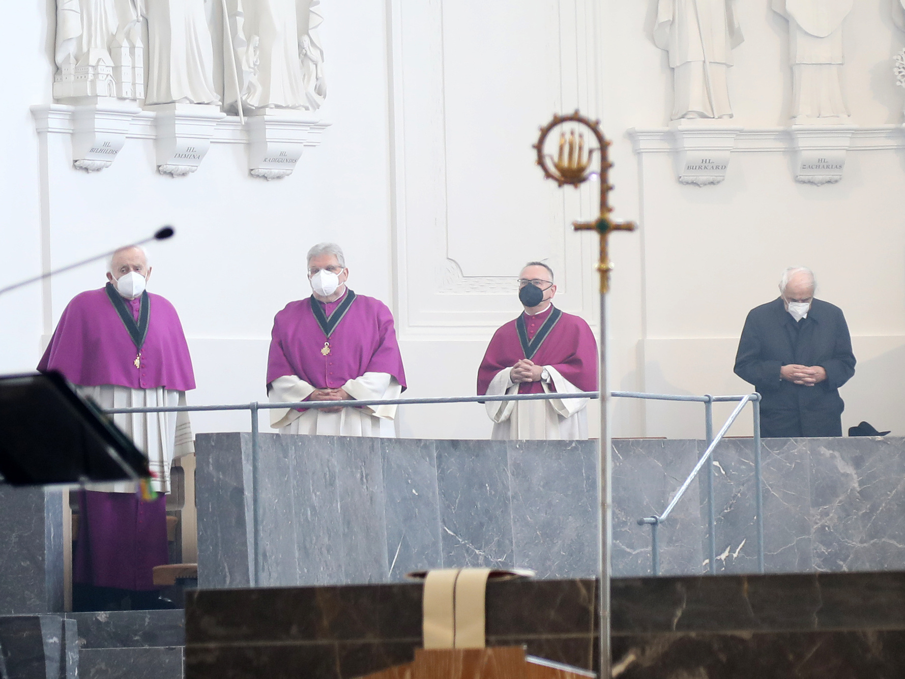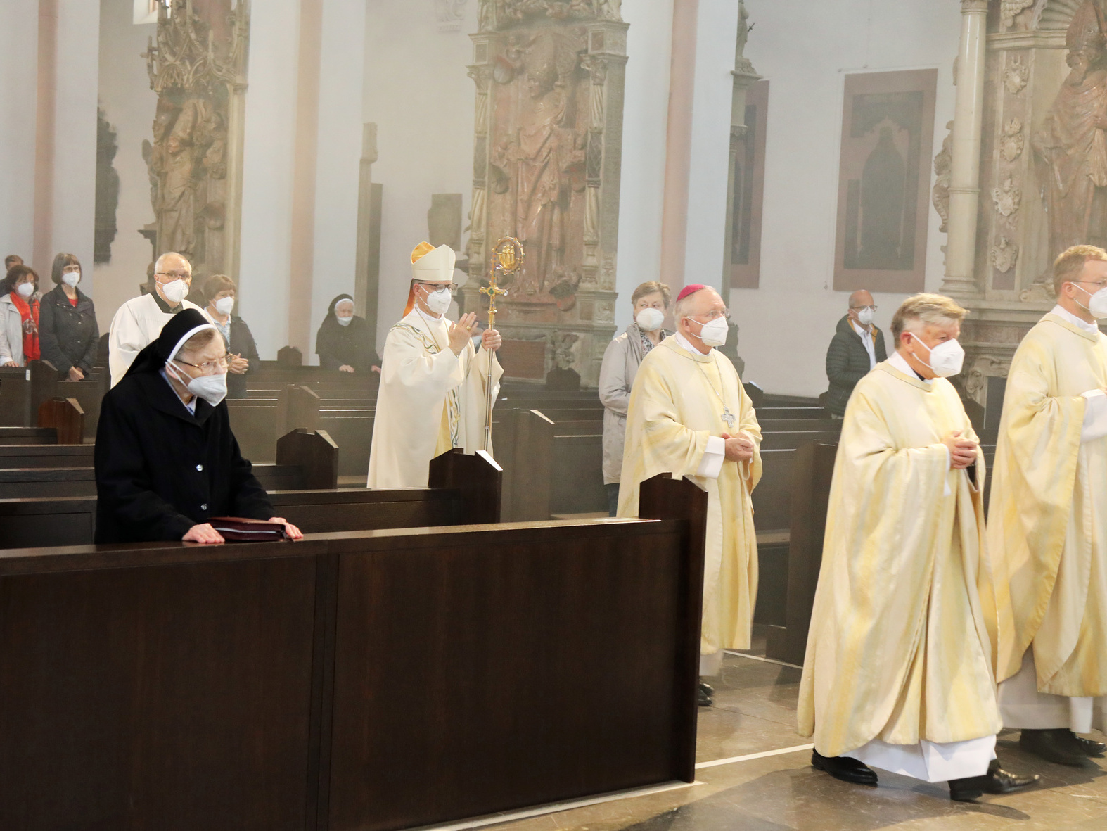Würzburg (POW) Bischof Dr. Franz Jung hat am Montagvormittag, 10. Mai, im Kiliansdom einen Gedenkgottesdienst zum zweiten Jahrestag des Todes von Bischof em. Dr. Paul-Werner Scheele gefeiert. Konzelebranten waren Weihbischof Ulrich Boom und Generalvikar Dr. Jürgen Vorndran. Auch Weihbischof em. Helmut Bauer feierte den Gottesdienst unter den derzeitigen Hygienemaßnahmen mit. Bischof Scheele starb am 10. Mai 2019 im Alter von 91 Jahren in Würzburg. Dem Kiliansbistum stand er von 1979 bis 2003 vor. Bischof Scheele habe sein bischöfliches Amt als Zeuge für die Wahrheit im Heiligen Geist verstanden, sagte Bischof Jung zu Beginn des Gottesdienstes: „Eine Wahrheit, die so groß ist, dass sie hilft, auch die getrennten Schwestern und Brüder im Glauben zusammenzuführen und die Einheit im Glauben zu denken. Danken wir ihm für sein großartiges Zeugnis, das er als Bischof und Hirte gegeben hat, und vertrauen wir ihn heute in besonderer Weise der Barmherzigkeit Gottes an.“