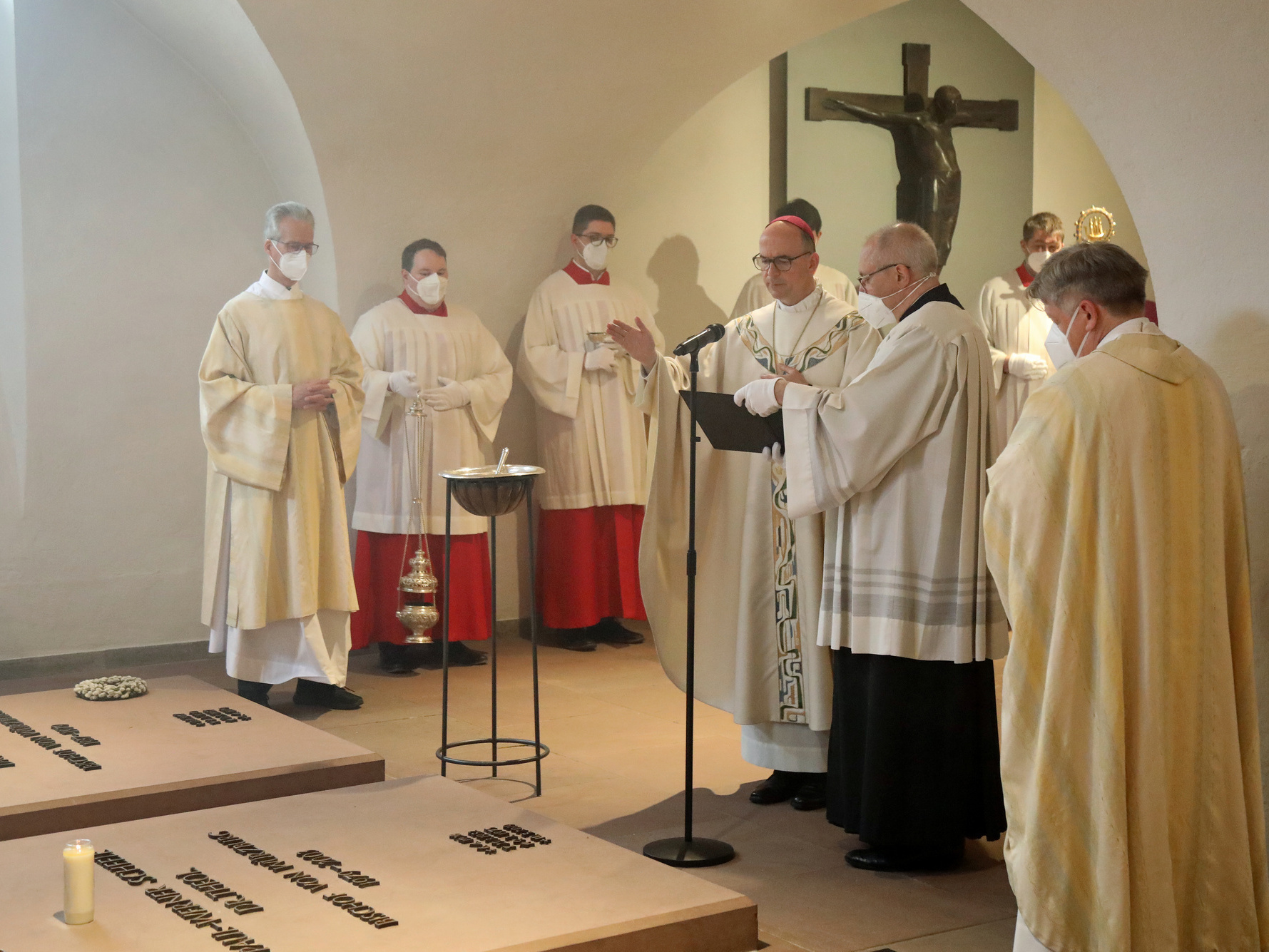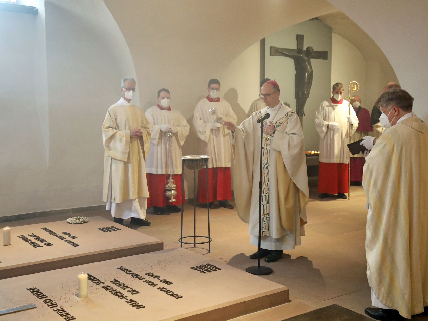 Bei der abschließenden Statio in der Krypta des Kiliansdoms sprach Bischof Jung den Segen über das Grab Bischof Scheeles.