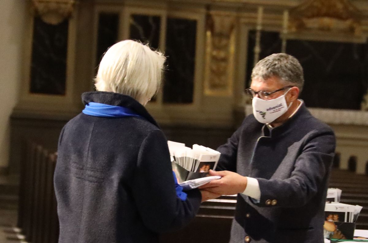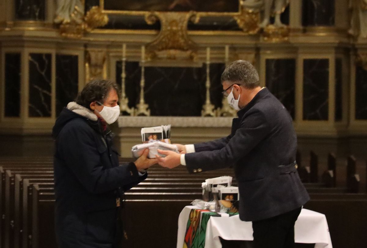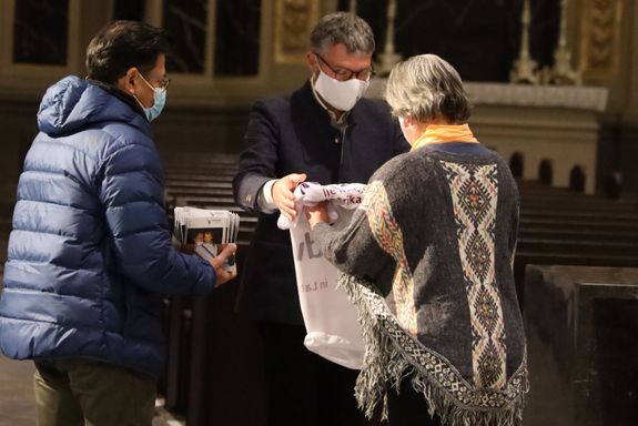 Vertreter der Orte, an denen am ersten Adventssonntag, 29. November, die dezentralen Eröffnungsgottesdienste der bundesweiten Eröffnung der Adveniat-Weihnachtsaktion 2020 stattfinden, erhielten am Ende des Aussendungsgottesdiensts Symbole.