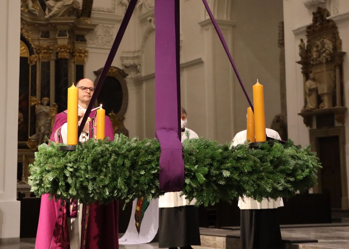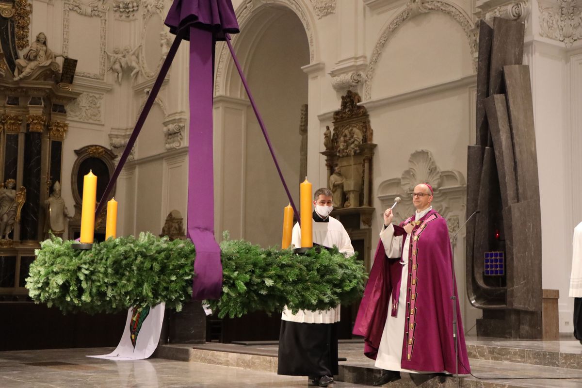 Zu Beginn der Feier segnete der Bischof den Adventskranz und entzündete die erste Kerze.