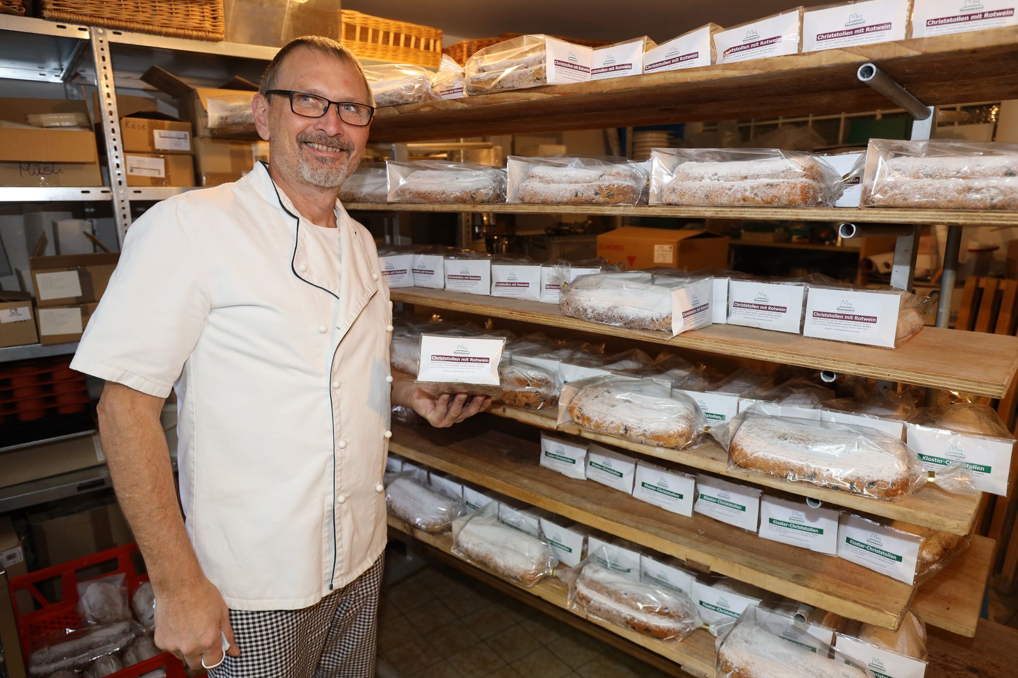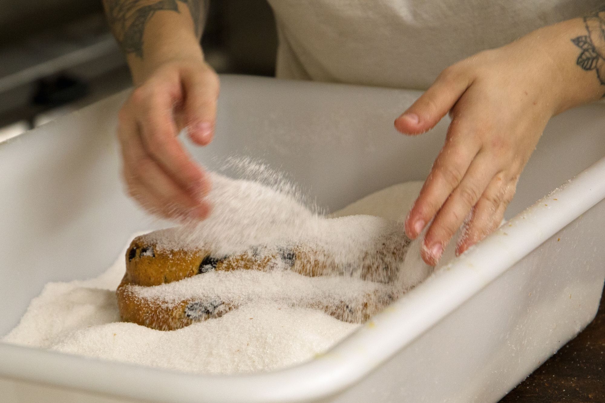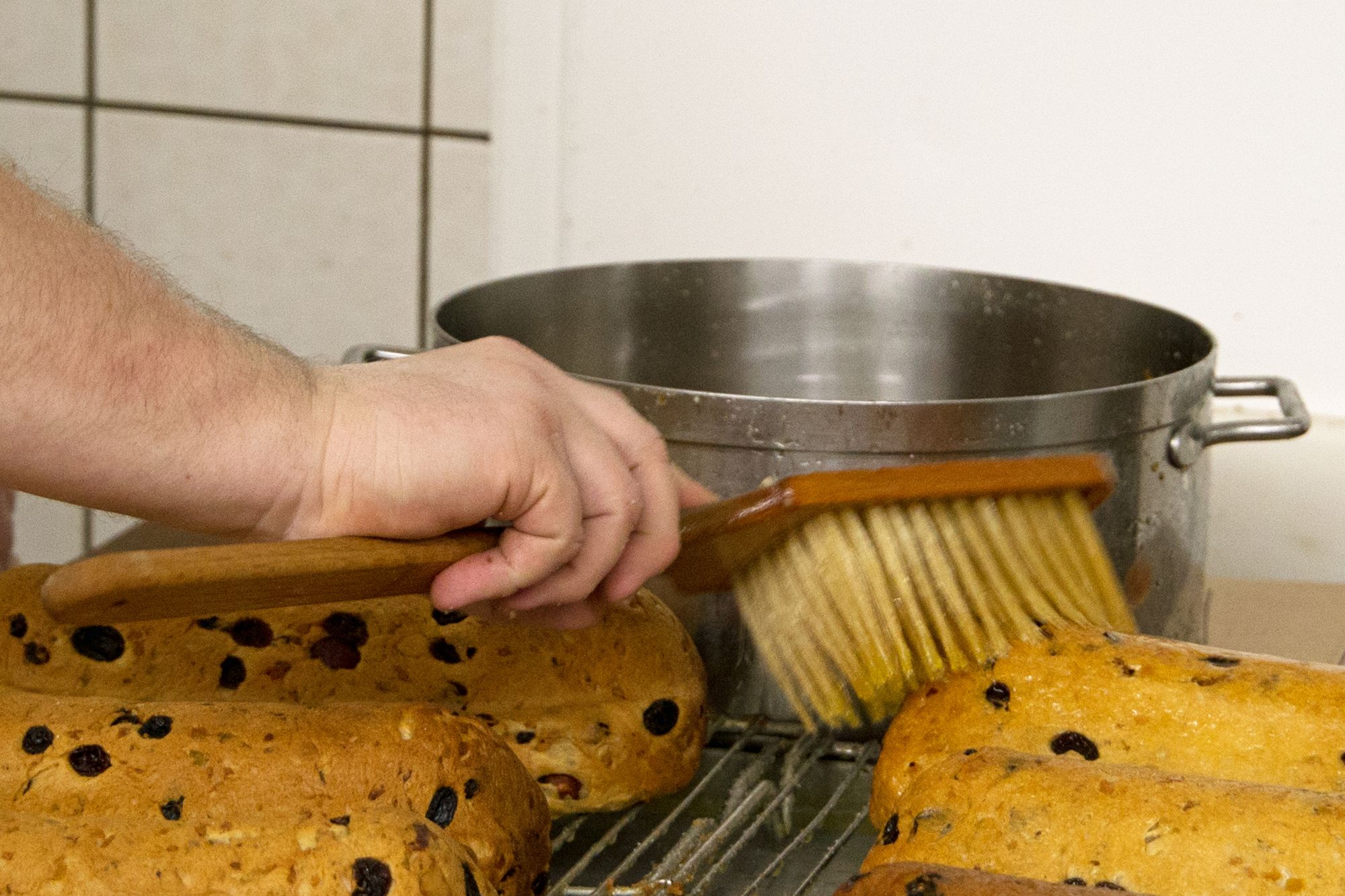 Nach dem Backen werden die noch warmen Stollen mit heißem Butterfett bestrichen und gezuckert. „Butter versiegelt die Oberfläche und verhindert, dass der Stollen austrocknet.“ Erst kurz vor dem Verpacken kommt der Puderzucker auf die Stollen. Mindestens 14 Tage sollte ein fertiger Stollen ruhen, empfiehlt der Bäckermeister. Dann ist er bereit für die adventliche Kaffeetafel. Aber nicht nur für diese. Es sei wichtig, den Geschmack von Lebensmitteln wieder zu entdecken, erklärt Stöckinger und rät: „Man sollte einfach mal experimentieren, zum Beispiel Christstollen mit Rotwein kombinieren.“