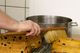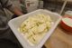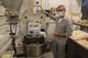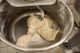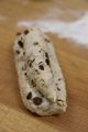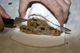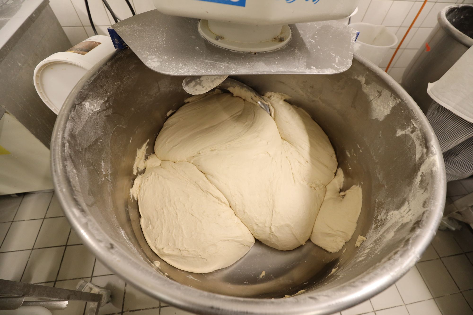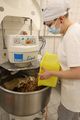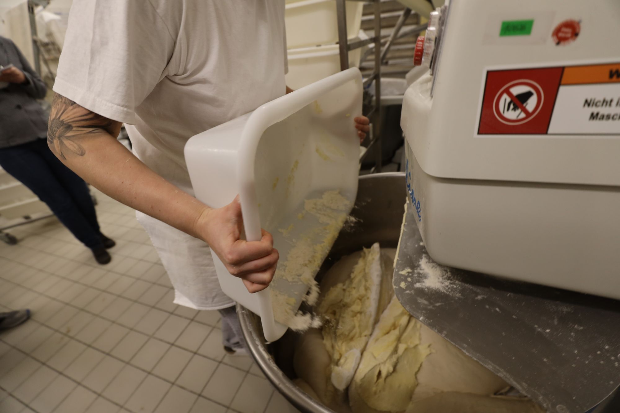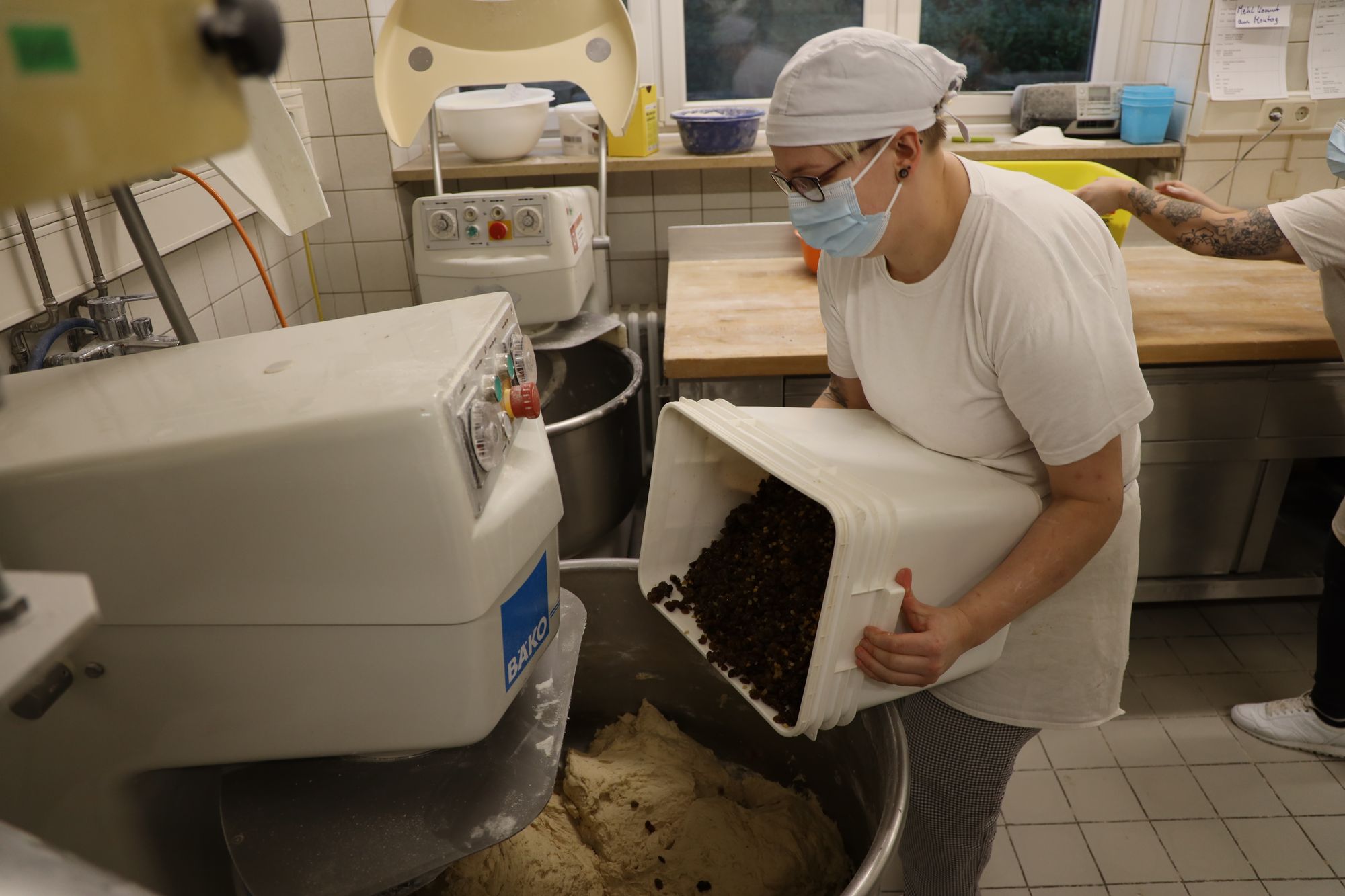 Der Teig ist mittlerweile deutlich gewachsen, muss aber noch eine Weile ruhen. Deshalb gibt es erst einmal einen Kaffee und Stollen. Stöckinger bringt einen Kloster-Christstollen und einen Christstollen mit Rotwein und schneidet von beiden großzügige Scheiben ab. Beide sind lecker. Entgegen unserer Vermutung schmeckt man den Rotwein nicht heraus, aber er gibt dem Stollen eine leicht herbe Note. Aus einem Nachschlag wird leider nichts, denn Sabrina Büchs ruft aus der Backstube: „Wir wären dann mal soweit!“ Der Teig hat sein Volumen vervierfacht, zumindest optisch. „Wir kneten den jetzt komplett fertig“, erklärt Büchs und gibt zunächst die Fettmischung und dann Mehl dazu. Der große Knethaken vermengt alles zu einer kompakten Masse. Früchte und Nüsse werden erst kurz vor Schluss, nach einer weiteren Ruhezeit, hinzugefügt: „Sonst sind sie Matsch.“ Die Idee, ein Rezept abzuluchsen, hat sich angesichts der Mengen, die hier verarbeitet werden, verflüchtigt. Denn das würde wohl so lauten: „Man nehme zehn Kilogramm Vorteig, achteinhalb Kilogramm Mehl, sechs bis sieben Kilogramm Fett…“