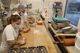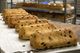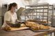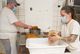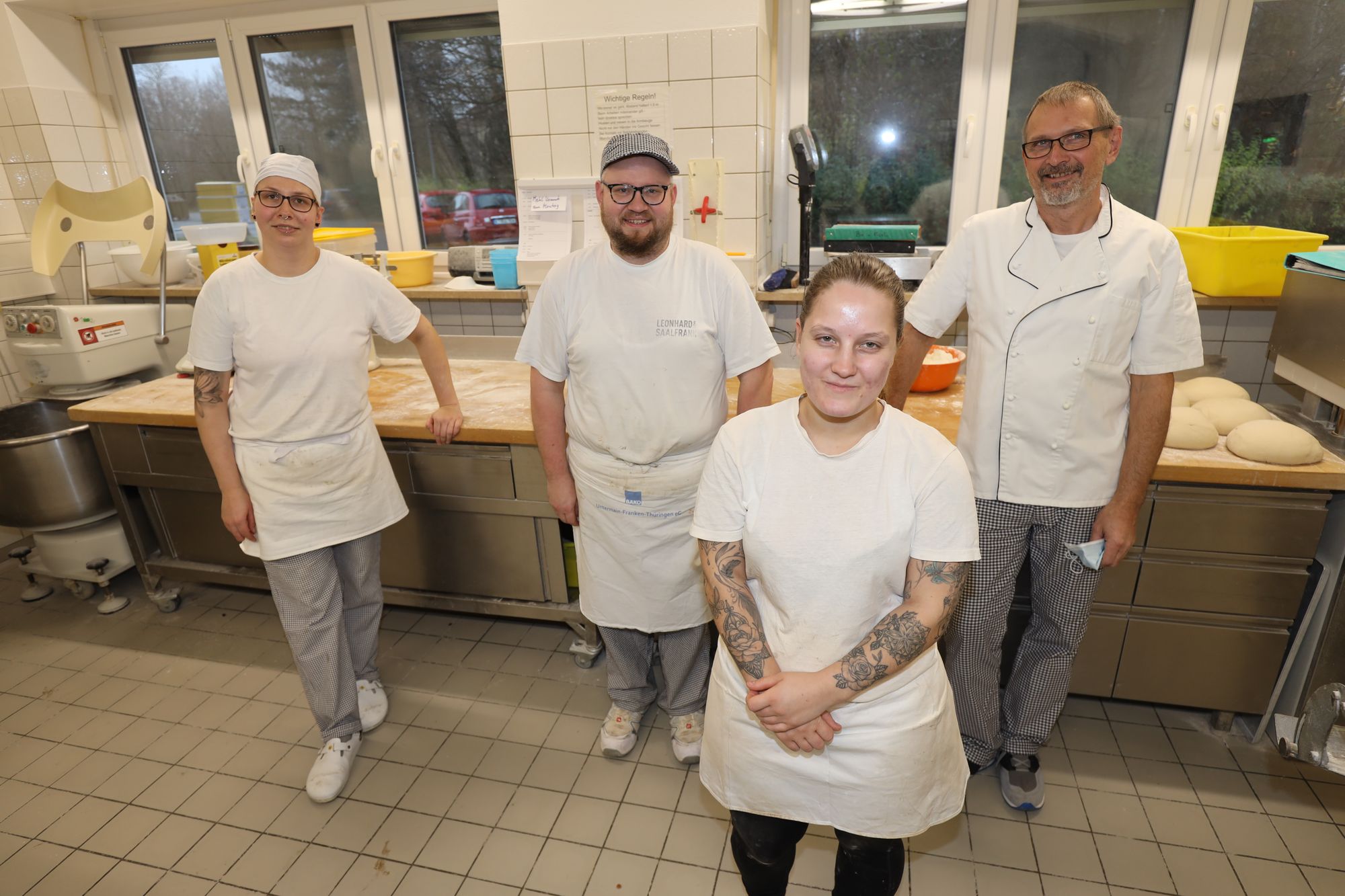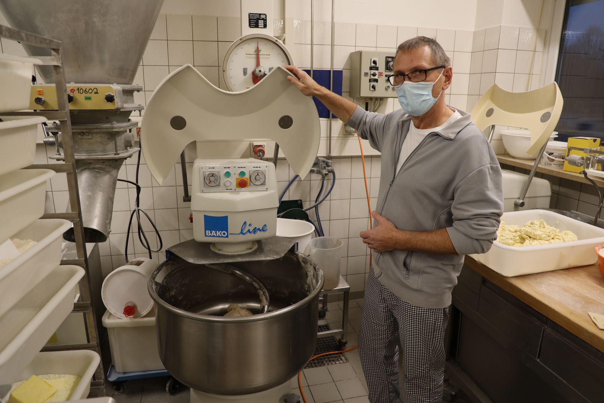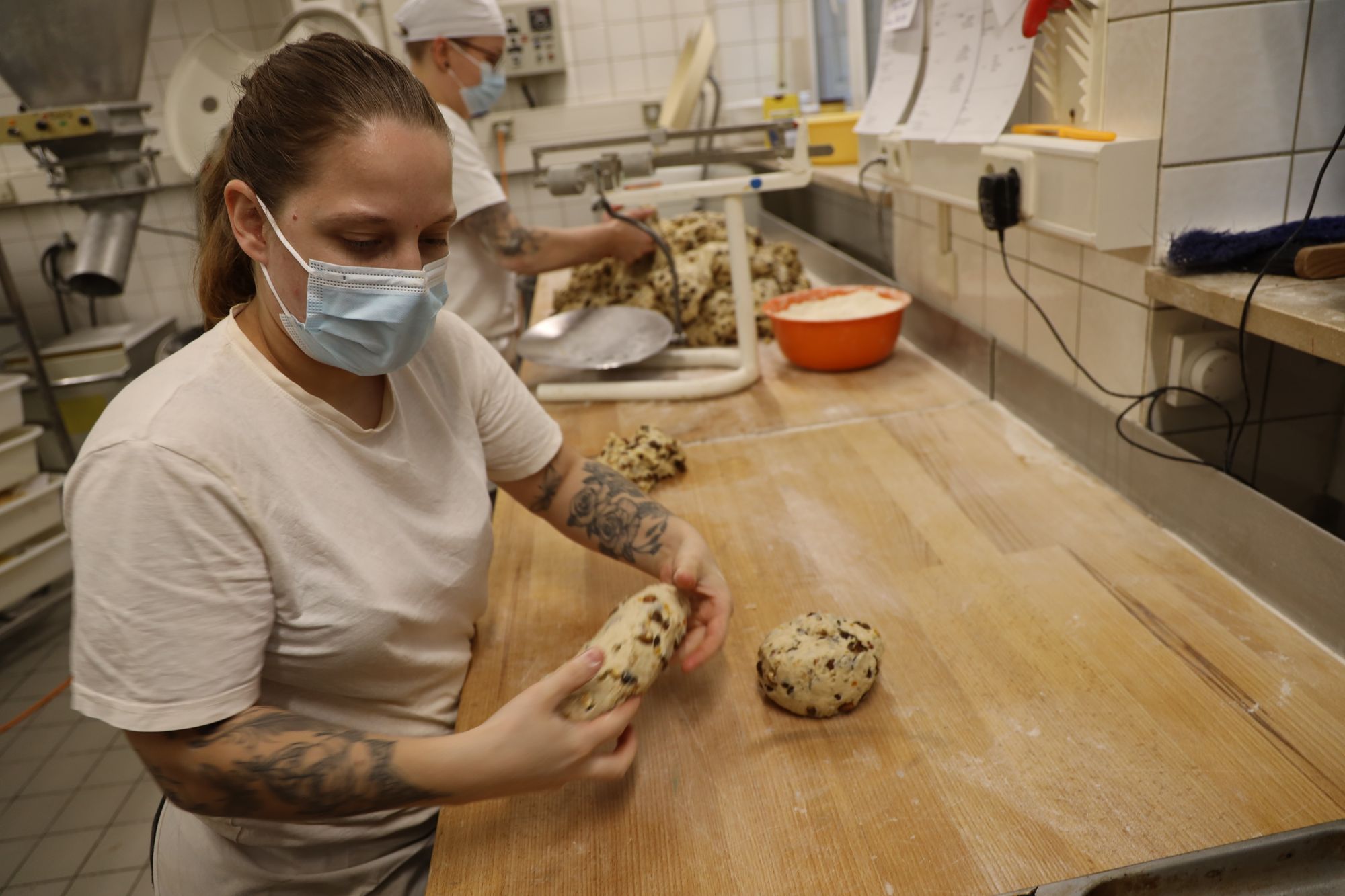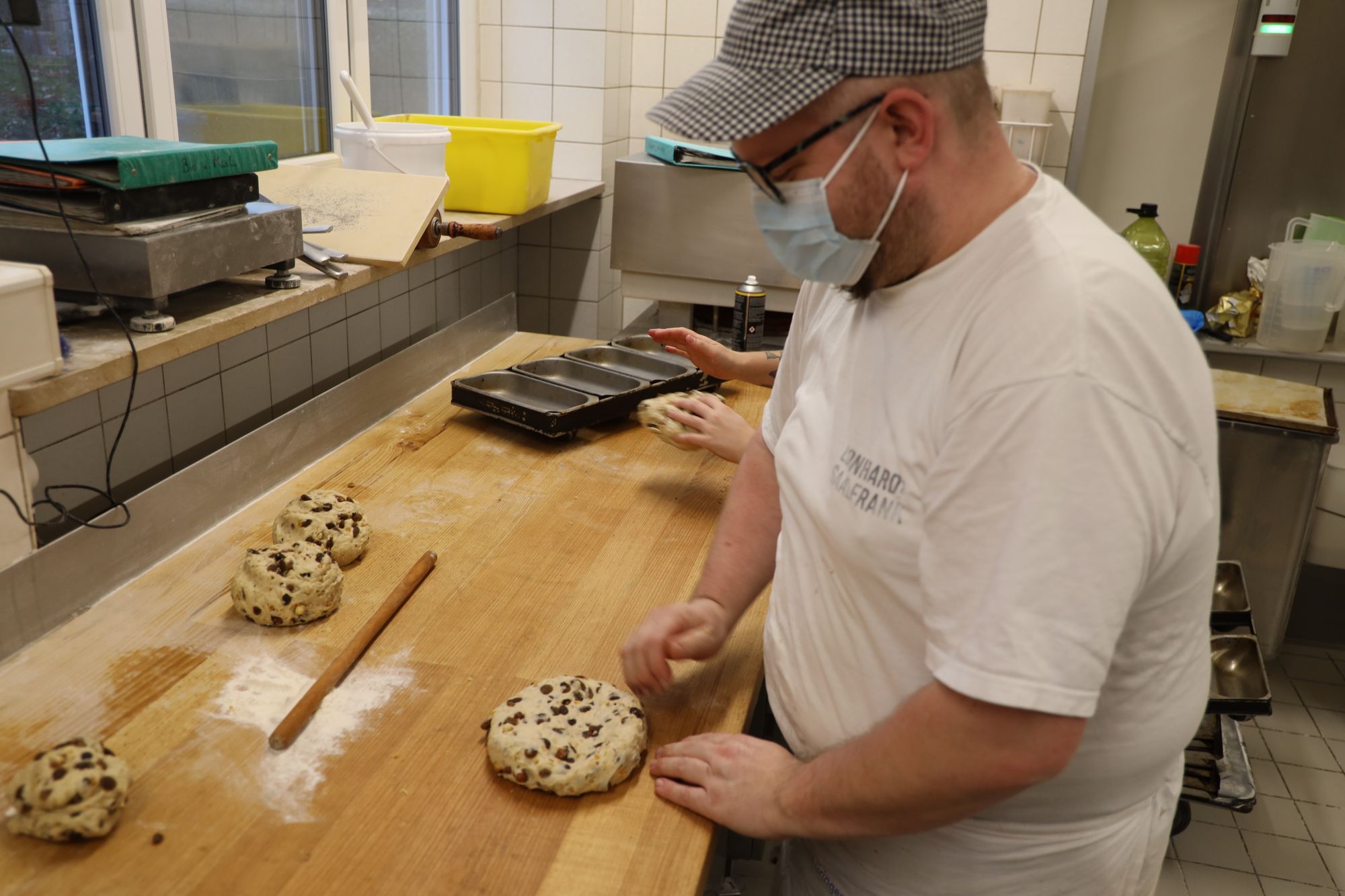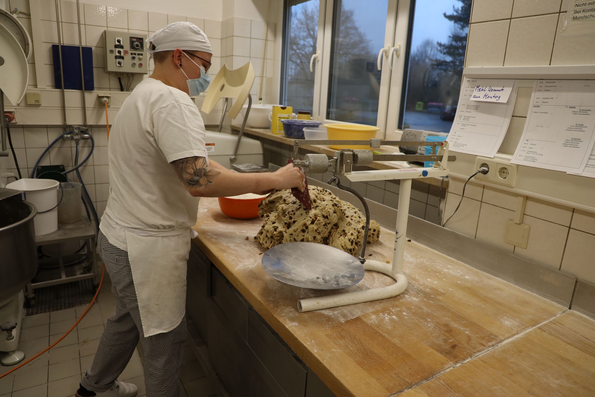 Inzwischen ist der Teig fertig geknetet. Nun ist Teamarbeit gefragt. Sabrina Büchs hebt große Teigstücke heraus, portioniert sie und reicht jeweils zwei Stücke an Andreas Krumm. Der dreht sie sekundenschnell – mit beiden Händen gleichzeitig – zu glatten Kugeln. Lena Lutz formt daraus längliche Laibe, legt sie einzeln in die Vertiefungen einer gefetteten metallenen Stollenform und drückt sie leicht an. Dann kommen sie noch einmal für eine Stunde in einen temperierten Garraum. „Die Stehzeit ist ganz wichtig“, sagt Stöckinger. Während im Teigkneter schon die Zutaten für den nächsten Teig gemischt werden, diesmal für Brötchen, demonstriert Andreas Krumm, wie ein Stollen klassisch mit der Hand geformt wird. Mit den Händen formt er einen kleinen Laib. Dann nimmt er einen Holzstab, walzt damit den Teig in der Mitte aus, drückt eine große und eine kleine Kuhle hinein und schlägt die Seiten übereinander. Das Ganze dauert keine 30 Sekunden. „Die Form entstand in Anlehnung an das Jesuskind, das in eine Windel gewickelt in der Krippe liegt“, erklärt Stöckinger.