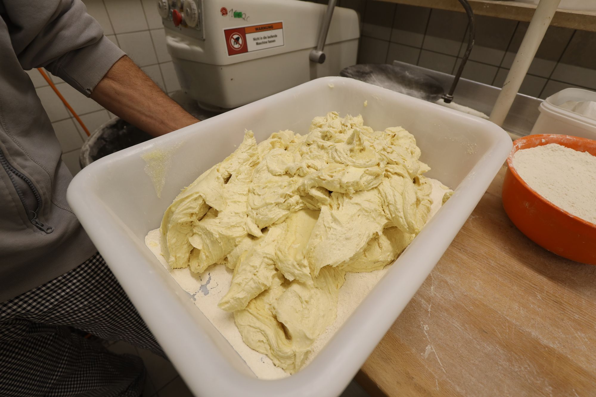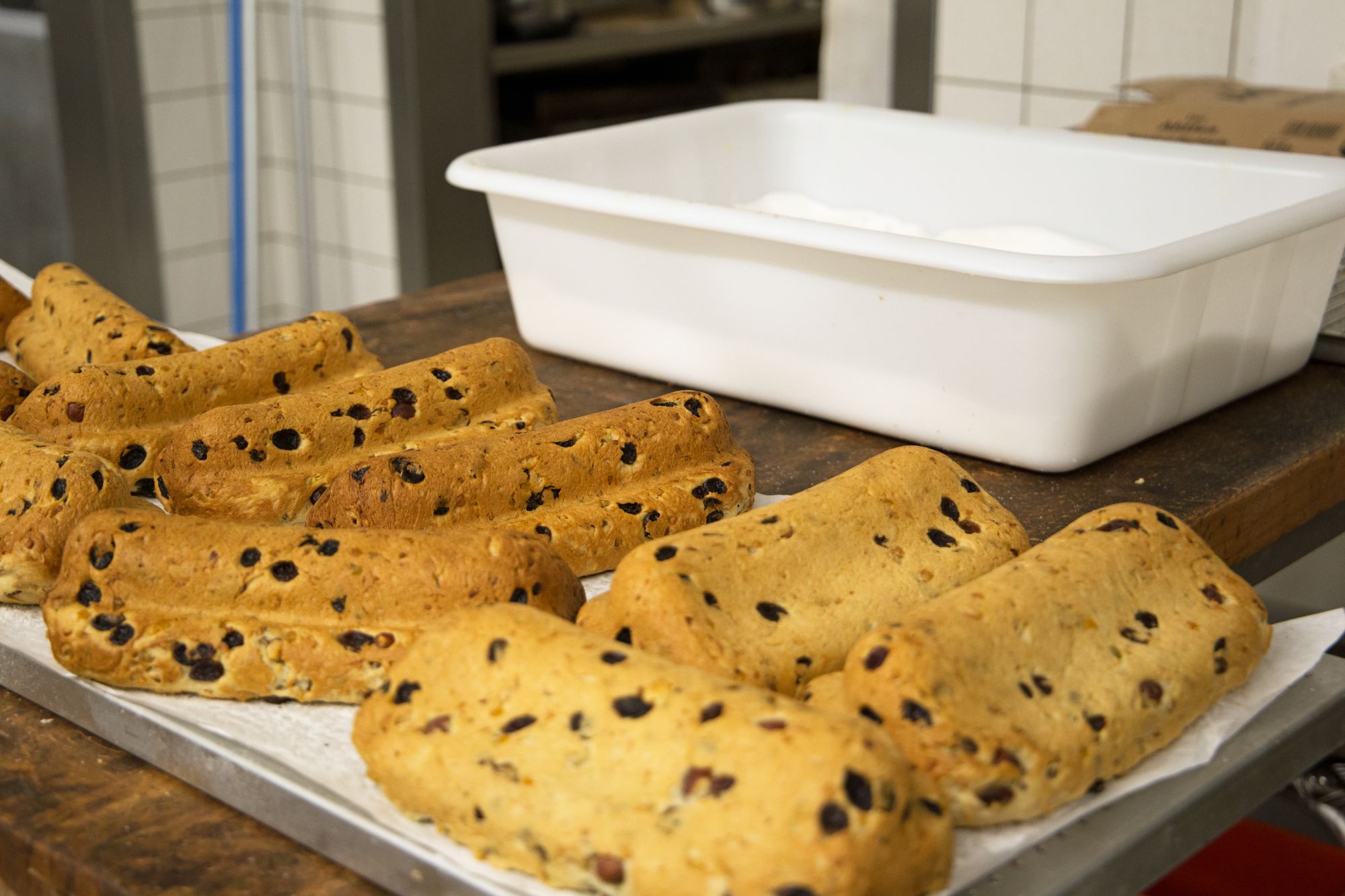 Als wir gefühlt im Morgengrauen in der Backstube ankommen, ist schon längst alles vorbereitet. Für das Backstubenteam hat der Arbeitstag bereits um 3.30 Uhr begonnen. Im Teigkneter wächst eine Mischung aus Mehl, Milch, Wasser und Hefe stetig vor sich hin. Ebenfalls fertig vorbereitet ist die Fettmischung aus Butter, Zucker, Salz und Gewürzen. In zwei großen Behältern warten Rosinen, Orangeat und Zitronat sowie Haselnüsse und Mandeln auf ihren Einsatz. Die Früchte sind in Wasser und Rum eingeweicht, die Nüsse in Milch. „Damit die Nüsse beim Backen keine Feuchtigkeit aus dem Teig ziehen“, erklärt Stöckinger. Beim Lagern der Stollen geben die Zutaten die Flüssigkeit dann wieder an den Teig ab. „Deshalb ist frischer Christstollen meist trockener, als wenn er abgelagert ist.“