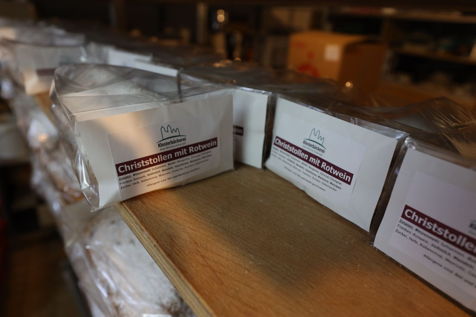 Pro Saison werden insgesamt rund 1000 Stollen in unterschiedlichen Größen gebacken. Neben Kloster-Christstollen und Christstollen mit Rotwein umfasst das Sortiment auch Dinkel-Cranberry-Christstollen und – für alle, die keine Rosinen mögen – Schoko-Stollen. Gebacken wird für den Bäckereiladen auf dem Gelände der Abtei, aber auch für das Egbert-Gymnasium, die Klosterküche und das Gästehaus. Dabei müssen sich die Mitarbeiter auf unterschiedliche Geschmäcker einstellen. „Die Schüler haben andere Ansprüche als die Mönche“, nennt Stöckinger als Beispiel. Etwa 20 bis 30 Prozent der Stollen werden über den Vier-Türme-Onlineshop verkauft, schätzt er. Die Produktion orientiere sich auch an den christlichen Festen. So gibt es in der Weihnachtszeit Stollen und Plätzchen, an Ostern Osterbrot. „Wir halten solche Traditionen aufrecht“, sagt der Bäckermeister, der seit 35 Jahren in der Klosterbäckerei arbeitet. Insgesamt zählt das Team neun Personen: vier in der Produktion, vier im Verkauf und eine Putzkraft.