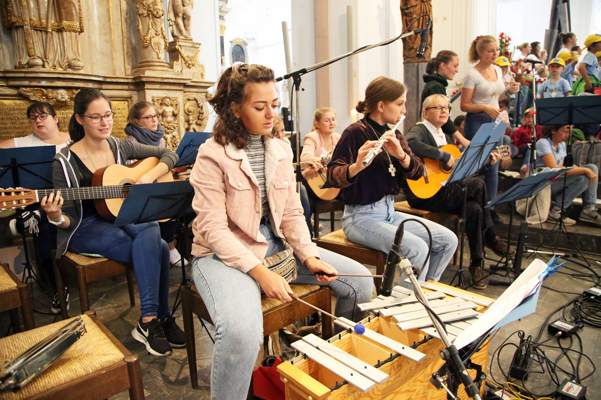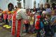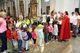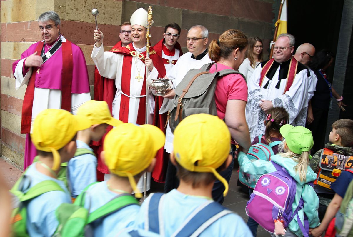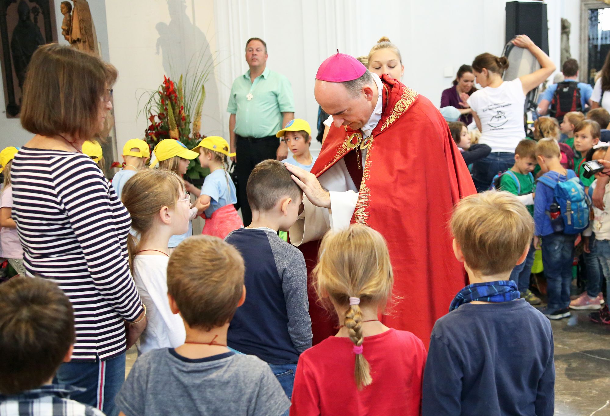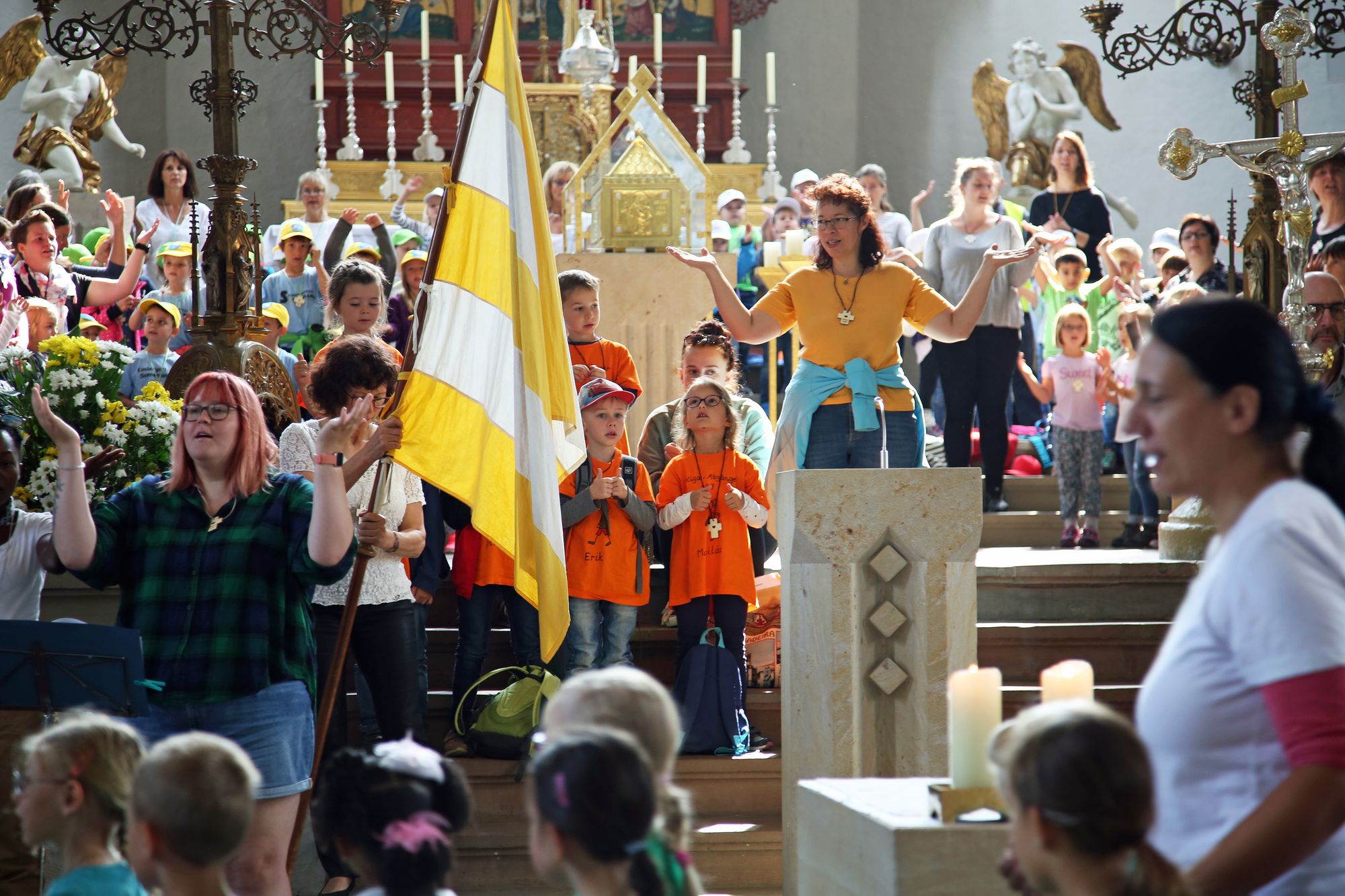 Die Feier endet mit dem gemeinsamen Vaterunser und dem Segenslied „Von oben, von unten“. Anschließend erteilen der Bischof und die anwesenden Priester und Diakone aus den Heimatgemeinden der Kinder den Kleinen einzeln den Segen. Viele Kinder und auch Erwachsene schauen sich den Schrein mit den Häuptern der Frankenapostel Kilian, Kolonat und Totnan ganz genau an. „Kilian, Kolonat und Totnan haben hier den Glauben verkündet“, hatte der Bischof zuvor erklärt. Studenten der Würzburger Fachakademie für Sozialpädagogik Sankt Hildegard begleiten die Statio wie auch die Prozession und die Wort-Gottes-Feier musikalisch.