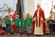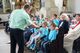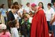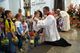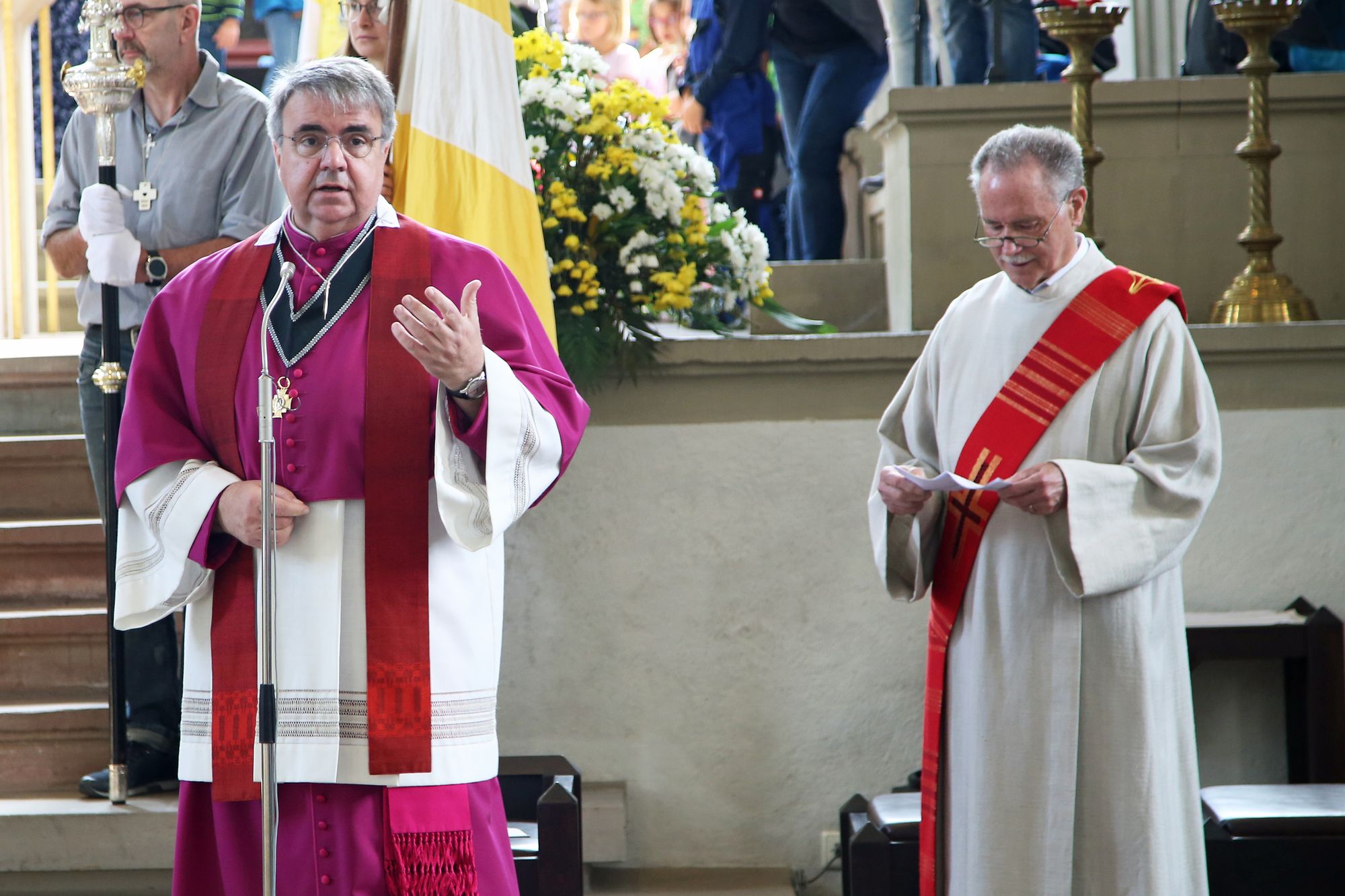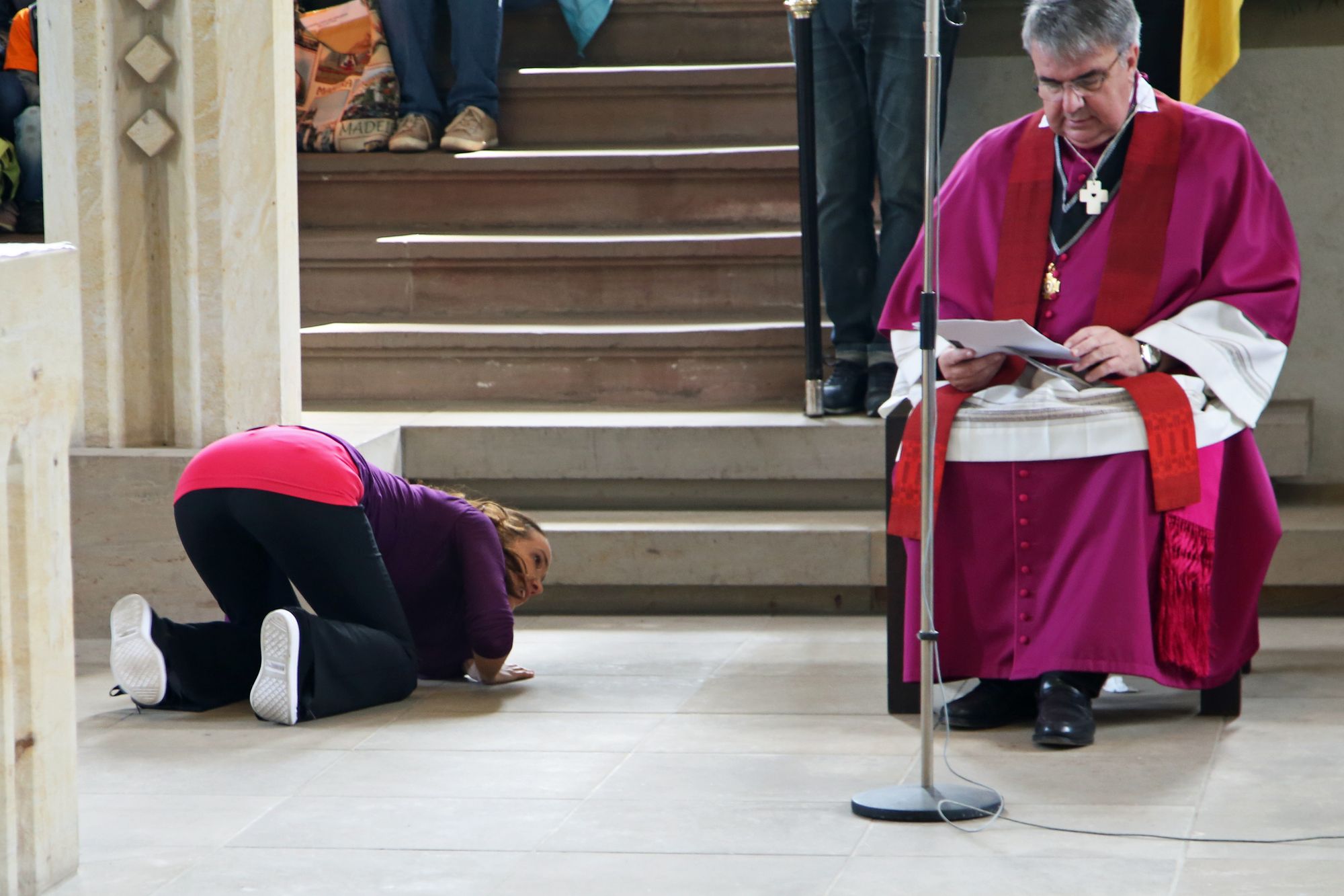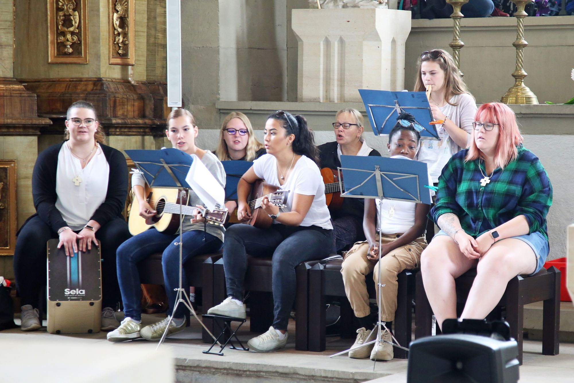 Die Feier endet mit dem gemeinsamen Vaterunser und dem Segenslied „Von oben, von unten“. Anschließend erteilen der Bischof und die anwesenden Priester und Diakone aus den Heimatgemeinden der Kinder den Kleinen einzeln den Segen. Viele Kinder und auch Erwachsene schauen sich den Schrein mit den Häuptern der Frankenapostel Kilian, Kolonat und Totnan ganz genau an. „Kilian, Kolonat und Totnan haben hier den Glauben verkündet“, hatte der Bischof zuvor erklärt. Studenten der Würzburger Fachakademie für Sozialpädagogik Sankt Hildegard begleiten die Statio wie auch die Prozession und die Wort-Gottes-Feier musikalisch.