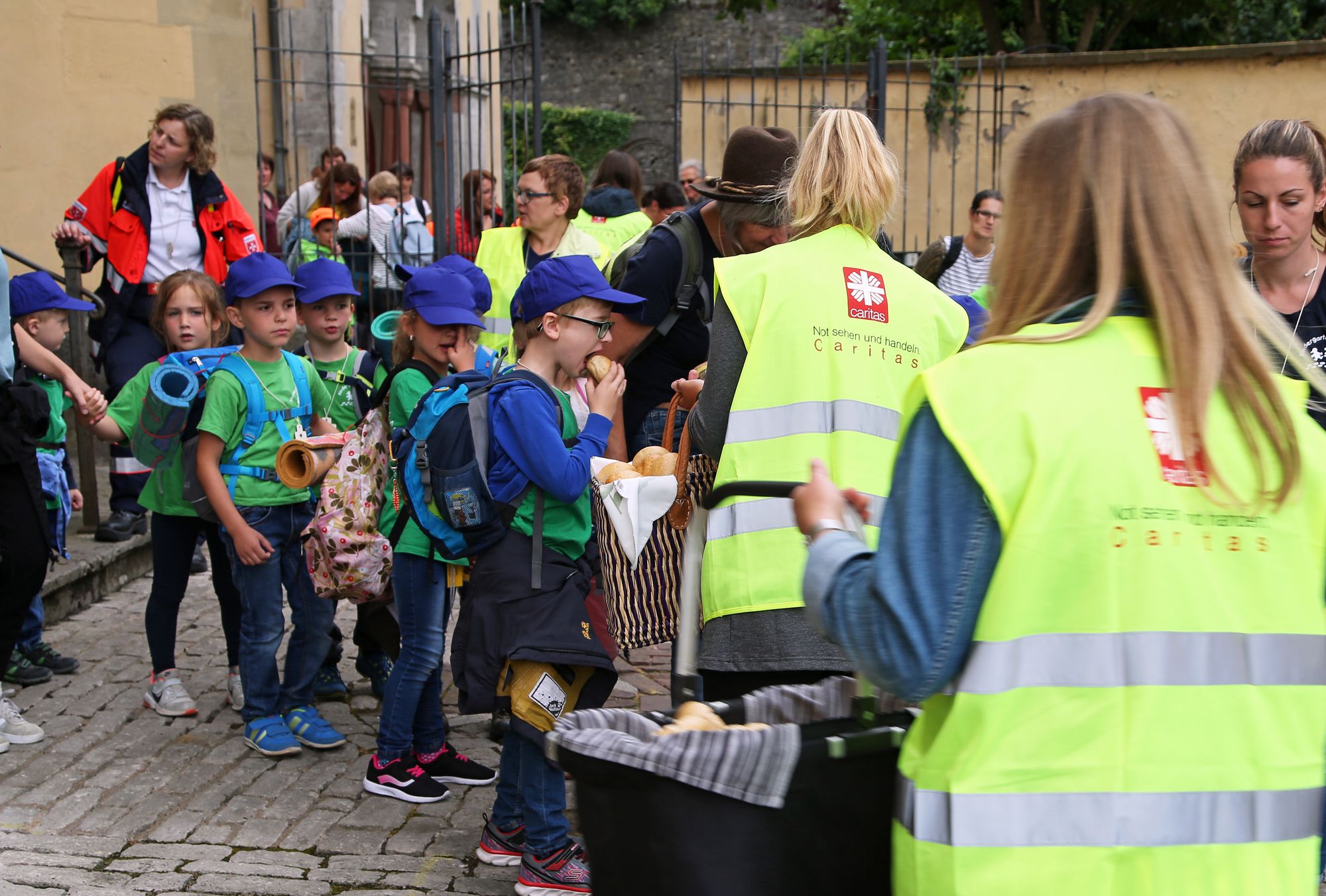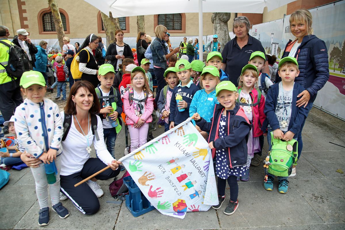 Auf dem Kiliansplatz werden anschließend Lunchpakete und Getränke an die jungen Pilger ausgeteilt. Nach der fast zweistündigen Feier sind alle ein bisschen müde. „Wir haben alle Lieder mitgemacht“, rufen die Kinder vom Kindergarten „Zwergenhöhle“ in Himmelstadt. Ein Junge staunt immer noch über die lange Prozession: „Ich habe alle gesehen, die hinter uns gelaufen sind.“ Das Singen und das Busfahren fanden die Kindergartenkinder aus Binsfeld besonders toll. „Der Keller!“, sagt ein Junge aus dem Kindergarten Sankt Josef in Eußenheim spontan auf die Frage, was denn besonders toll gewesen sei. Man habe den Kindern nach der Wort-Gottes-Feier auch die Bischofsgräber in der Krypta gezeigt, erklärt eine Begleiterin.