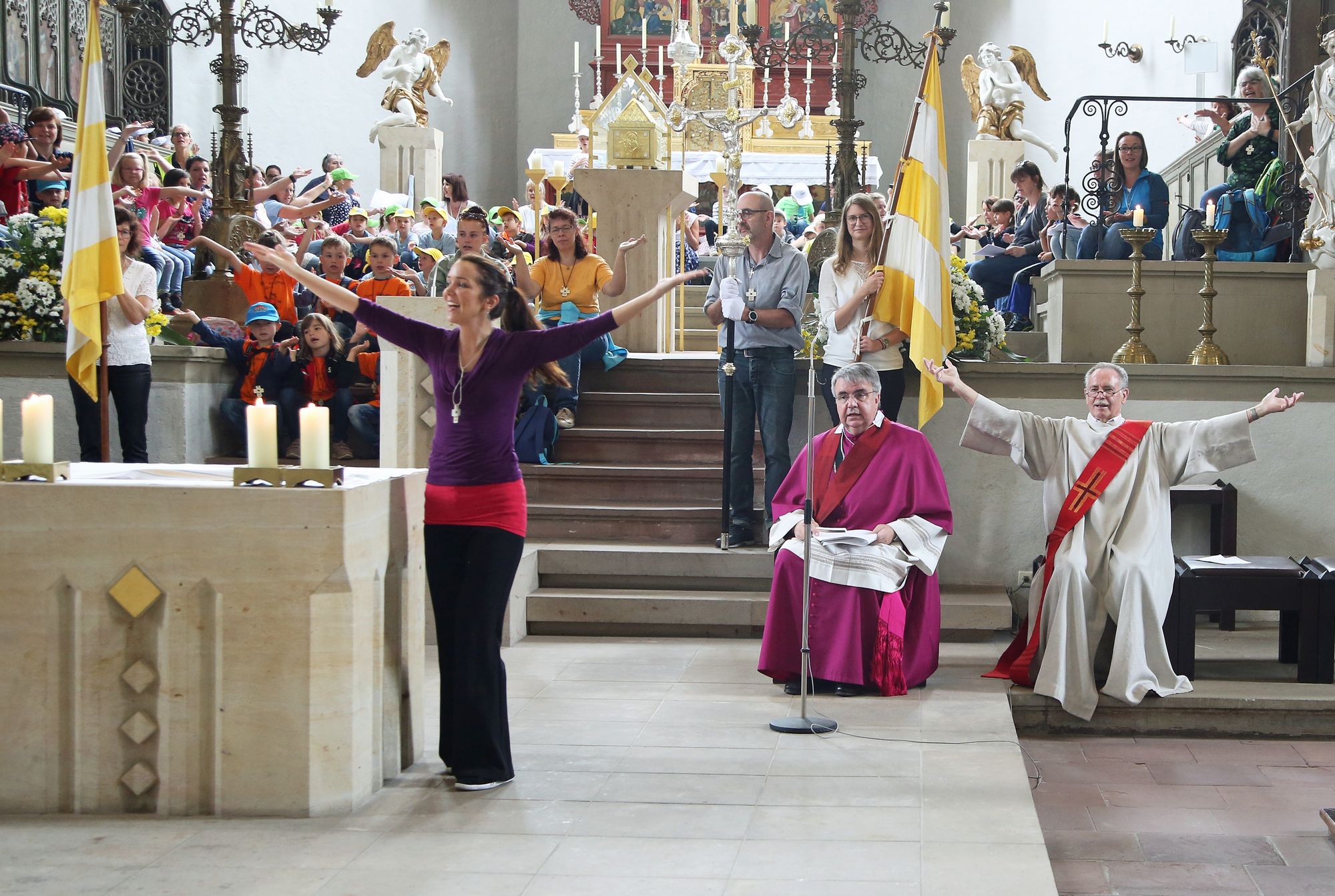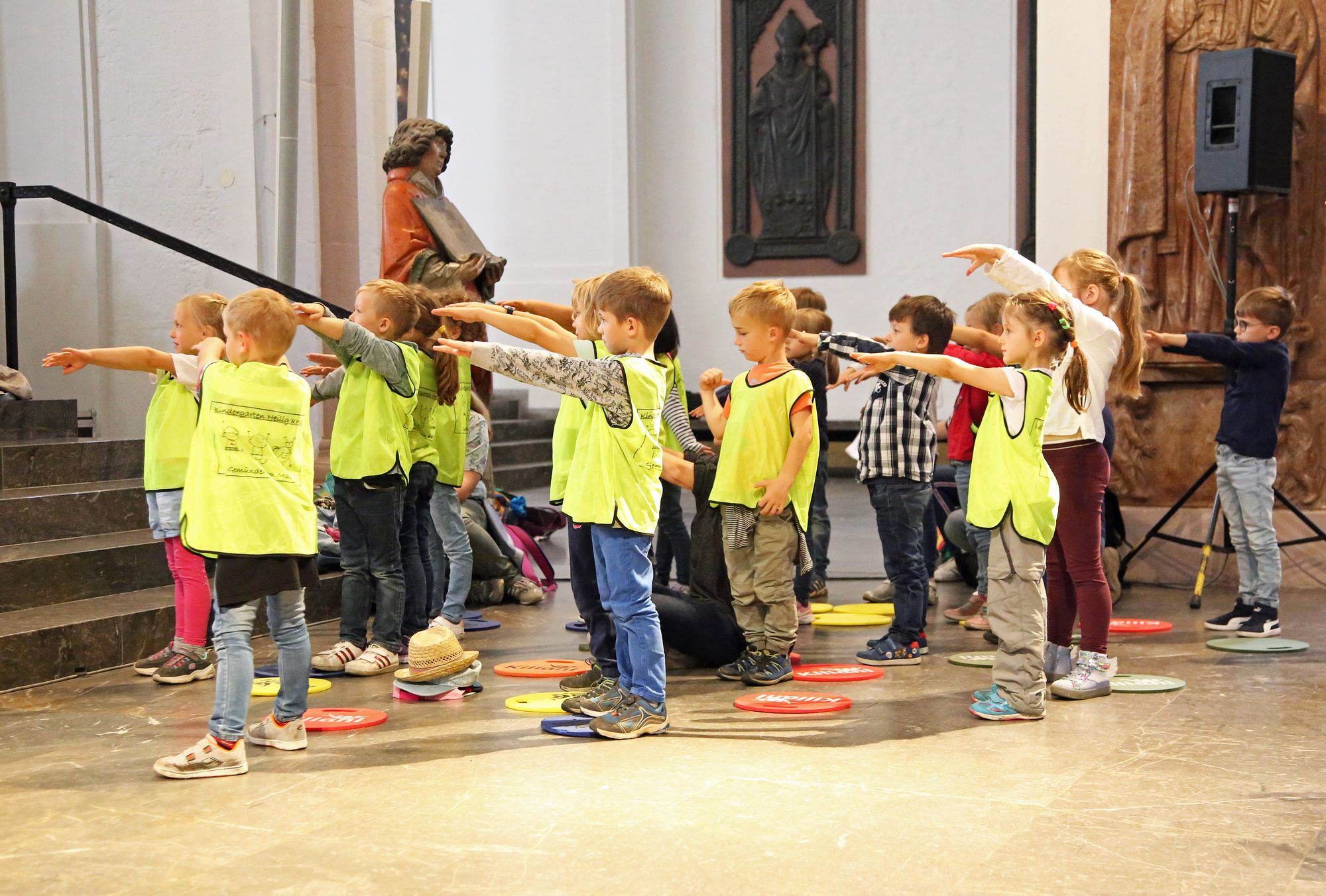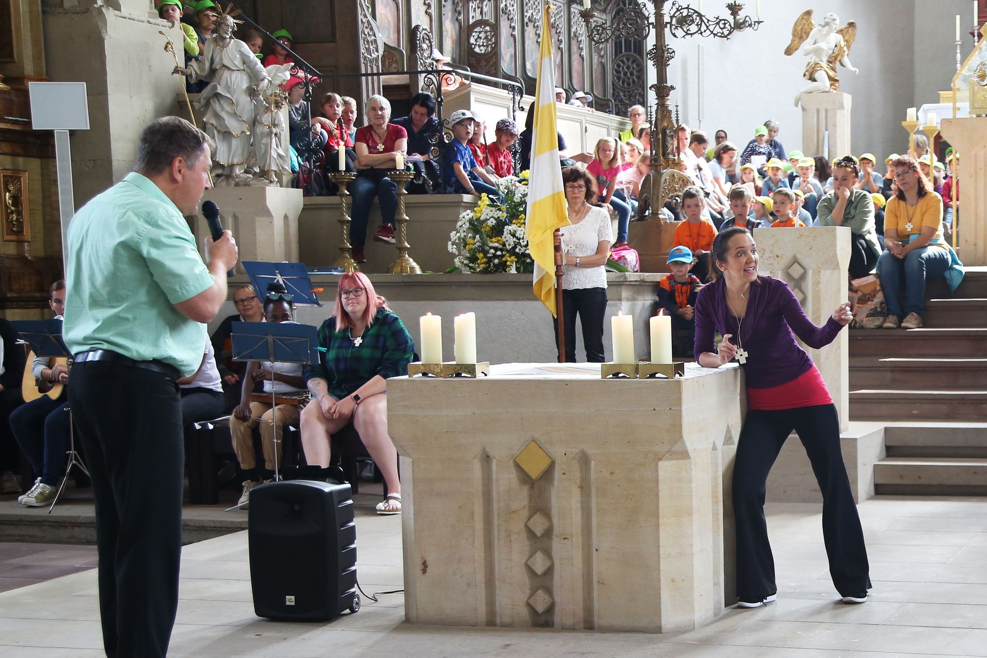 Die Feier beginnt in der Pfarrkirche Sankt Burkard auf der anderen Mainseite. „Das ist ein starkes Zeichen“, staunt Domkapitular Clemens Bieber angesichts der vielen Kinder. In dieser Woche kämen ganz viele Menschen nach Würzburg, weil sie einen besonderen Menschen im Blick hätten – den heiligen Kilian, erzählt er ihnen. Kilian habe Mut und Unternehmensgeist gehabt. „Ihm haben wir es zu verdanken, dass wir die Frohe Botschaft von Jesus erfahren haben. Wenn heute so viele Menschen in der Kiliani-Woche nach Würzburg kommen, dann ist das ein deutliches Zeichen, dass sie ihm dankbar sind für die Botschaft, die er uns gebracht hat.“ Dann machen sich Liturgiereferentin Ruth Weisel und Pastoralreferent Alexander Wolf gemeinsam mit den Kindern auf die Suche nach einem Schatz. Allerdings weiß niemand, wie der eigentlich aussehen soll. „Seit einer Woche komme ich schon hierher und suche“, sagt Weisel. Sie guckt auf dem Altar, in allen Gängen und sogar unter den Bänken. „Vielleicht müssen wir in uns selber suchen?“, schlägt Wolf vor. Gemeinsam fragen sie die Kinder, was diese richtig gut können, und bekommen sofort viele Antworten: „Bulldog fahren!“ „Singen!“ „Tanzen!“ „Jeder von Euch hat eine besondere Fähigkeit, eine besondere Stärke, darauf könnt Ihr stolz sein“, ruft Wolf den Kindern zu. Dann singen alle gemeinsam „Hast Du schon entdeckt, was in Dir steckt, es ist ein großer Schatz, der hat in allen Platz.“