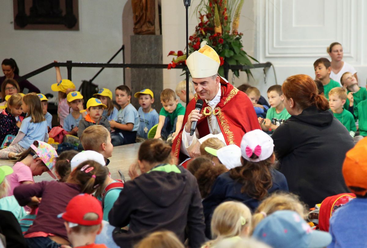 Würzburg (POW) „Es ist schön, dass Ihr heute alle in den Dom gekommen seid.“ Rund 600 Kinder und ihre Begleiter begrüßt Bischof Dr. Franz Jung am Kiliani-Tag der Kindergärten am Freitag, 12. Juli, im Kiliansdom. Sie kommen in diesem Jahr aus der Region Main-Spessart. In der Wort-Gottes-Feier wie auch zuvor bei der Statio in der Pfarrkirche Sankt Burkard machen sich alle gemeinsam auf die Suche nach einem unsichtbaren Schatz. Dabei entdecken sie viele Fähigkeiten und Talente, die in ihnen stecken. Bei der Geschichte von David und dem Riesen Goliath erfahren sie, warum Gott die Kleinen gern hat und ihnen hilft.