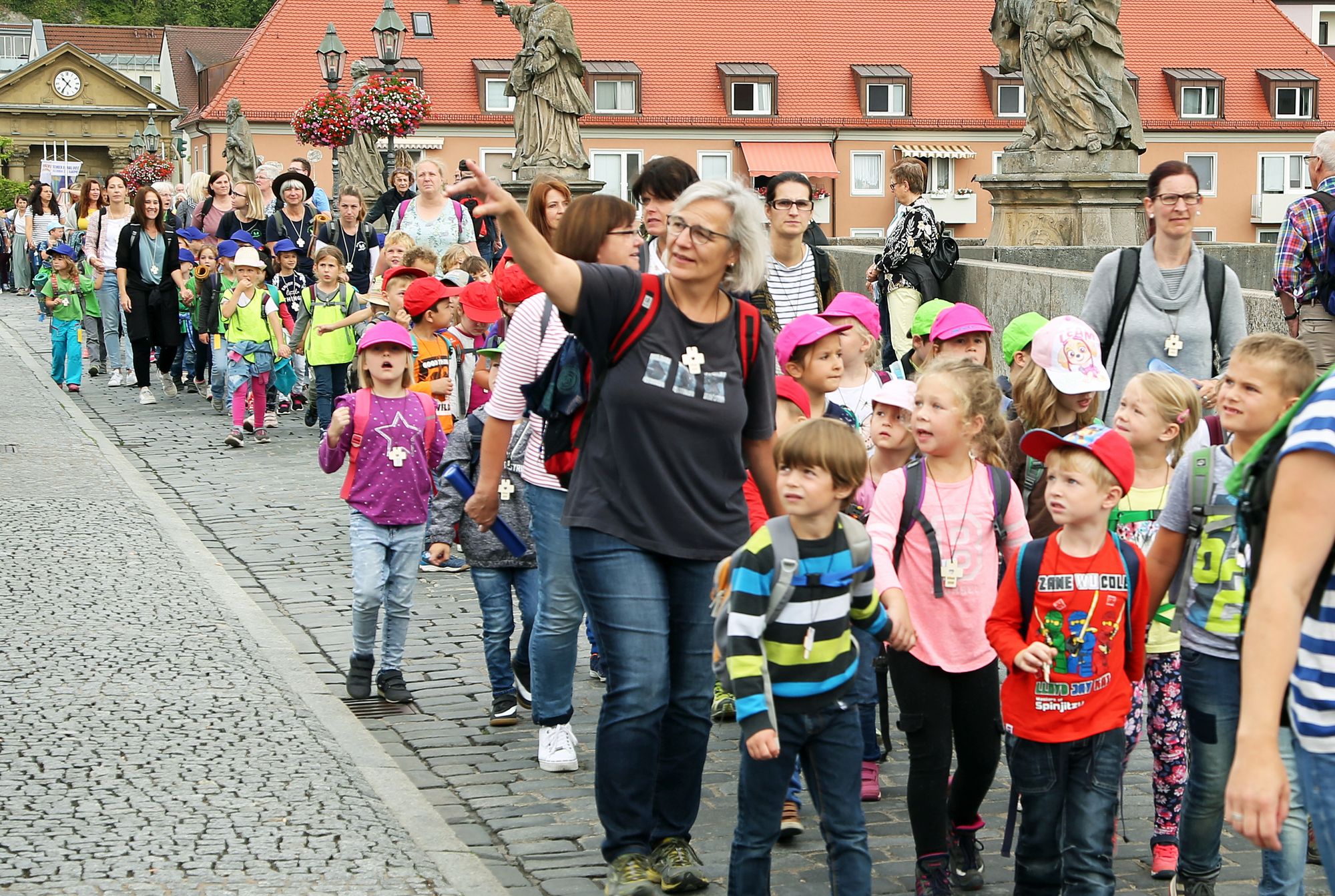 Auf dem Weg von der Pfarrkirche über die Alte Mainbrücke zum Dom überreichen Helfer den kleinen Wallfahrern Brötchen zur Stärkung. Bischof Jung empfängt die Kinder und ihre Begleiter an der Pforte zum Dom und besprengt sie mit Weihwasser. Fast zehn Minuten dauert es, bis die letzte Gruppe ihren Platz gefunden hat. Die Wort-Gottes-Feier ist auf das junge Publikum zugeschnitten. Weisel und Wolf erzählen die Geschichte von David und Goliath so, dass die Kinder sie mitspielen können. Sie gucken sich ganz genau den Dom an, so wie der Hirtenjunge David gut aufpasst, was um seine Herde herum passiert. Als der große böse Goliath kommt, holen alle tief Luft und schreien einen lauten Kampfschrei. Und als David sich mit seiner Steinschleuder vor den Riesen stellt, stellen sich auch die Kinder aufrecht hin und springen in die Luft. „David glaubt ganz fest an sich, und mit Gottes Hilfe ist er mutig und stark genug“, sagt Weisel. So habe er Goliath besiegen können. „Jeder von Euch kann so stark sein.“