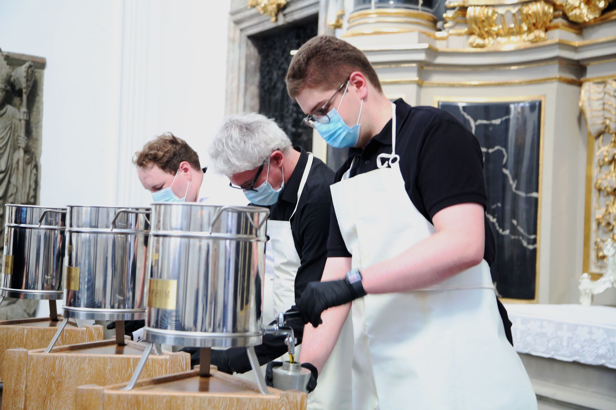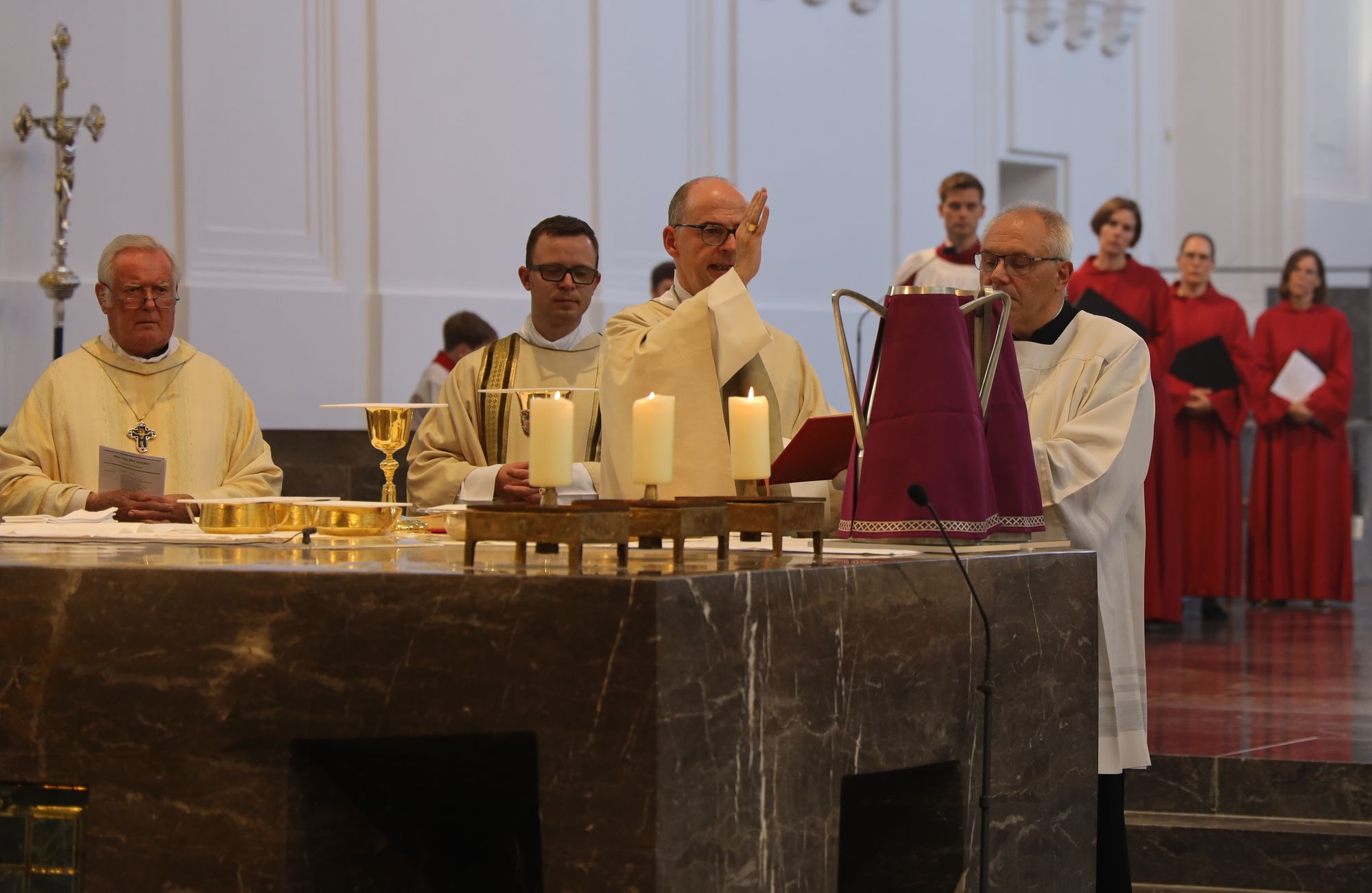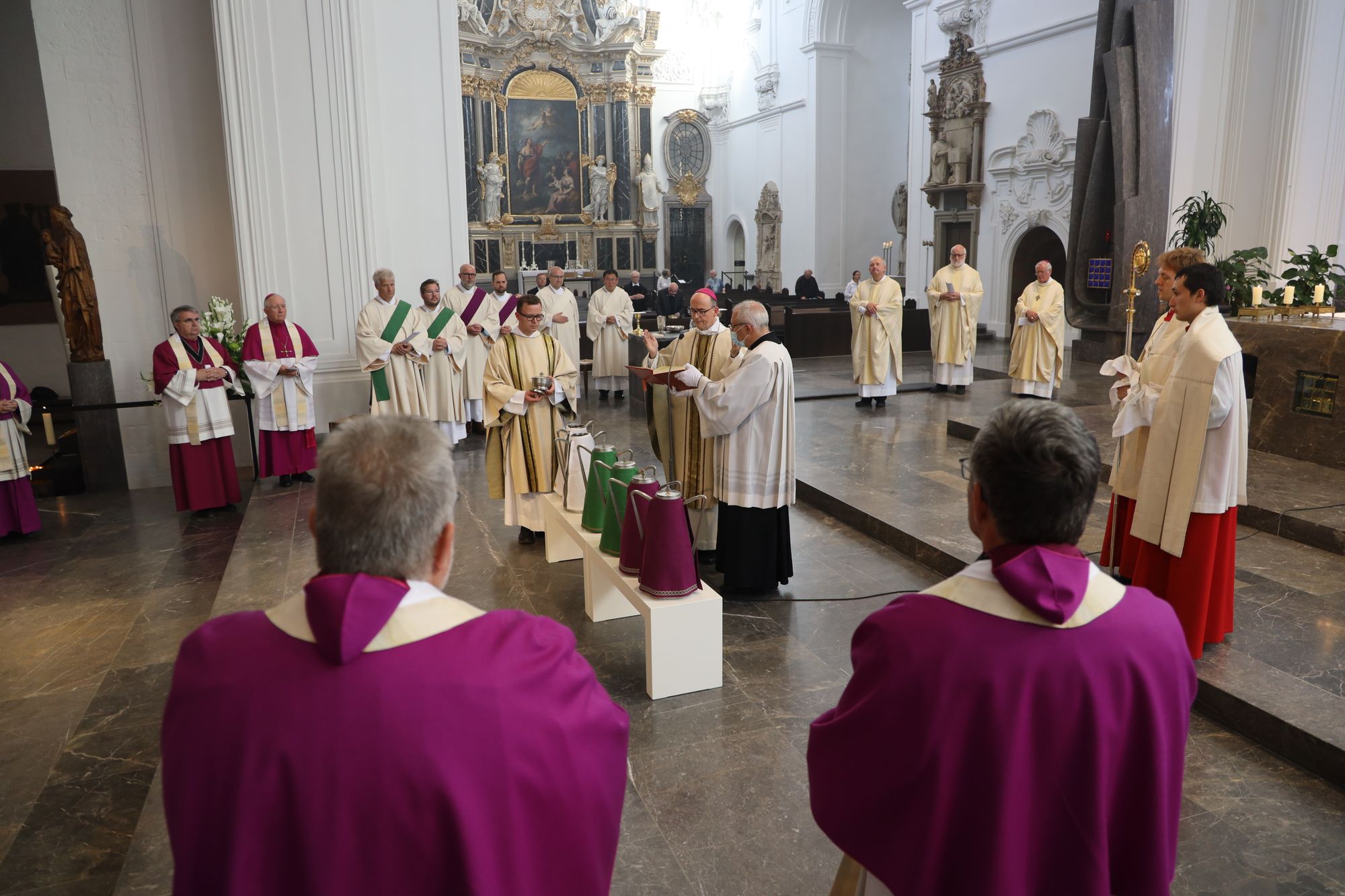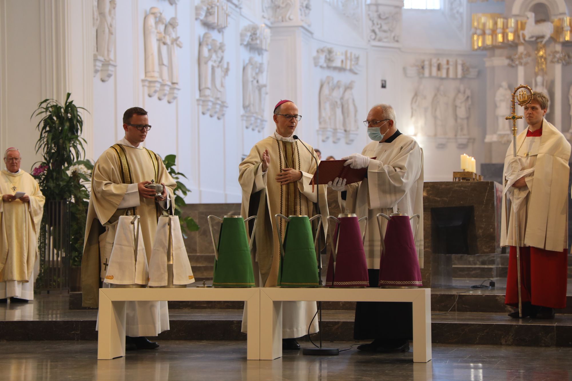 Würzburg (POW) Bischof Dr. Franz Jung hat am Dienstagnachmittag, 8. September die Heiligen Öle für alle 156 Pfarreiengemeinschaften und 17 großen Einzelpfarreien im Bistum Würzburg im Würzburger Kiliansdom geweiht: das Katechumenenöl für die Salbung der Taufbewerber, das Chrisamöl für Taufe, Firmung, Priester- und Bischofsweihe sowie für die Weihe von Kirchen und Altären, das Krankenöl für die Krankensalbung. Die Priester und Diakone erneuerten im Gottesdienst ihr Weiheversprechen. Wegen der Coronapandemie konnte der Gottesdienst nicht wie sonst üblich in der Karwoche gefeiert werden.