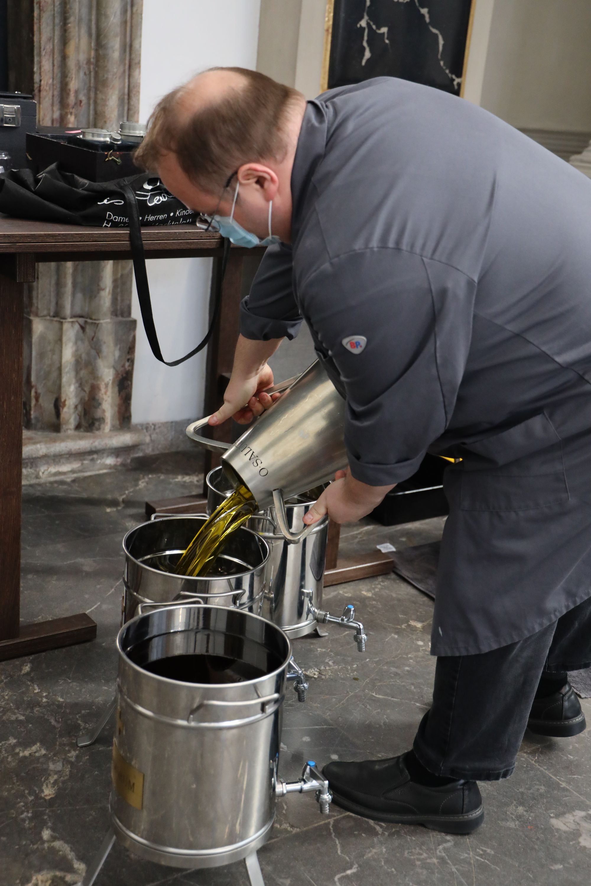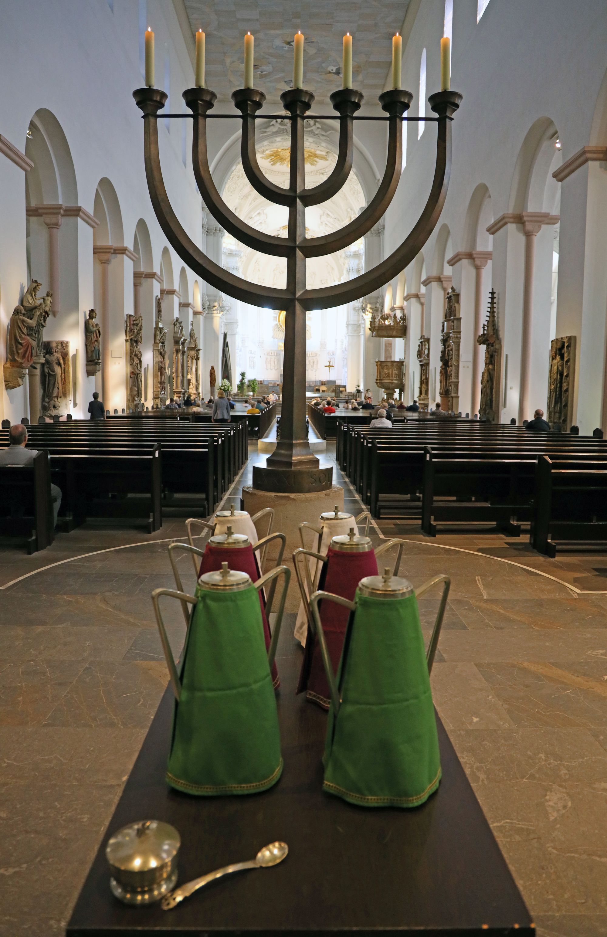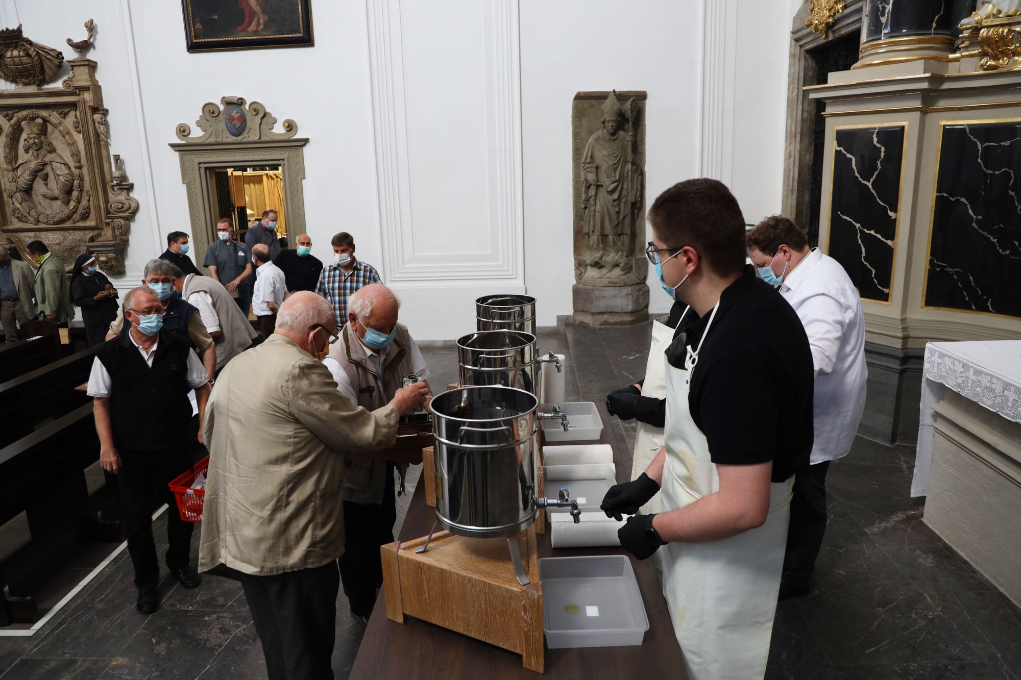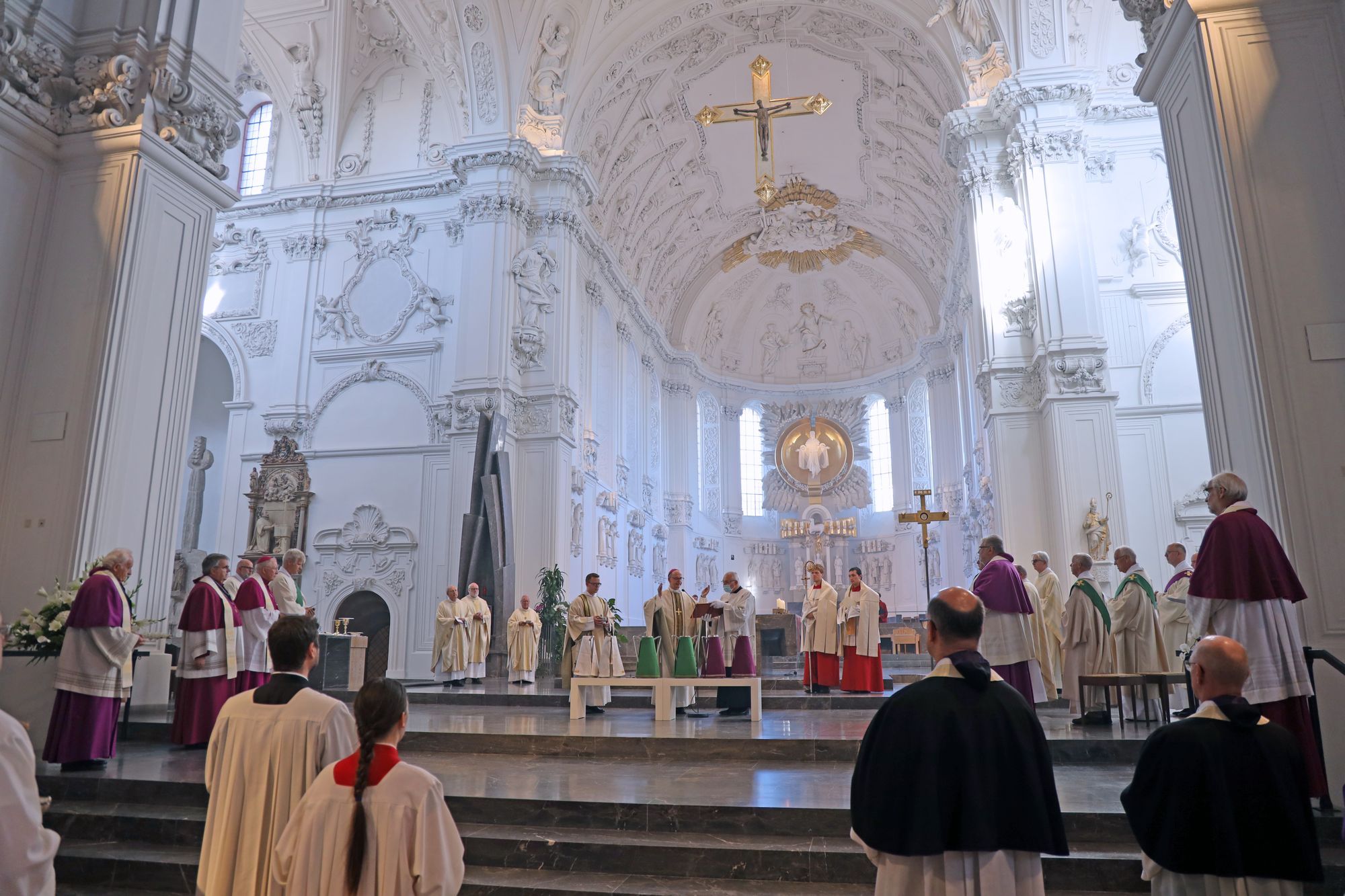 Würzburg (POW) Bischof Dr. Franz Jung hat am Dienstagnachmittag, 8. September die Heiligen Öle für alle 156 Pfarreiengemeinschaften und 17 großen Einzelpfarreien im Bistum Würzburg im Würzburger Kiliansdom geweiht: das Katechumenenöl für die Salbung der Taufbewerber, das Chrisamöl für Taufe, Firmung, Priester- und Bischofsweihe sowie für die Weihe von Kirchen und Altären, das Krankenöl für die Krankensalbung. Die Priester und Diakone erneuerten im Gottesdienst ihr Weiheversprechen. Wegen der Coronapandemie konnte der Gottesdienst nicht wie sonst üblich in der Karwoche gefeiert werden.