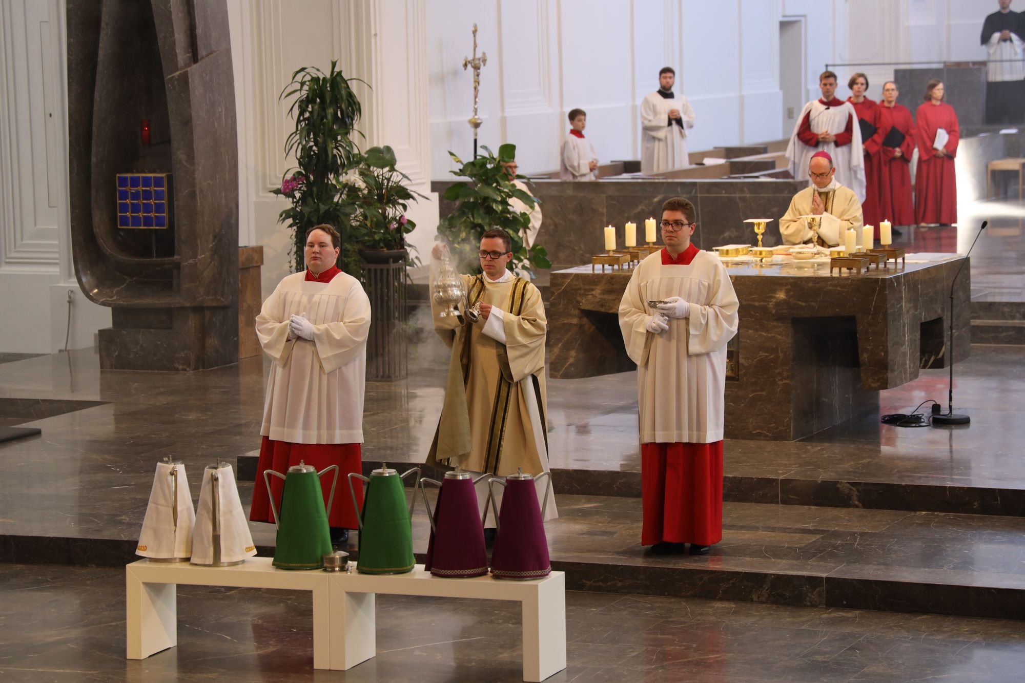 Das Katechumenenöl stehe dafür, dass die Christen nie fertig seien auf ihrem Berufungsweg, sondern eingeladen werden vom Herrn, freudig im Glauben zu wachsen. „Das Chrisamöl erinnert uns an unsere Würde und an die Freude, in der Nachfolge Christi, des Gesalbten, dem Gottesvolk dienen zu dürfen.“ Das Krankenöl steht nach den Worten des Bischofs für die Erinnerung an die eigene Bedürftigkeit und Armut. „Es lehrt uns Demut und zugleich die Freude, weil der Herr in unserer menschlichen Schwachheit seine göttliche Kraft zur Vollendung bringt.“