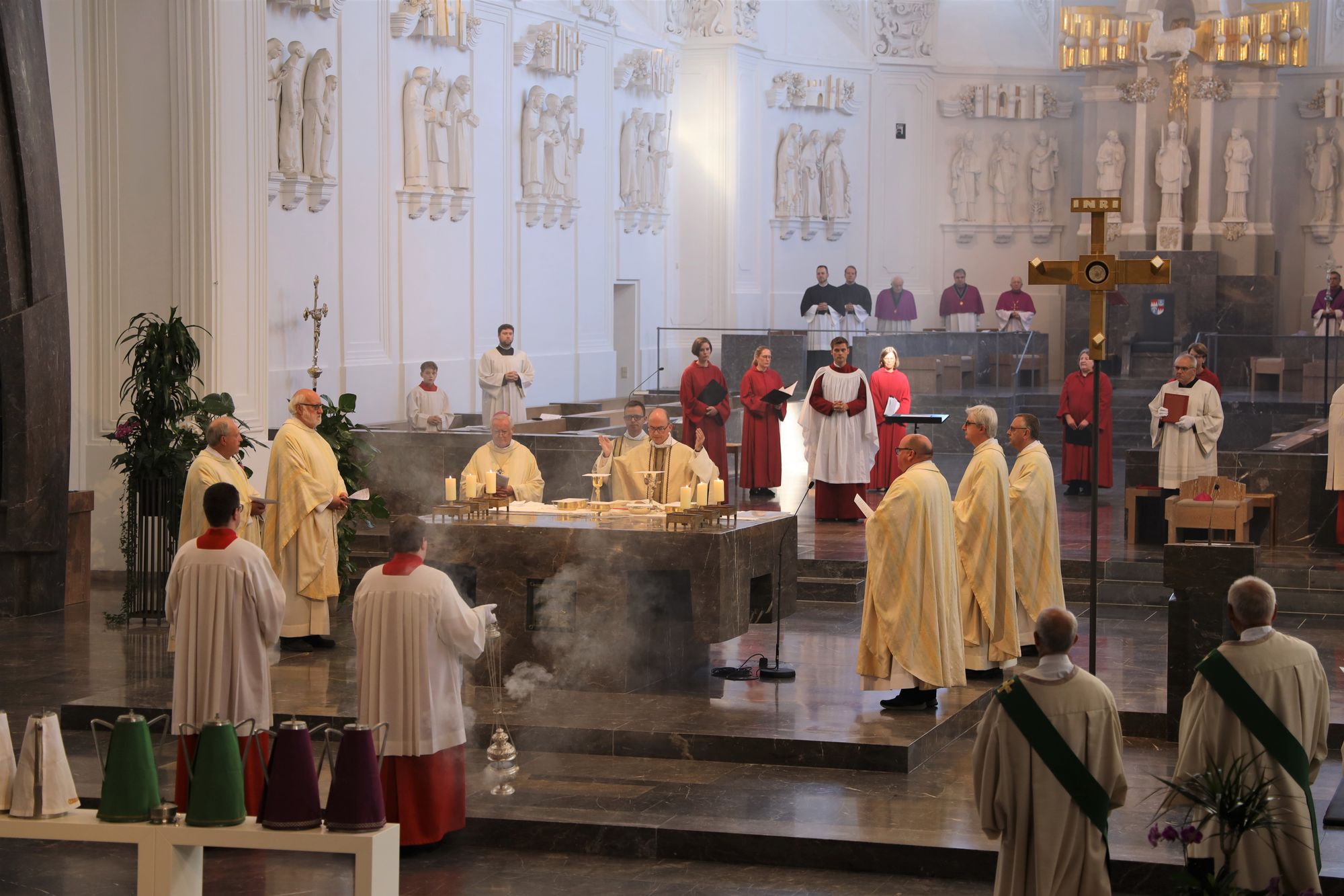 Die nur einmal im Jahr stattfindende Chrisammesse feierte Bischof Jung zusammen mit Bischof em. Dr. Friedhelm Hofmann, stellvertretendem Generalvikar Monsignore Dr. Stefan Rambacher sowie vier Dekanen als Vertretern des Diözesanklerus.