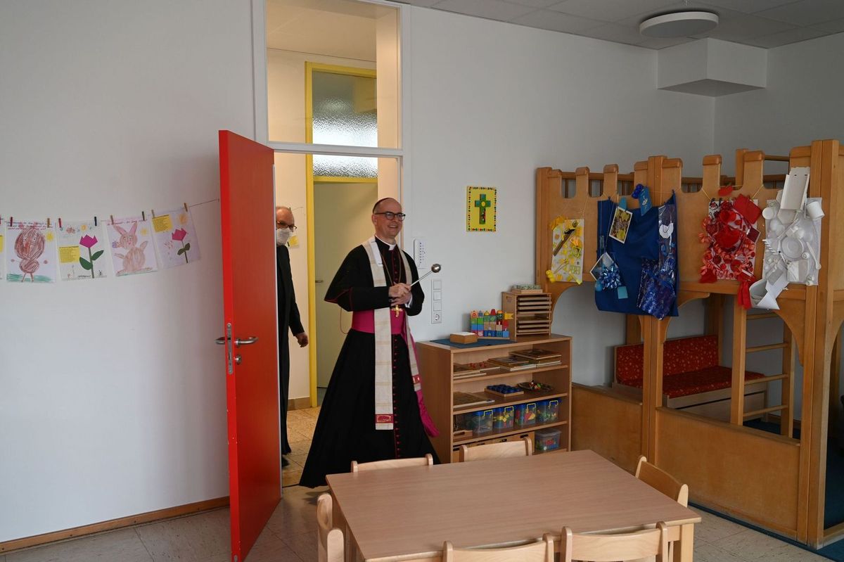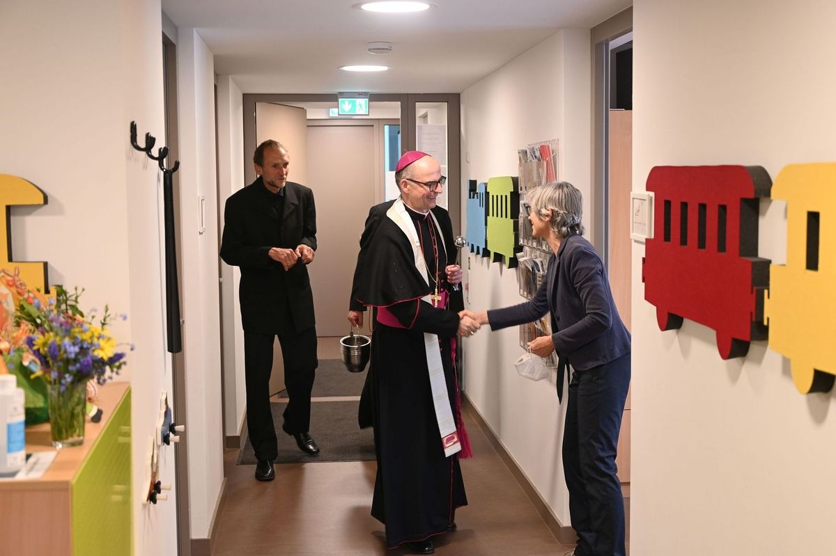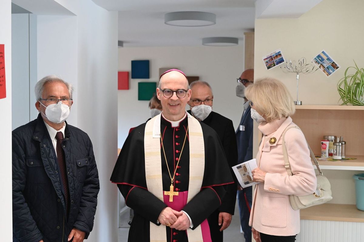 Wie vielfältig das pastoral-caritative Zentrum und seine Angebote für die Menschen sind, wurde Bischof Jung bei einem Rundgang durch alle Bereiche des weitläufigen Hauses deutlich. Der Weg mit Segnung führte durch die Räume der Caritas und der Malteser, durch das neue Integrations-Café, den Pfarrsaal, die Frühförderstelle und schulvorbereitende Einrichtung (SVE) der Caritas-Schulen gGmbH bis in den Kindergarten Sankt Anton. Der Bischof würdigte die Räume als ansprechend und sehr gelungen. In direkter Nachbarschaft befänden sich zwei wichtige Caritas-Einrichtungen der stationären Altenhilfe, sagte Domkapitular Bieber und zeigte dem Bischof das Marienstift und das Haus Maria Frieden.