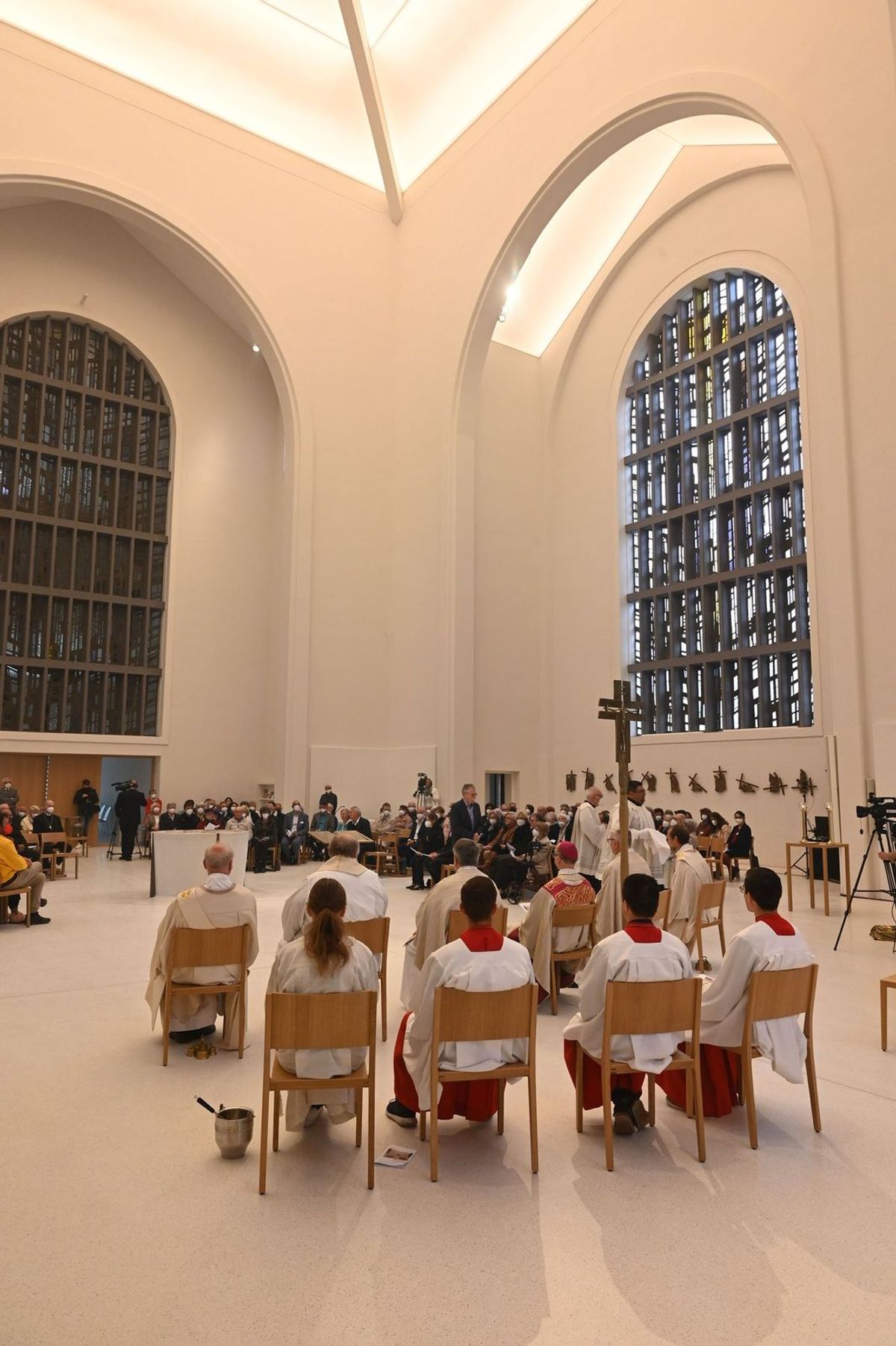 Neben dem Bischof standen Stadtpfarrer Joachim Morgenroth, Domkapitular Clemens Bieber, Vorsitzender des Diözesan-Caritasverbands, Pfarrer Bernhard Spieß und die Diakone Joachim Werb und Hans-Georg Mager am Altar, begleitet von einer großen Schar an Ministrantinnen und Ministranten. Zahlreiche Riten bestimmten den Verlauf des zweistündigen Pontifikalamtes: Weihwasser wurde eingangs gesegnet, um damit den neuen Gottesdienstraum, Ambo, Altar und die Gläubigen zu besprengen. Unter ihnen waren der evangelische Dekan Oliver Bruckmann, der griechisch-orthodoxe Pfarrer Martinos Petzolt und Schweinfurts Oberbürgermeister Sebastian Remelé. Ein besonderer Gruß des Bischofs galt neben den Verantwortlichen der Caritas den Gläubigen der Gemeinde Sankt Anton.
