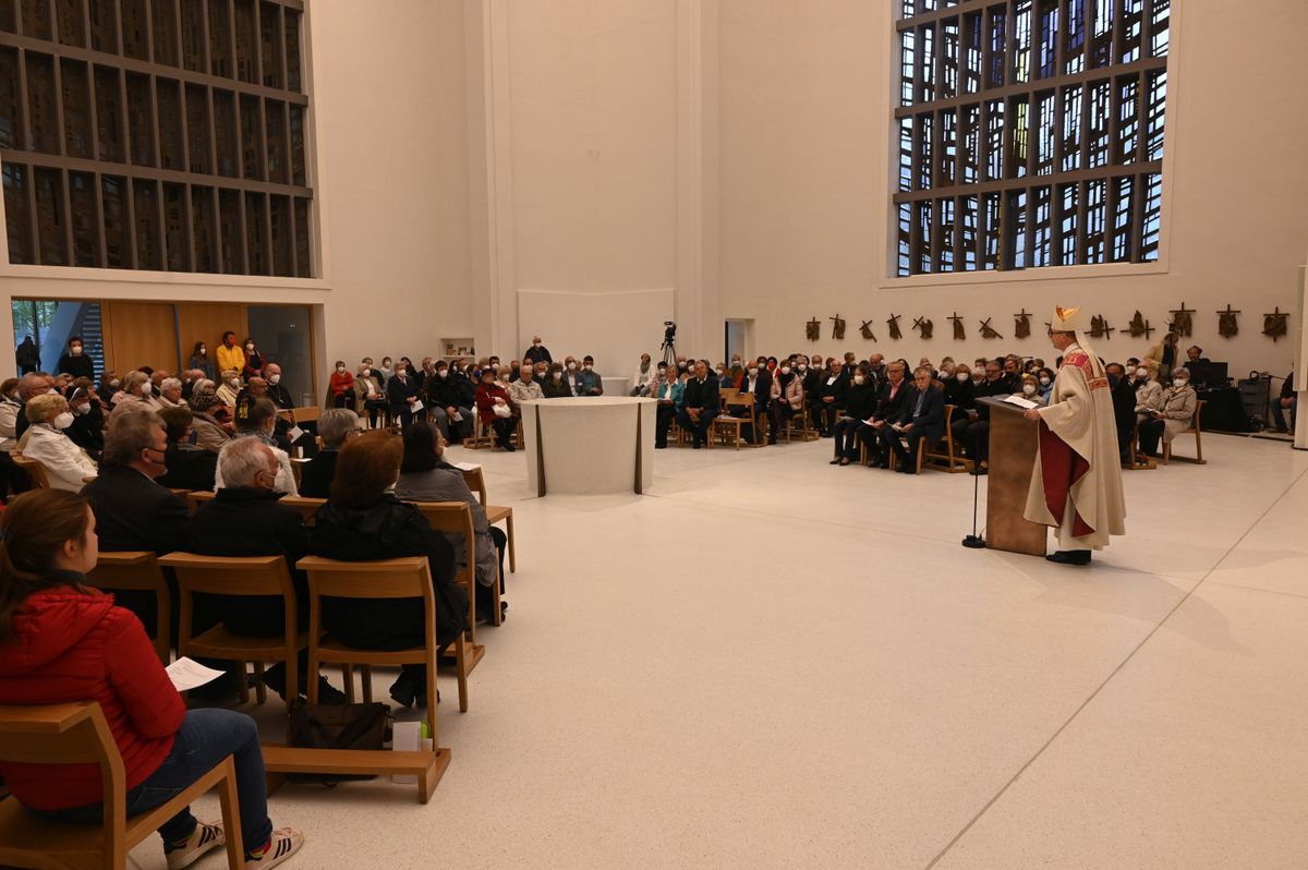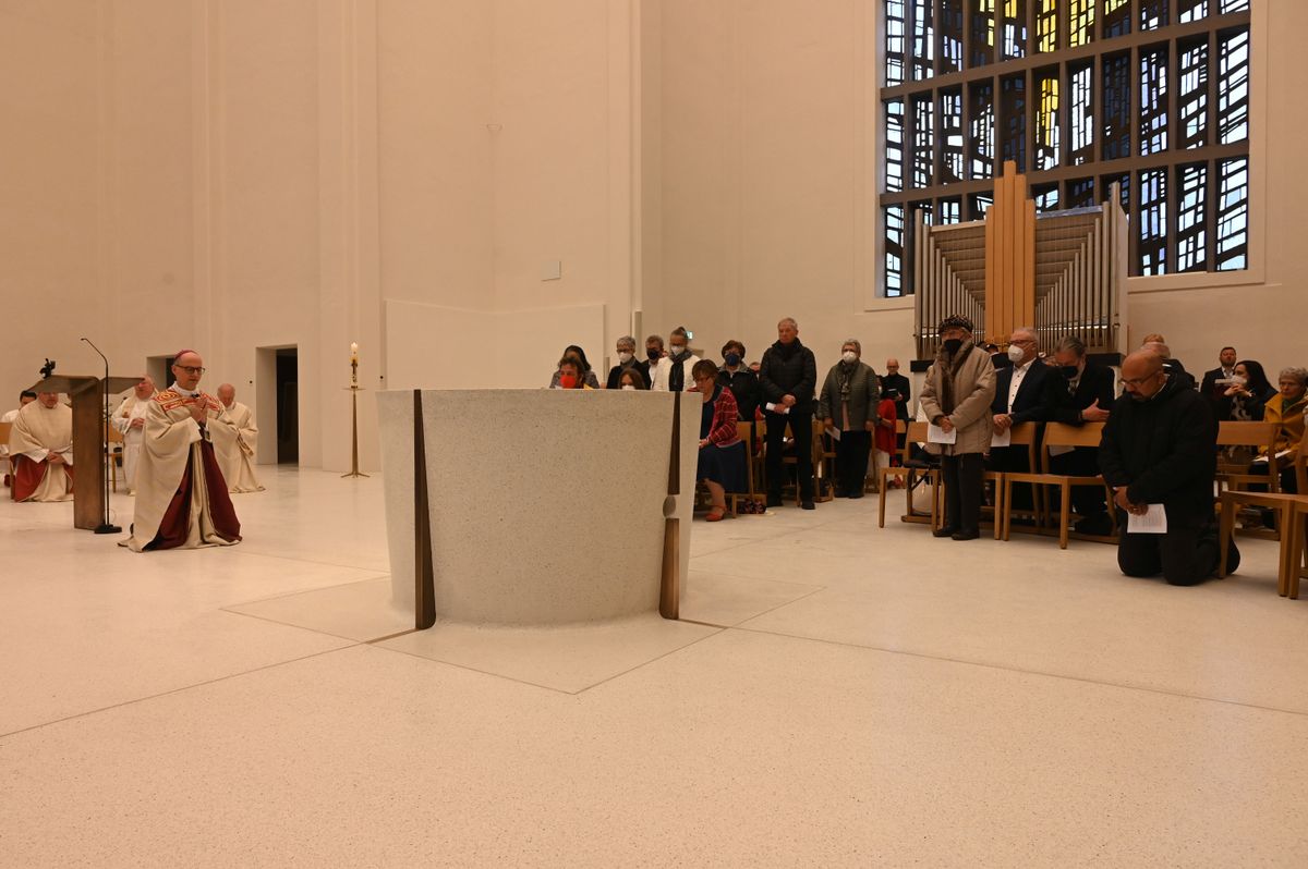 „Christus ist die Mitte, er wird im Altar repräsentiert“, erklärte der Bischof in seiner Predigt. Das Evangelium vom zweifelnden Thomas erinnere an Jesus, der nachösterlich durch verschlossene Türen zu seinen Jüngern gekommen sei. Das sei ein tiefes Bild für das, was im pastoral-caritativen Zentrum „casa Vielfalt“ geschehe. Kranke und hilfsbedürftige Menschen würden oftmals die Türen ihrer Welt verschließen oder durch ihre Umwelt ausgeschlossen. „Der Herr geht durch verschlossene Türen. Er geht durch alles, was uns von Gott trennt.“ In Sankt Anton seien Himmel und Erde auf großartige Weise miteinander verbunden, sagte Bischof Jung und bezog das auf die Architektur und das Konzept. Es gehe darum, sich vom Heiligen Geist beleben und den Frieden zusprechen zu lassen. Dafür stehe das Öl, mit dem auch der Altar gesalbt werde.