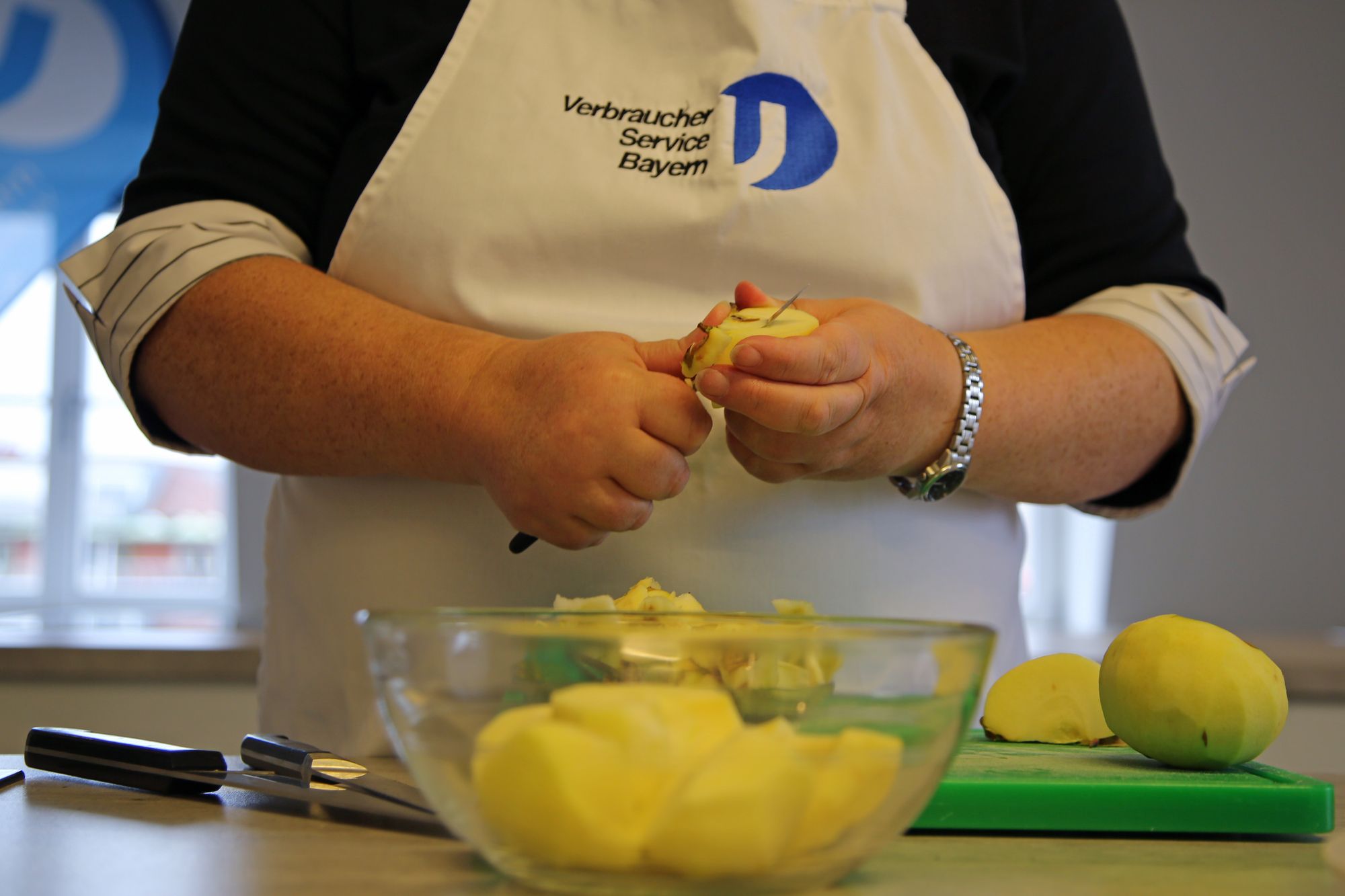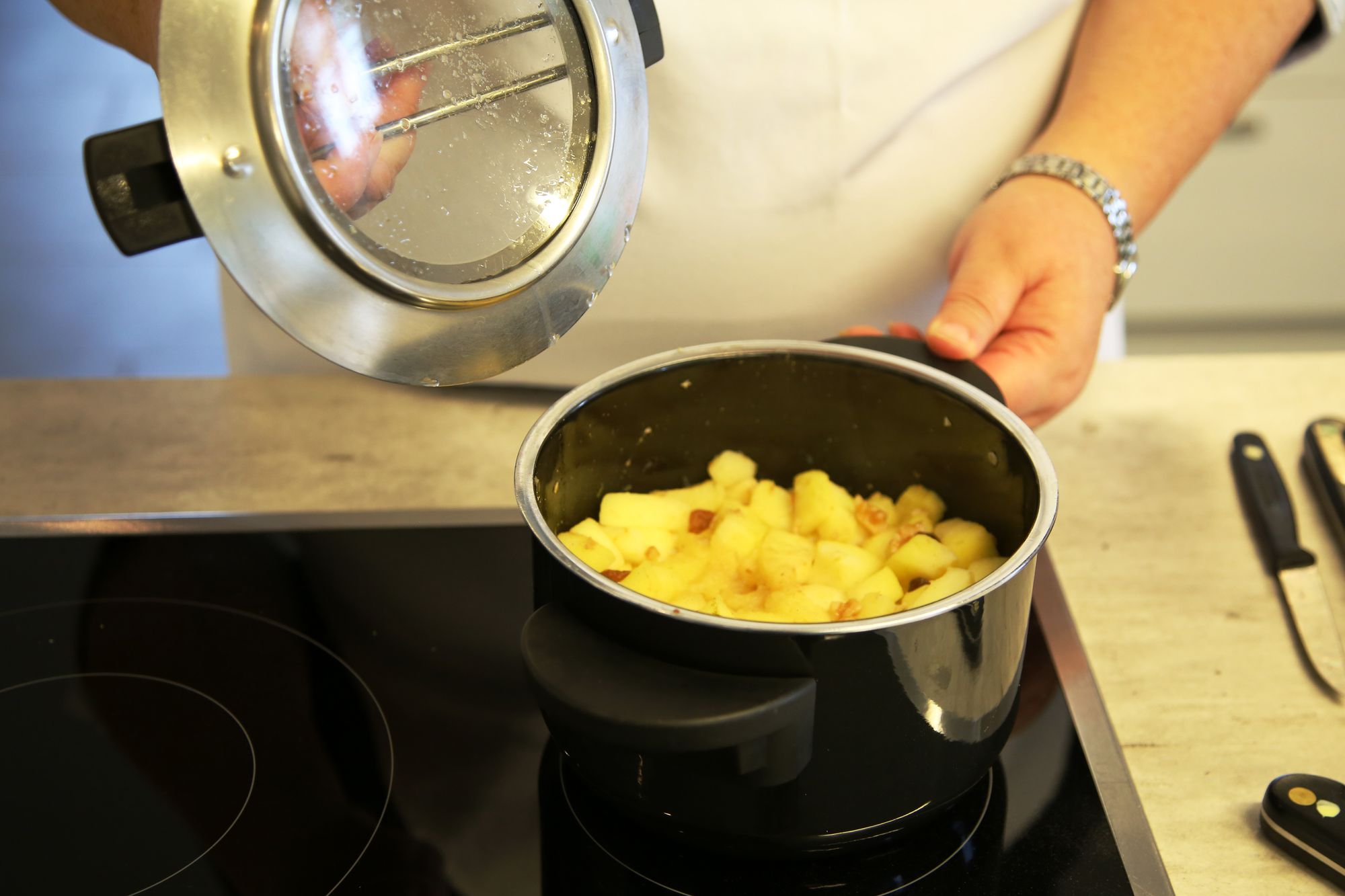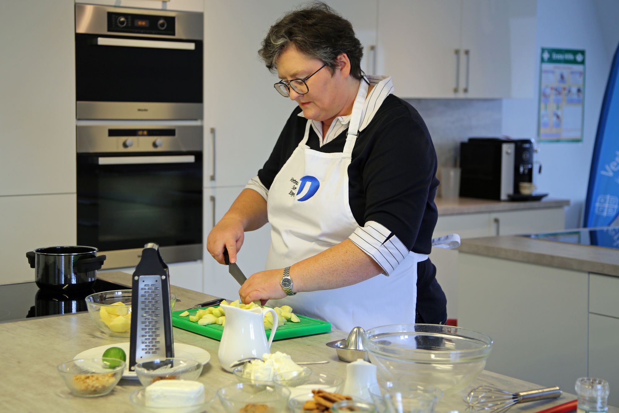 Zunächst bereitet Graus alles für das Apfelkompott vor: Blitzschnell schält, entkernt und schneidet sie drei saftige Äpfel. „Die einfache und schnelle Zubereitung von dem Apfeltiramisu bietet sich zum Ausprobieren mit Kindern an“, erzählt Graus. Mit zirka 30 Minuten Vorbereitungszeit rechnet sie. Wobei sie empfiehlt, sich beim Kochen mit Kindern Zeit zu nehmen und lieber einen Puffer einzuplanen. Graus hat Erfahrung: Sie unterrichtet im Rahmen ihrer Tätigkeit Schulklassen in Hauswirtschaft und bietet Kindergeburtstage an. „Egal ob Kinder oder Erwachsene, wenn man gemeinsam mit jemand Ungeübtem kocht, braucht man Geduld“, sagt Graus. Gleichzeitig solle man nicht unterschätzen, was Kinder schon können. „Mitmachen statt zuschauen“ ist ihre Devise, sonst langweilen sich die kleinen Helfer schnell.