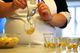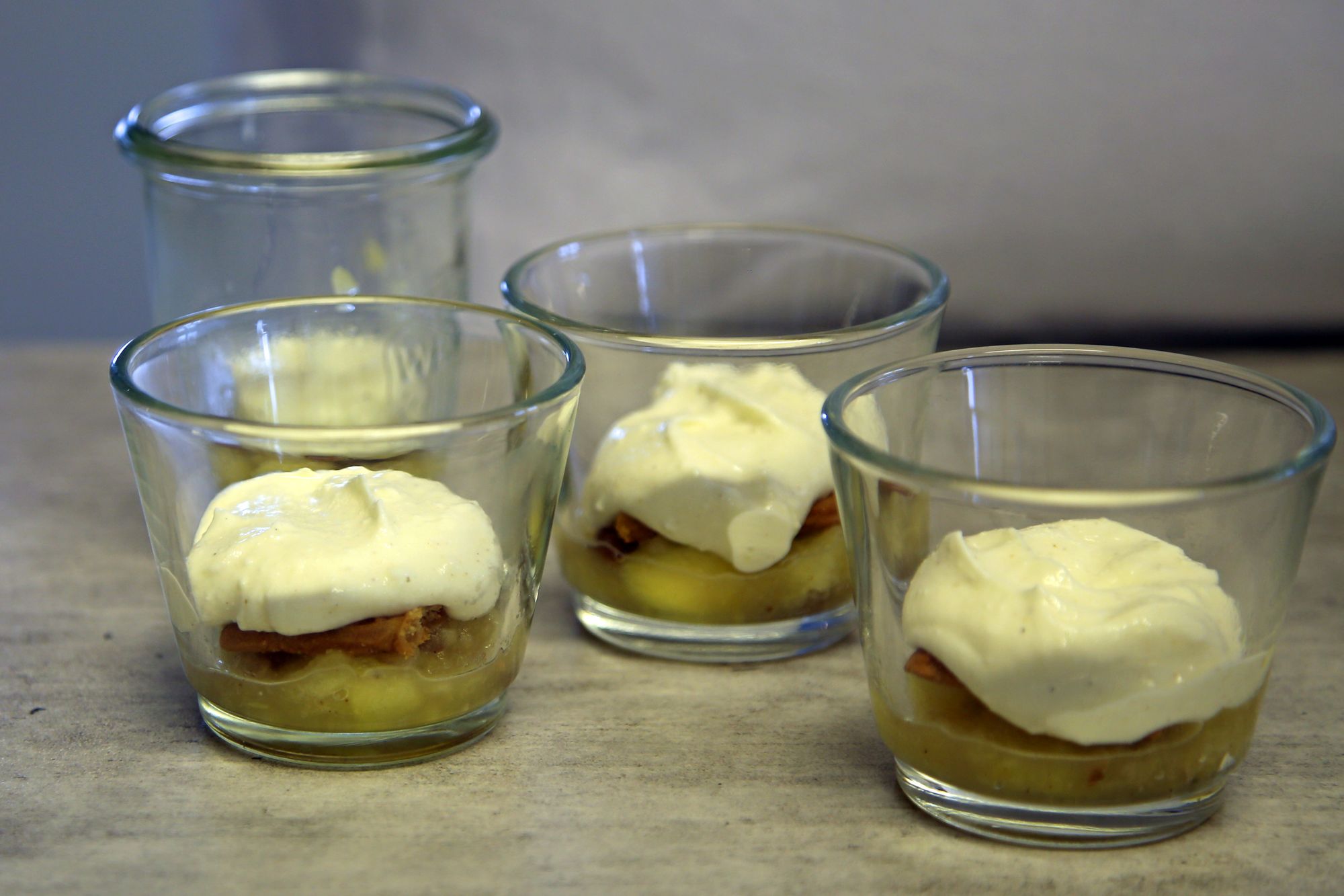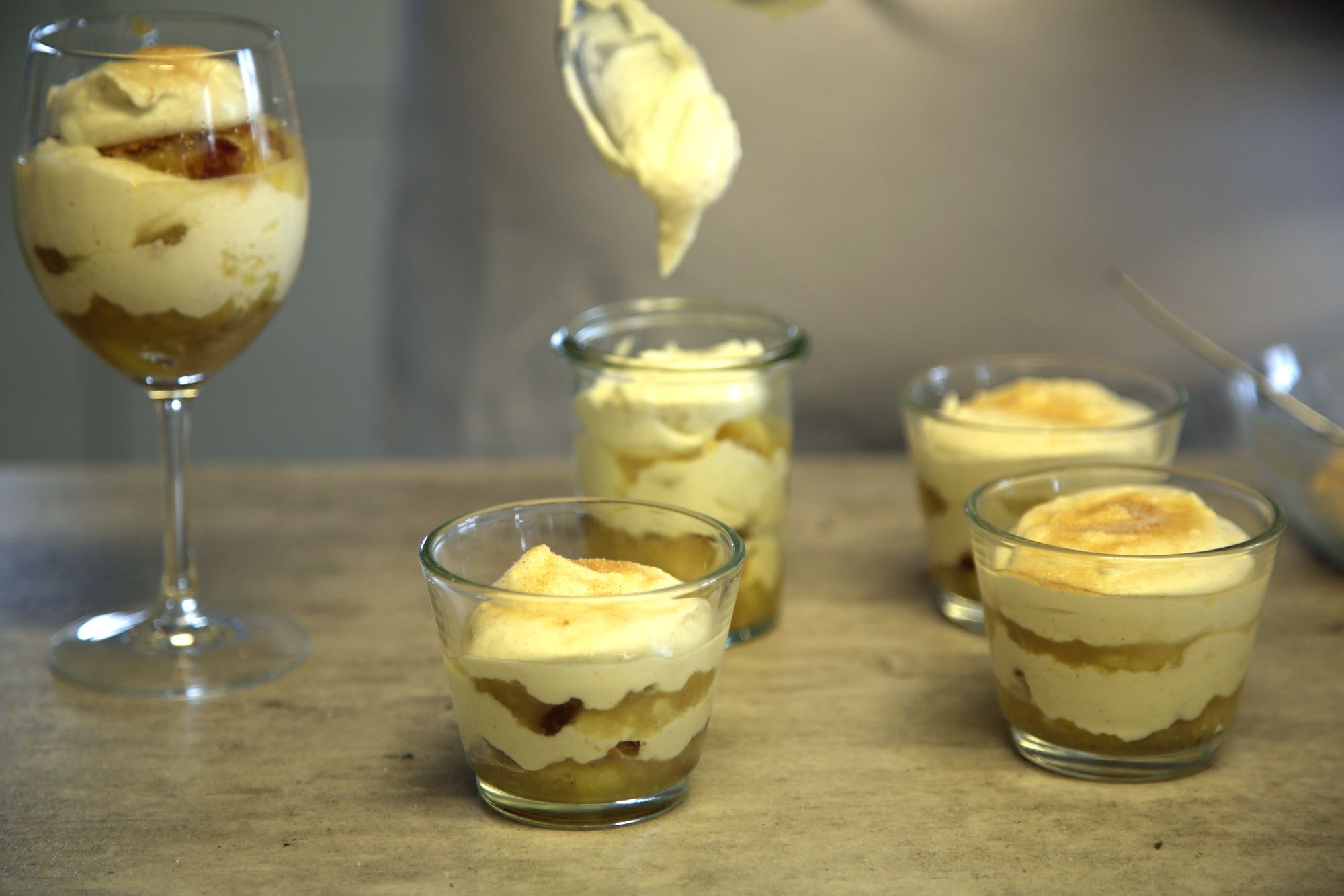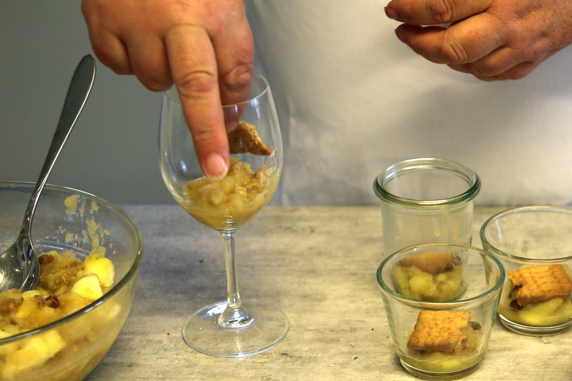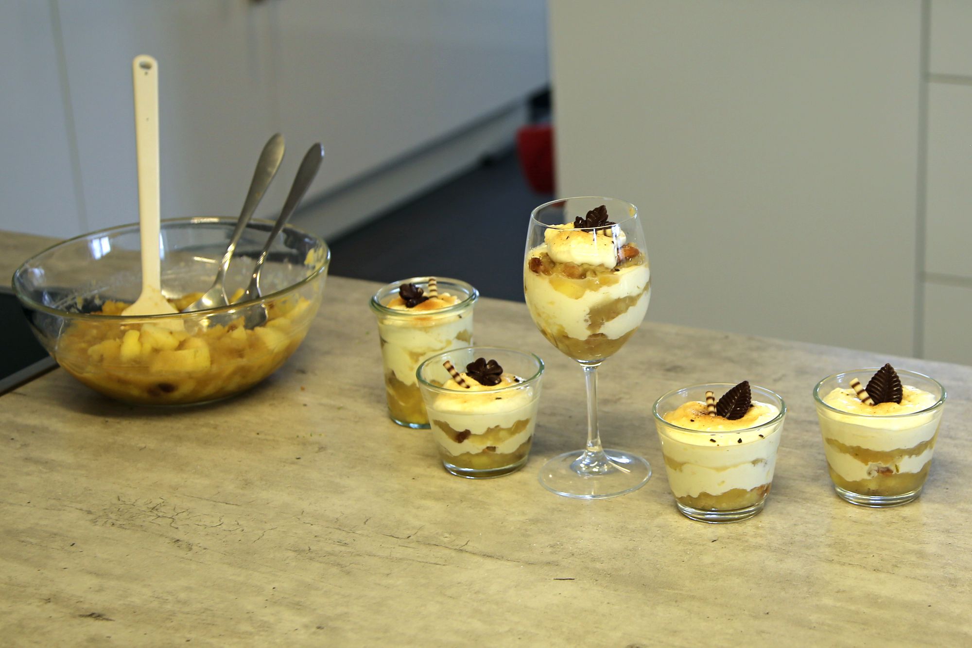 Das fertige, dampfende Kompott wird in einer Schüssel mit den Mandelblättchen vermengt. Schon beim Zuschauen läuft einem das Wasser im Mund zusammen. Sobald die Creme aus Quark und Mascarpone glatt gerührt ist, geht es ans Schichten: Kompott, Creme und Spekulatiuskekse werden abwechselnd in ein Dessertglas gegeben. „Die Kombination aus warmem Kompott und kalter Creme macht den Wow-Effekt aus“, erklärt Graus. Wer Lust hat, kann das fertige Tiramisu mit Goldpulver und Schokotannenbäumen verzieren. Aber auch ohne ist das Ergebnis schon schön anzusehen und vor allem himmlisch lecker.