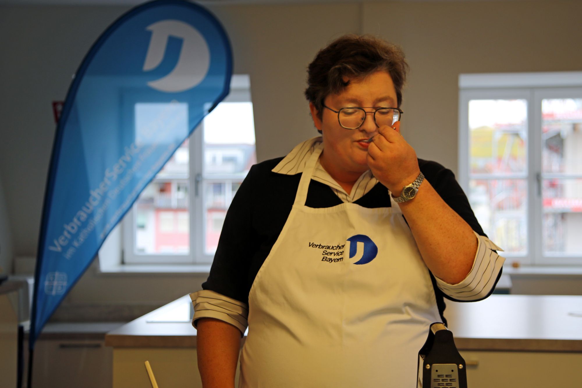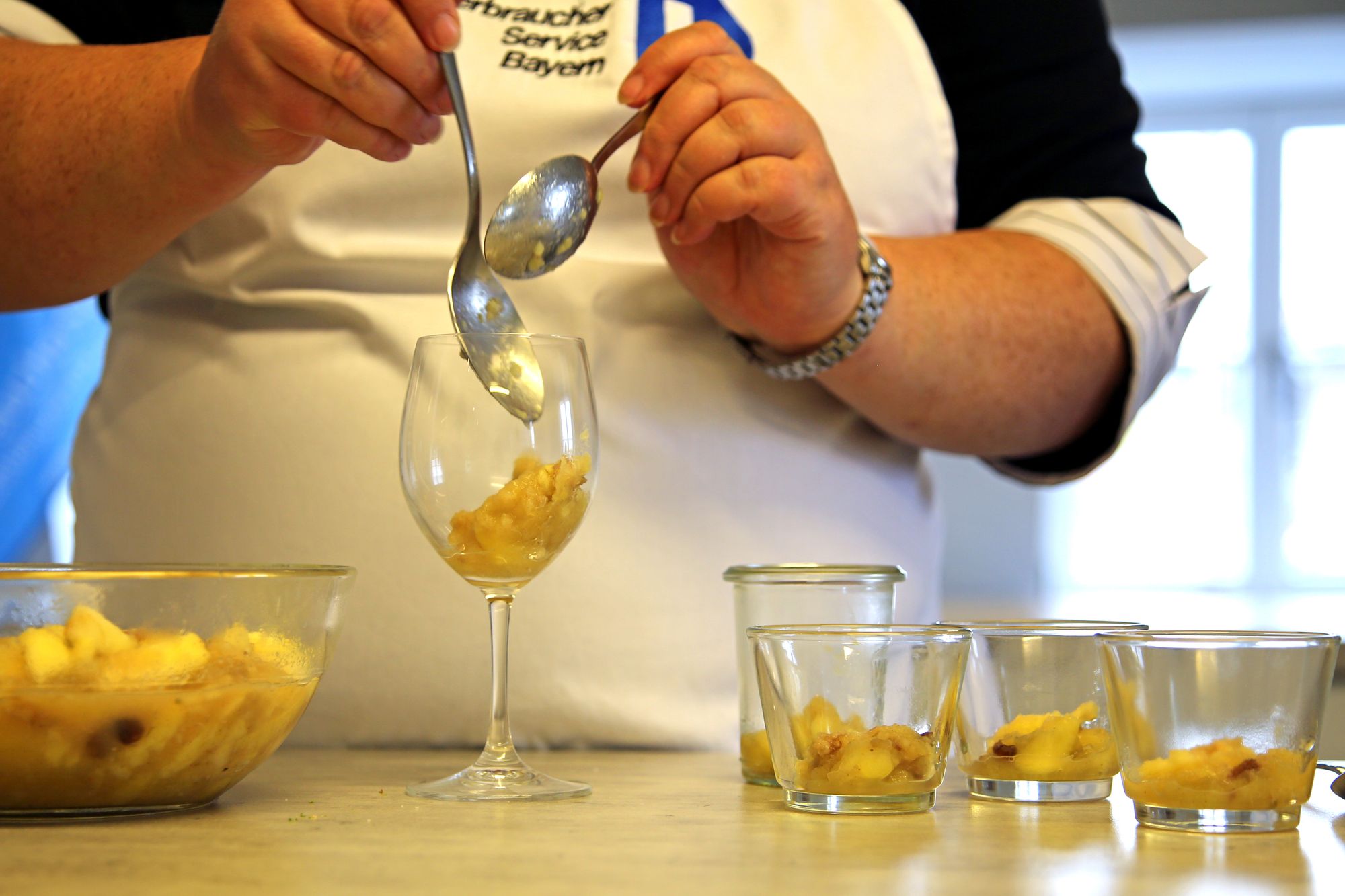 Würzburg (POW) Es riecht weihnachtlich in der Schulküche des Verbraucherservice Bayern (VSB). Die Zutaten für das Apfeltiramisu stehen schon bereit: Äpfel und Apfelsaft, Zimt, Zucker und Lebkuchengewürz, Spekulatius, Zitronen, Mandelblättchen, Rosinen, Mascarpone und Quark. Das Rezept ist von Iris Graus, Meisterin der Hauswirtschaft beim VSB im Katholischen Deutschen Frauenbund (KDFB). Sie hat es inspiriert von verschiedenen Rezepten zusammengestellt. Neben saisonalen und regionalen Produkten sei ihr besonders wichtig, dass alle Zutaten vor Ort verfügbar sind und keine weiten Strecken zurückgelegt werden müssen. Außerdem seien ihr viele Originalrezepte zu fett, besonders für Kinder. Deshalb mischt sie die Mascarpone mit Magerquark und reduziert Zucker. Nichtsdestotrotz sei das Wichtigste, dass es schmeckt. „Lieber eine kleine und leckere Portion als eine große, die nicht schmeckt“, erläutert Graus.
