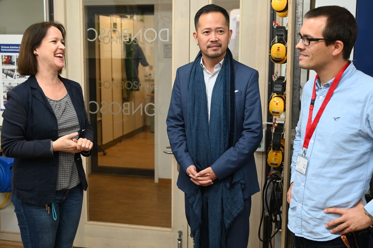 Die Don Bosco-Berufsschule sei besonders für junge Menschen mit erhöhtem Förderbedarf da, erklärte Studienrat Michael Brausam. Studienrätin Tanja Hofbeck und Studienrat Martin Husch führten den Gast durch die Schule. Dort war Qian beeindruckt von den modernen Übungs- und übersichtlichen Unterrichtsräumen. Er besuchte die Bereiche Holz, Küche, Friseur und Malerei sowie die Turnhalle. Bei den Bäckern probierte er ein „Schweinsohr“ und erklärte: „Bei uns heißt dieses Gebäck ‚Schmetterling‘.“ Alles sei freundlich, hell und barrierefrei, lobte Qian. „Die Gruppen sind bewusst klein, damit auf jeden und seine Bedürfnisse individuell eingegangen werden kann. Wir unterstützen damit die jungen Leute, wirklich ihren Ausbildungszweig zu finden“, erklärte Hofbeck. Großes Interesse zeigte Qian für die duale Ausbildung, die man so in China und anderen Teilen der Welt nicht kenne. „Die gute Mischung aus Theorie und Praxis kann der Schlüssel zum Erfolg sein“, sagte er.