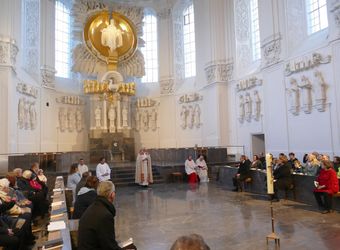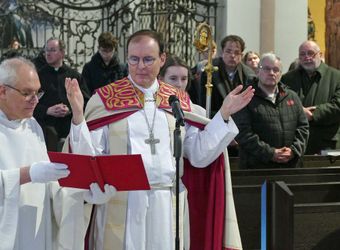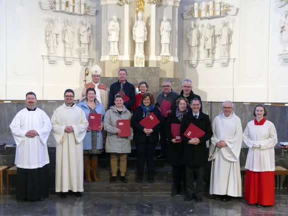 Würzburg (POW) Fünf Frauen und fünf Männer hat Weihbischof Paul Reder am Sonntag, 26. Januar, im Namen von Bischof Dr. Franz Jung bei einem Gottesdienst im Würzburger Kiliansdom als ehrenamtliche Begräbnisleiterinnen und Begräbnisleiter beauftragt. Er dankte ihnen für ihre Bereitschaft zur Ausbildung und zum Dienst in den Pastoralen Räumen. Gottes Wirklichkeit und sein Reich auch im Angesicht des Todes zu verkünden, sei der bleibende Auftrag für den Dienst in der Sorge um Verstorbene und Trauernde.