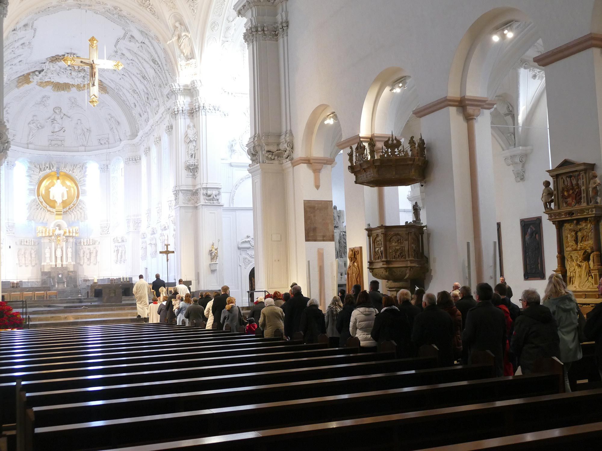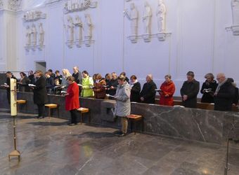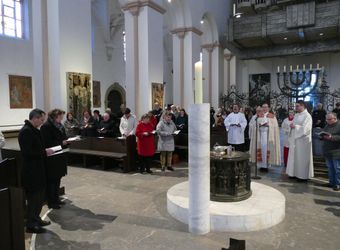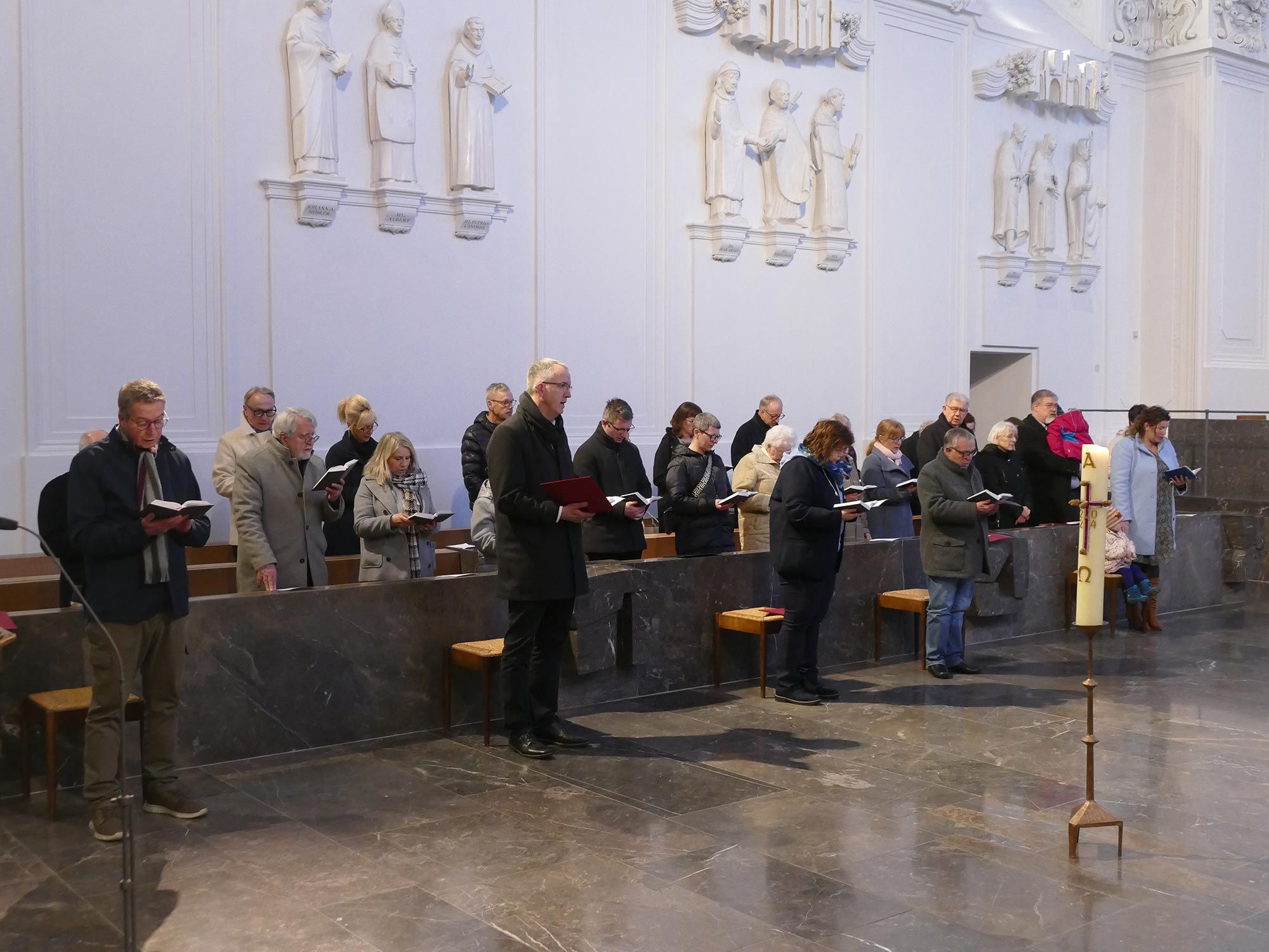 Zu Beginn der Feier versammelten sich alle am Taufbecken des Doms zum Taufgedächtnis. Begleitet von der Osterkerze, zogen die künftigen Begräbnisleiterinnen und -leiter mit ihren Familien, Freunden und Vertretern der Gemeinden in den Hochchor.