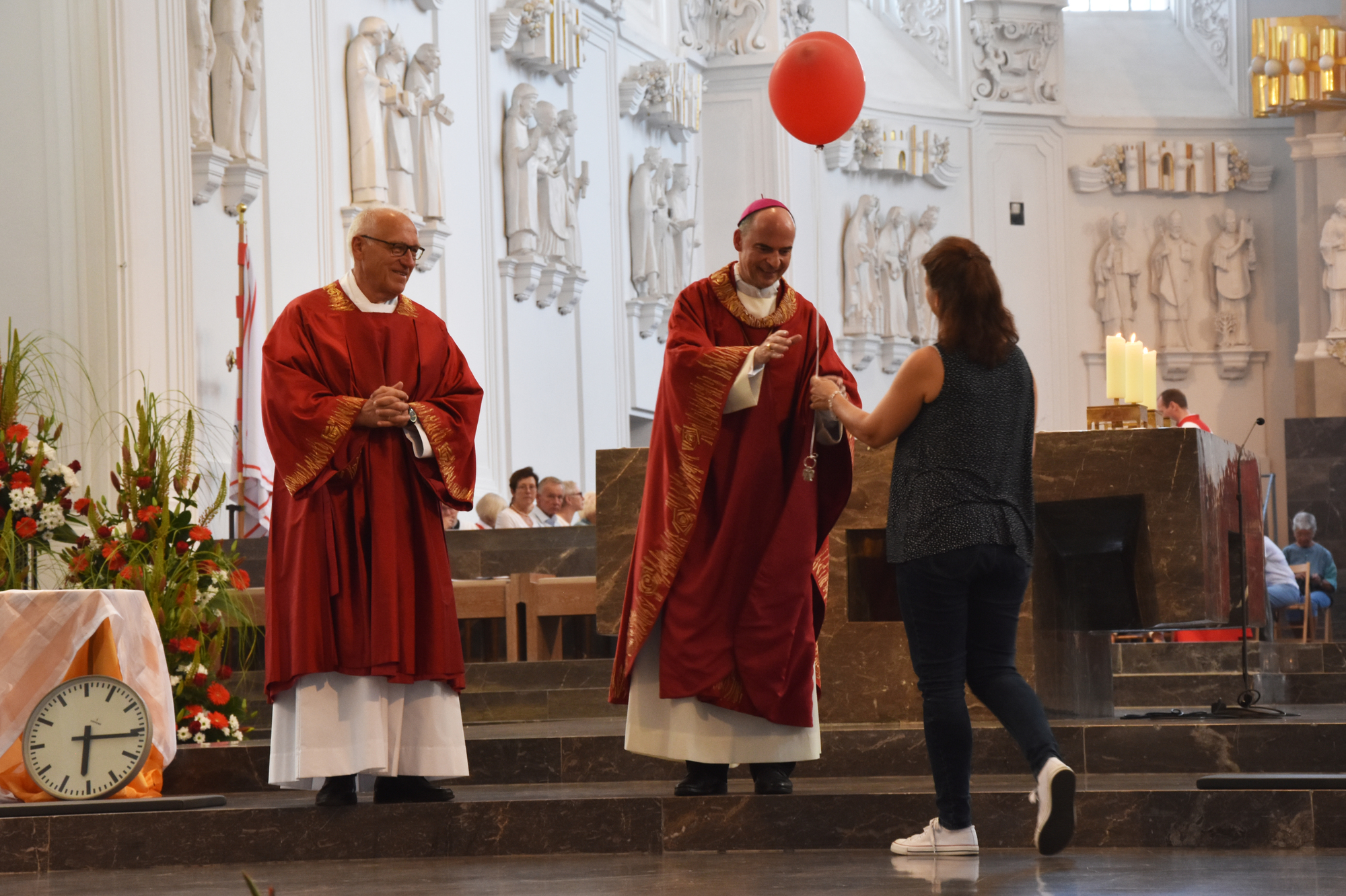 Ein Anspiel zu Beginn des Gottesdienstes; eine Gabenprozession mit großen Symbolen – Schlüssel, Teddybär und Uhr –, die zeigen, wie sich Menschen bei der Caritas beruflich und ehrenamtlich für andere engagieren: Sie öffnen Türen, spenden Trost, nehmen sich Zeit. Beim Vortragen besinnlicher Texte zum Kyrie und nachdenklich stimmender Fürbitten, mit Lektoren- und Ministrantendienst: Viele bringen sich in den Gottesdienst ein. Der Bischof lobt ausdrücklich den kleinen Chor der Caritas und lädt am Ende der Feier die Anwesenden zum Einzelsegen am Reliquienschrein der Frankenapostel ein.