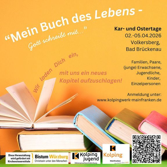 Das Angebot richtet sich an Familien, Paare und Einzelpersonen, (junge) Erwachsene, Jugendliche und Kinder. „Mein Buch des Lebens: Jeden Tag eine neue Seite, immer wieder neue Kapitel mit neuen Erfahrungen. Manchmal lese ich zwischen den Zeilen, manchmal fühlt es sich an, als wenn das Buch zugeschlagen wird. Und doch gibt es dann plötzlich ein neues Kapitel, das viele Überraschungen mit sich bringt“, heißt es in der Ankündigung. Das Programm umfasst Workshops, kreative Angebote, Auszeiten, geistliche Begleitung und die gemeinsame gottesdienstliche Feier der drei österlichen Tage. Für Kinder und Jugendliche gibt es ein eigenes Programm. Die Lebensfeiern werden großteils gemeinsam gestaltet. Die Teilnahme kostet pro Familie mit zwei Erwachsenen und Kindern unter 18 Jahren 470 Euro (450 Euro für Kolpingmitglieder), pro Familie mit einem Erwachsenen und Kindern unter 18 Jahren sowie für Einzelpersonen 235 Euro (225 Euro für Kolpingmitglieder). Der Zuschlag für ein Einzelzimmer beziehungsweise Dusche/WC im Zimmer beträgt pro Person jeweils 15 Euro. Jugendliche und junge Erwachsene in Schule, Ausbildung oder Studium zahlen pro Person 95 Euro (16 bis 18 Jahre), 140 Euro (19 bis 26 Jahre) oder 165 Euro (26 bis 29 Jahre). Anmeldung bis Mittwoch, 18. März, und weitere Informationen beim Kolpingwerk Würzburg.