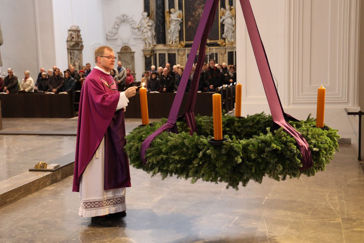 Karl-Peter Büttner, Mitglied im Zentralkomitee der deutschen Katholiken (ZdK) und langjähriger Vorsitzender des Diözeanrats der Katholiken im Bistum Würzburg, entflammte die Kerze beim Konventamt. Dompfarrer Dr. Jürgen Vorndran lud die Gläubigen ein mitzubeten, „dass wir in den Herausforderungen unserer Zeit Kirche neu aufbauen. Ich lade Sie ein, vertrauensvoll in die Zukunft zu blicken und nicht nostalgisch in die Vergangenheit, als die Kirchen noch voll und die Welt noch in Ordnung war.“ Wenn zeitgleich mit der ersten Kerze am Adventskranz auch die Kerze des Synodalen Wegs entzündet werde, stellten diese Symbole sinnenfällig auch das Selbstverständnis als Christen vor Augen, sagte Vorndran. „Gehen wir also den synodalen Weg als adventliche, das heißt zukunftsgewandte Gemeinschaft. Erweisen wir uns als Kirche auf dem Synodalen Weg als betende Gemeinschaft, die stets das rettende Kommen Jesu Christi erwartet.“ Bischof Dr. Franz Jung hatte zum Synodalen Weg bereits an anderer Stelle betont, er persönlich erwarte sich, dass dieser in einer geistlichen Atmosphäre stattfinde und nicht einfach „vorformulierte Forderungen unversöhnt aufeinanderprallen, sondern dass es zu einem geistlichen Abwägen kommt, bei dem sich am Ende vielleicht sogar ganz neue Lösungen abzeichnen“. Es gehe dabei nicht darum, nötige Diskussionen „abzuwürgen“, sondern um eine Haltung der Ergebnisoffenheit, die es zulasse, Neues und Anderes zu denken.