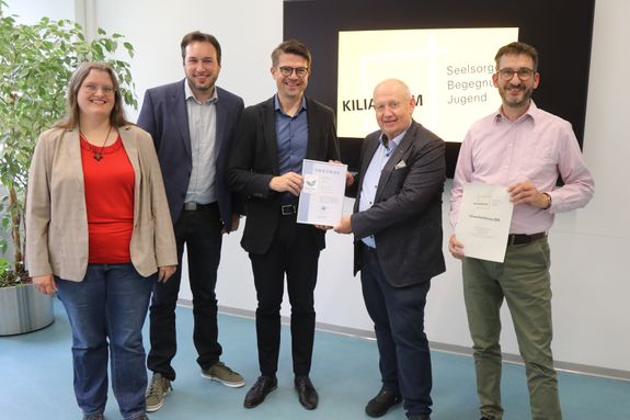 Würzburg (POW) Das Kilianeum in Würzburg ist erneut nach dem Standard EMAS (Eco-Management and Audit Scheme) zertifiziert worden. „Das ist eine echte Leistung. Wir wissen, wie viel Arbeit dahintersteckt“, sagte Dr. Lukas Kagerbauer, stellvertretender Hauptgeschäftsführer der Industrie- und Handelskammer (IHK) Würzburg-Schweinfurt, am Montag, 22. September, bei der Übergabe der Urkunde. Stephan Barthelme, Leiter des Kilianeums, sprach von einem „Leuchtturmprojekt“ im Bistum. Mit der Teilnahme am EMAS-System wolle das Kilianeum einen Beitrag zur christlichen Schöpfungsverantwortung leisten.