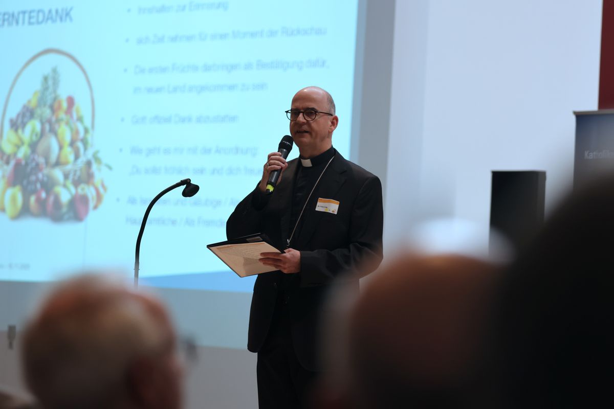 Der Bischof lud zum Auftakt bei seinem geistlichen Impuls dazu ein, sich Zeit zu nehmen für einen Moment der Rückschau. „Bringen wir wie die Israeliten die ersten Früchte vor Gott ‒ als Bestätigung dafür, dass wir im neuen Land angekommen sind.“ Mancher Ertrag sei geschenkt worden, anderer hart erarbeitet, sagte der Bischof.