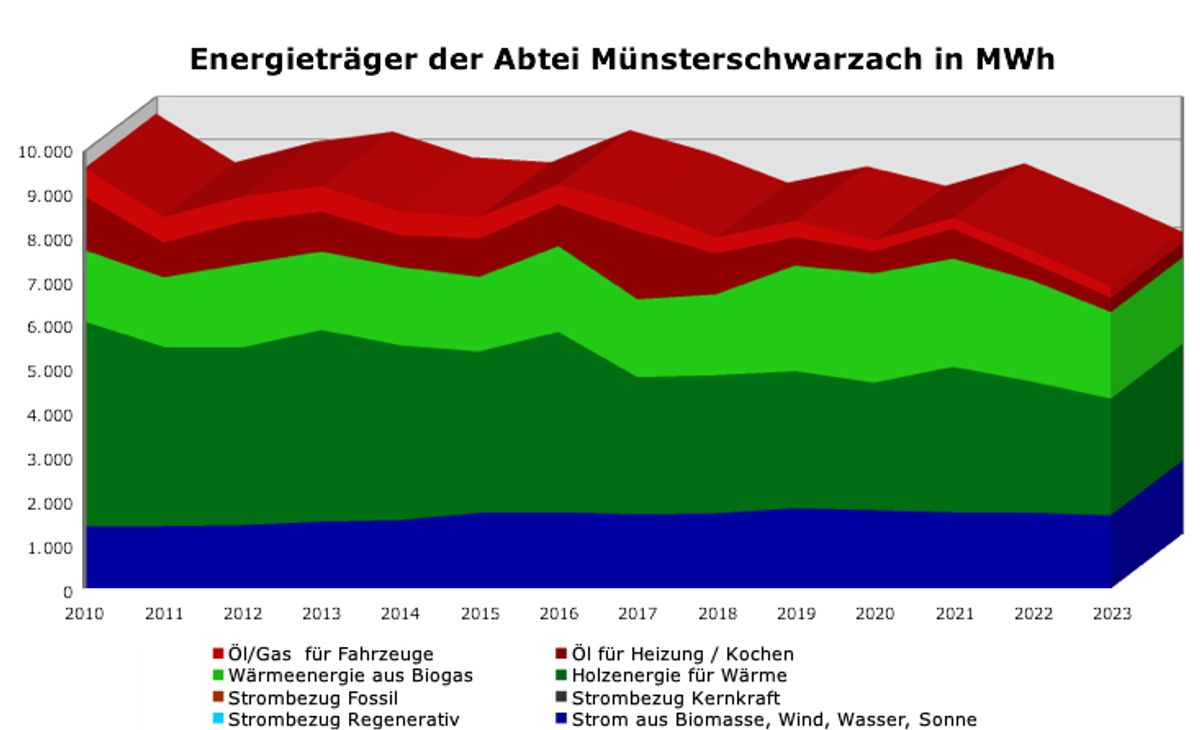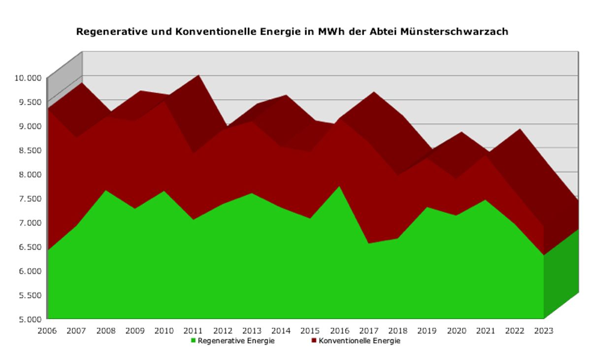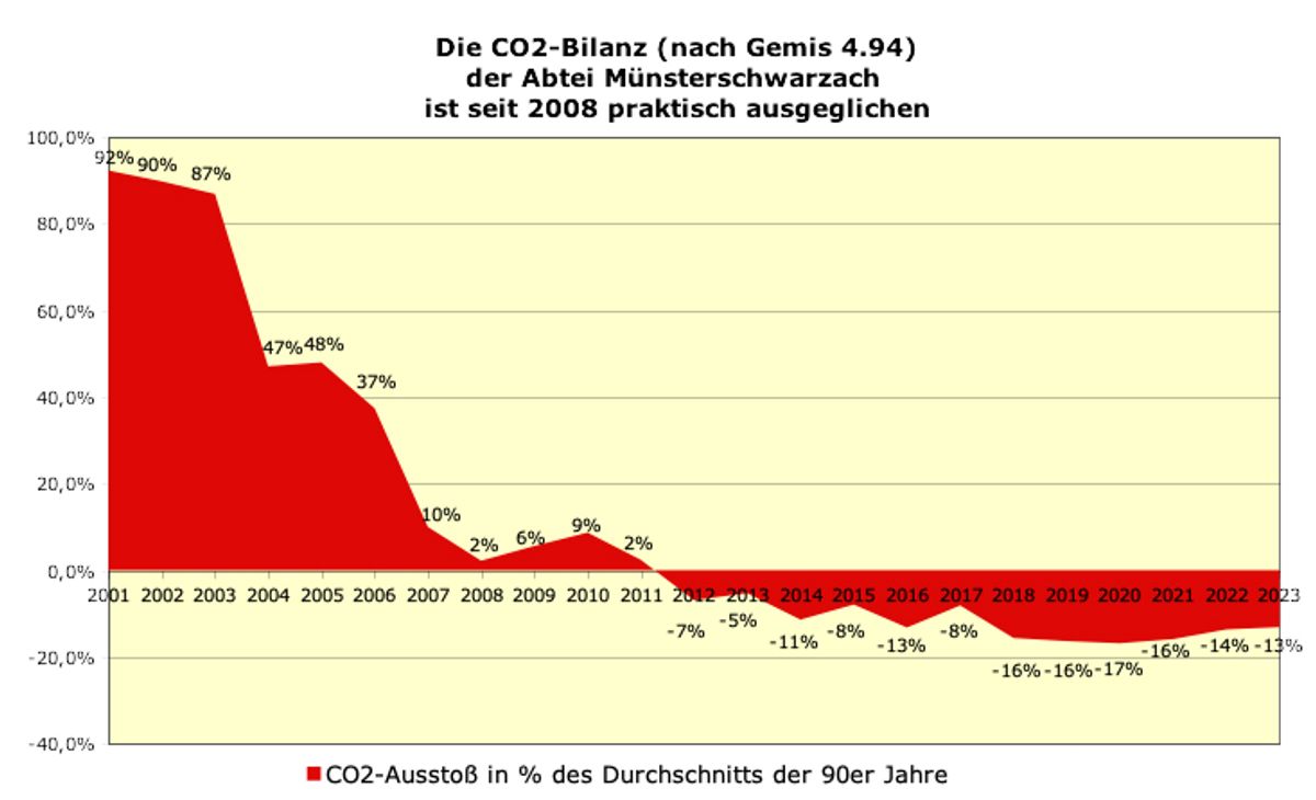 Münsterschwarzach (POW) Die Abtei Münsterschwarzach kann auch für das Jahr 2023 wieder eine „negative“ CO2-Bilanz vorweisen. In den nun veröffentlichten Zahlen und Auswertungen für das Ökologieprojekt zeige sich eine stabile Entwicklung im Vergleich zu den Vorjahren, schreibt die Abtei in einer Pressemitteilung. Bei den Grafiken fällt zunächst ein leicht verschlechtertes Ergebnis in der CO2-Bilanz im Vergleich zu den Vorjahren auf. Erklären lasse sich das zum einen in der vermehrten Nutzung von Eigenstrom, die im Umkehrschluss für weniger Energieüberschuss durch Einspeisungen sorgt. „Zudem kann die Biogasanlage nicht mehr so viel im Winterhalbjahr produzieren aufgrund der Beschränkungen zur Gülle-Einlagerung“, erklärt Cellerar Pater Christoph Gerhard, der für das Ökoprojekt verantwortlich ist.