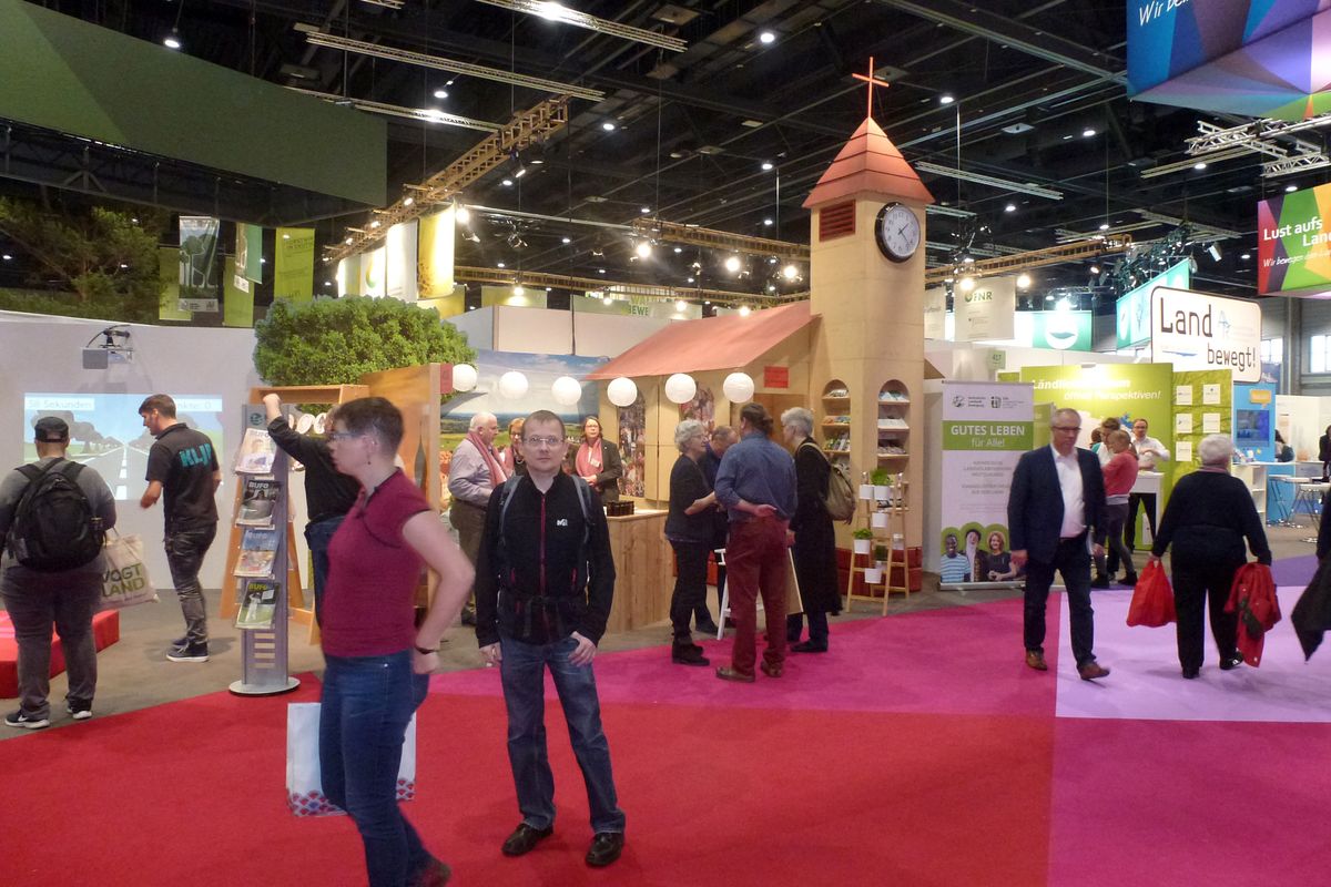 Wie in den Jahren zuvor wurde auch heuer der Stand auf der Grünen Woche in ökumenischer Eintracht mit dem Evangelischen Dienst auf dem Lande (EDL) betrieben. Der wurde markant überragt vom Turm der Messekirche, der mit seiner Höhe von rund viereinhalb Metern von fast überall in der Halle zu sehen war. Das zwölf Quadratmeter große Kirchlein selbst wurde gern genutzt für intensivere Gespräche oder schlicht als Rückzugsort für Menschen, die einen Moment der Ruhe im Messetrubel suchten. „Es ist wichtig, dass wir als Kirche sichtbar und mit den Menschen im Gespräch bleiben“, betonte Meyer zu Brickwedde.