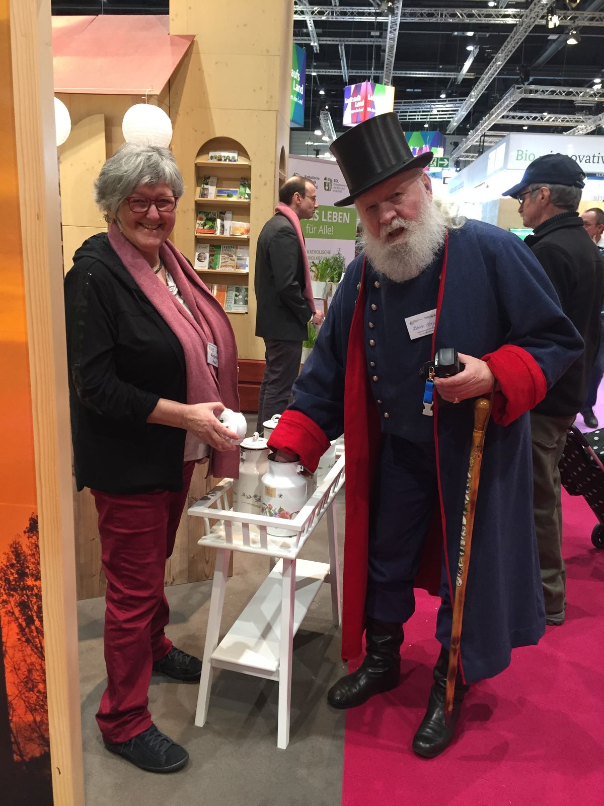 Für den Stand hatten EDL und KLB das Motto „Gutes Leben für Alle“ gewählt. Davon zeugten auch die Give-aways, die gern mitgenommen wurden. Ob Päckchen mit Gewürzen, Notizblöcke oder zwei Rezeptkarten, alles verschwand in den oft gut gefüllten Tüten der Messebesucher. Alle Mitnehmartikel hatten etwas mit Regionalität zu tun, wie etwa das Kräutersalz aus dem unterfränkischen Abtswind oder die Rezepte für eine Grünkernsuppe und einen Nachtisch auf den beiden Karten. Der darauf abgedruckte Gedanke „Meine Heimat auf dem Teller“ wurde auch bei einem Sketch auf der Hallenbühne aufgegriffen. Dabei wählten Angelika Haaf und Gerd Schneider eine Alltagsszene beim Einkauf für den Einstieg in ein Gespräch über Nachhaltigkeit bei Lebensmitteln und die Arbeit des Landvolks.