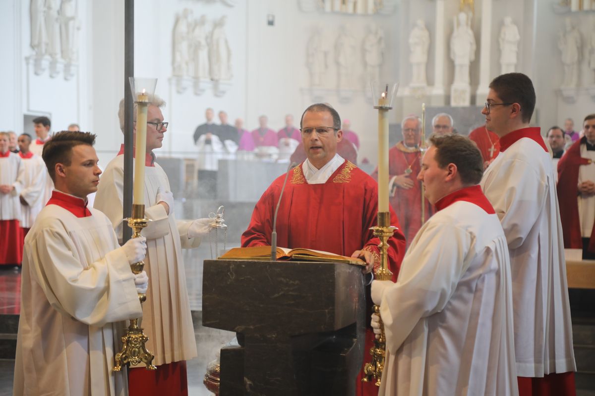Die Grundsatzfragen der Menschheit seien hochaktuell. Gott müsse nicht er-, sondern gefunden werden. „Dazu bedient er sich der Kirche und ruft Menschen in die Nachfolge Christi.“ Schon die Begegnung des Mose mit Gott im brennenden Dornbusch mache deutlich: Jede Berufung ist einmalig und verläuft einzigartig. „Innerhalb der vielen Berufungen gibt es auch die Berufung zum Priester, für die ich heute besonders danken möchte. Nicht aus eigenem Vermögen heraus wird man berufen, sondern aus dem Willen Gottes“, hob Bischof Hofmann hervor. Christus wolle durch die Geweihten in die jetzige Zeit und an diesem konkreten Ort wirken. „Hierin liegt die große Herausforderung an den Weihekandidaten. Das eigene ‚Adsum – hier bin ich‘ zu sprechen, setzt voraus, dass ich mich ganz und gar der Liebe Christi anvertraue – ohne zu wissen, was auf mich zukommt.“