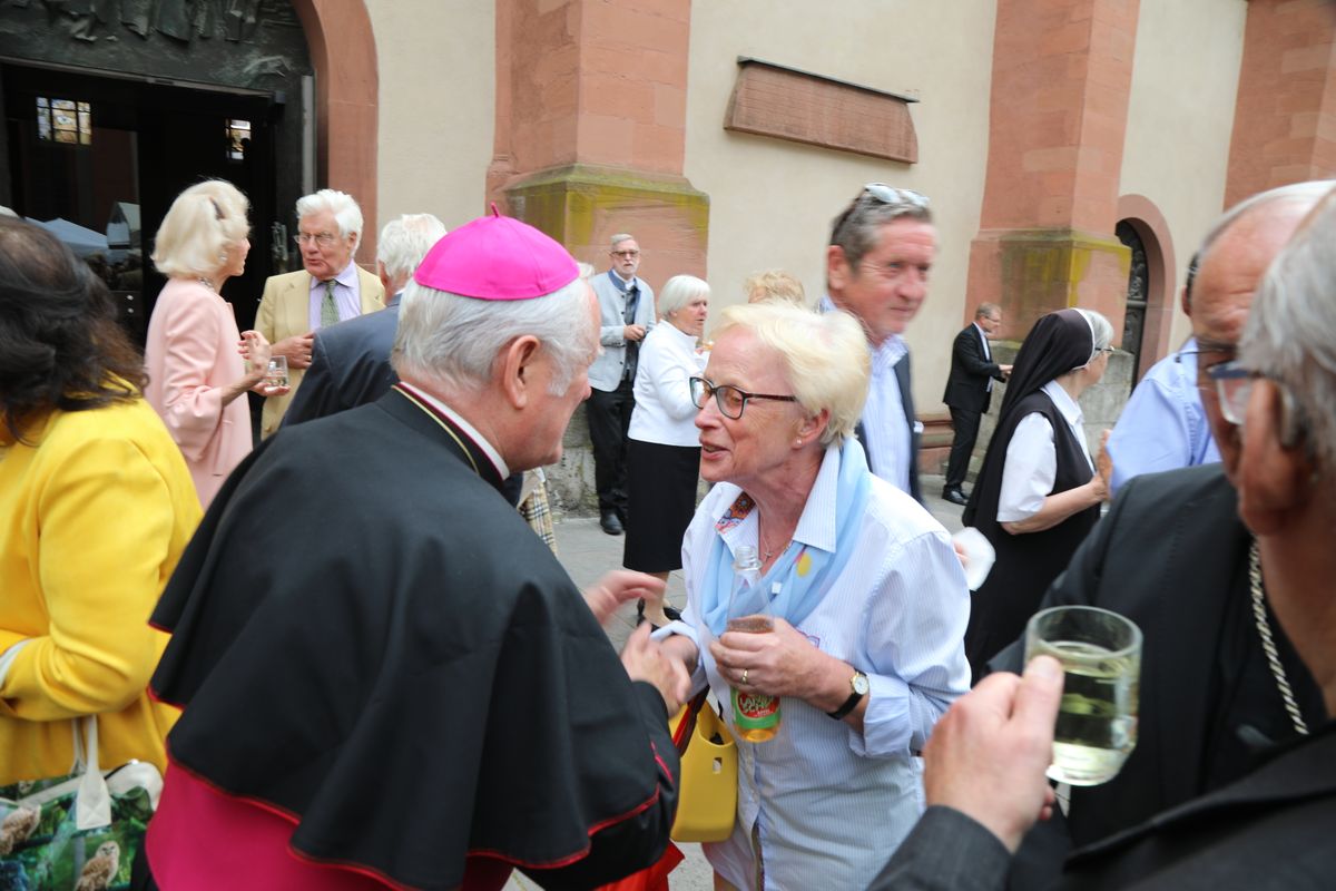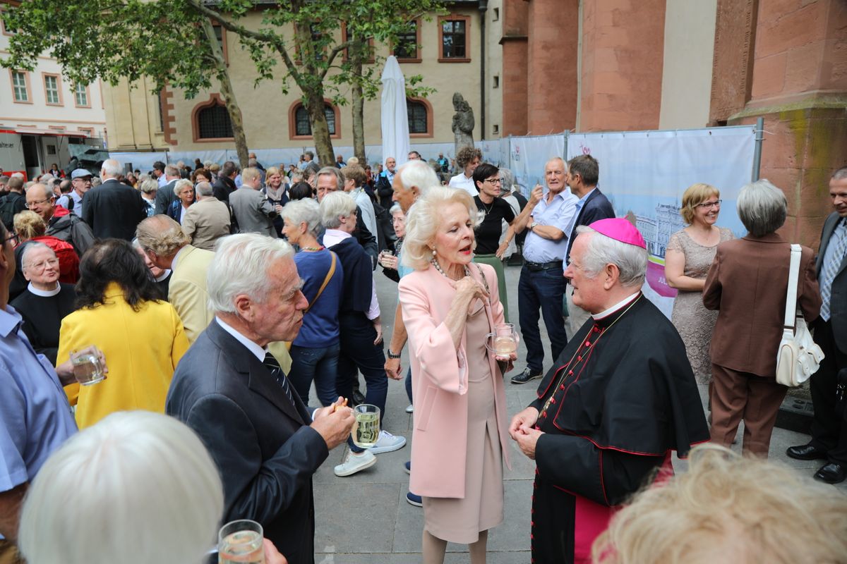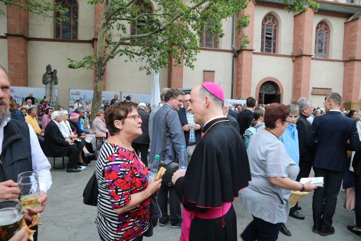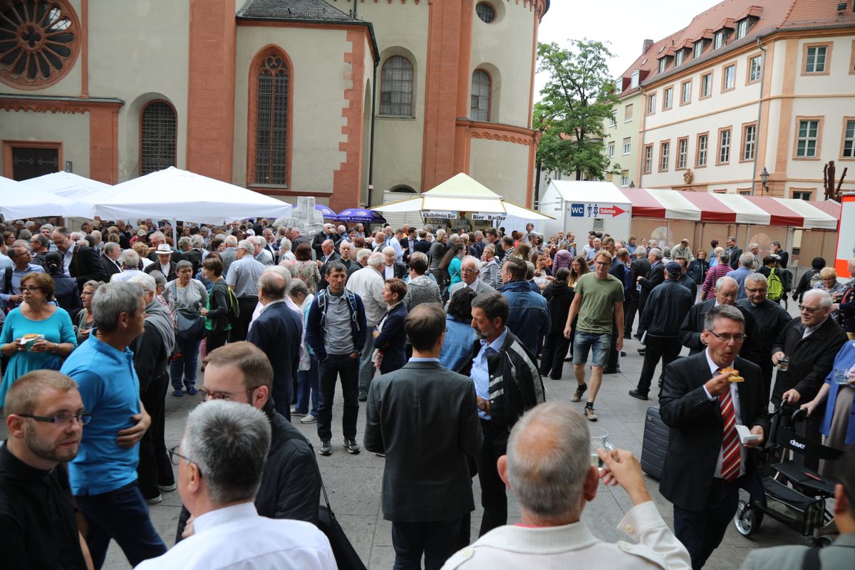 Bei der anschließenden Begegnung auf dem Kiliansplatz nutzten viele Menschen die Gelegenheit, Bischof Hofmann persönlich zum Goldenen Priesterjubiläum zu gratulieren und auch mit seinem Nachfolger Bischof Jung ins Gespräch zu kommen.