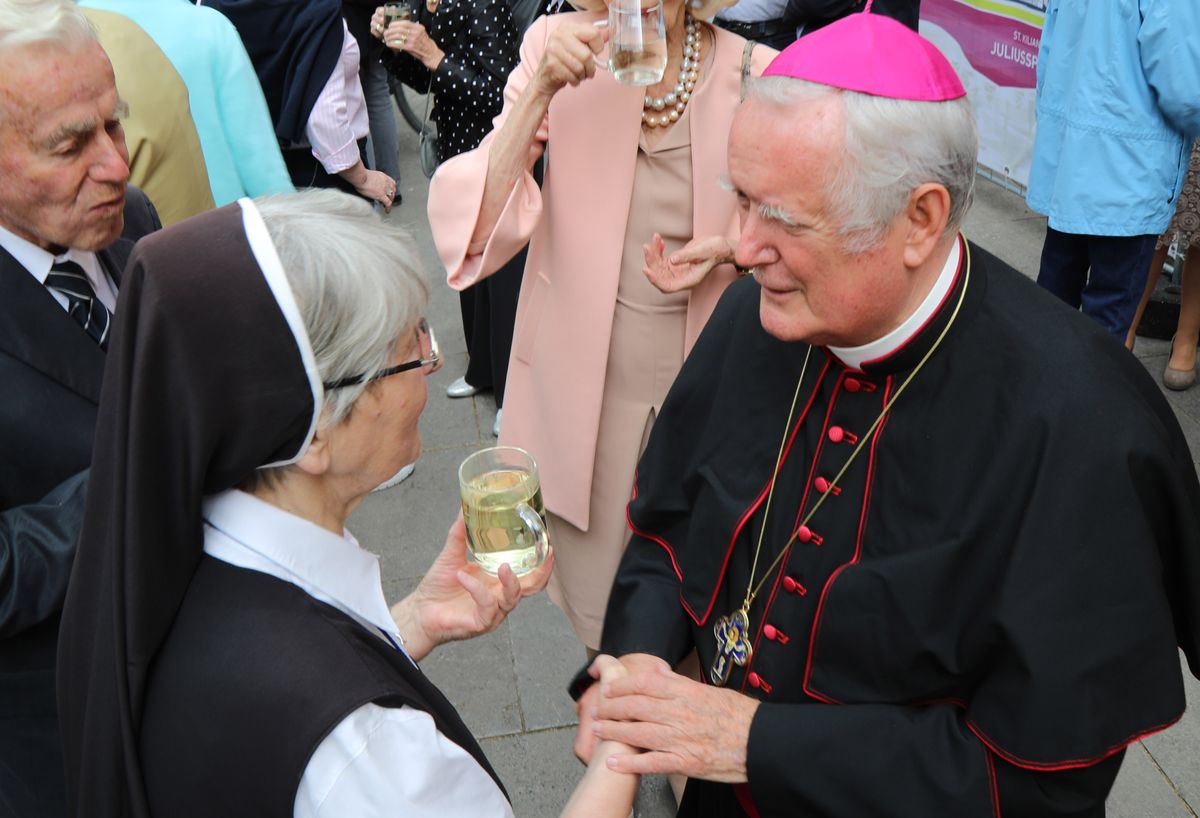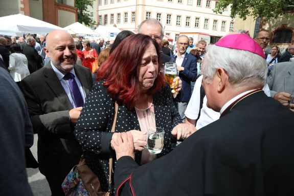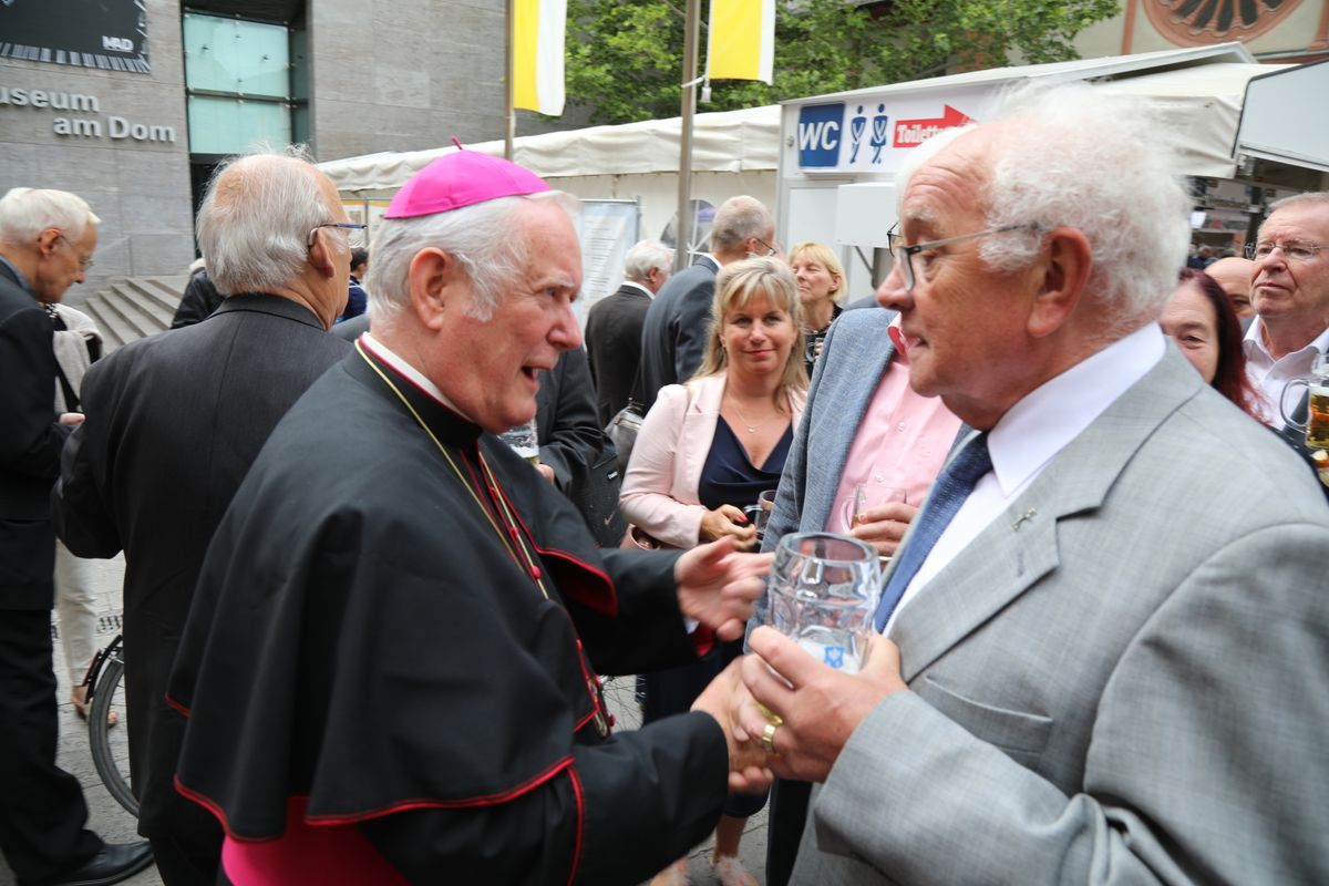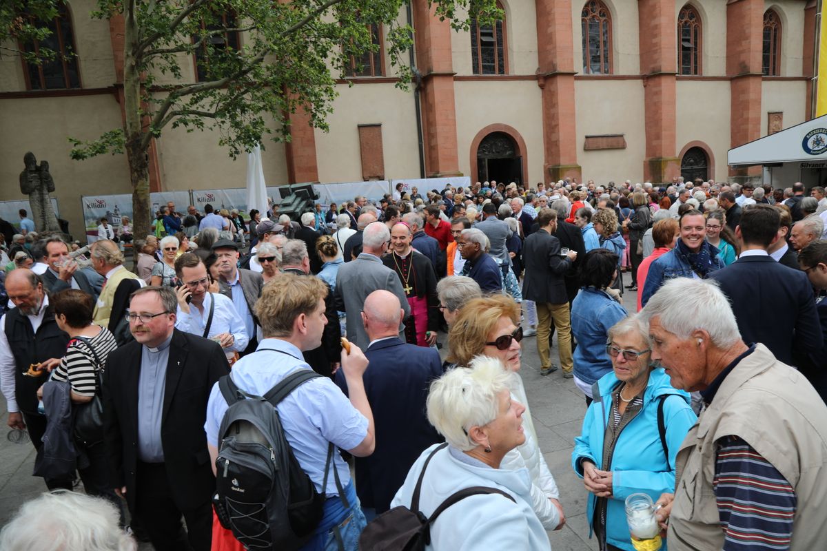 Bei der anschließenden Begegnung auf dem Kiliansplatz nutzten viele Menschen die Gelegenheit, Bischof Hofmann persönlich zum Goldenen Priesterjubiläum zu gratulieren und auch mit seinem Nachfolger Bischof Jung ins Gespräch zu kommen.