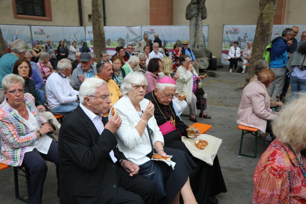 Bischof em. Dr. Friedhelm Hofmann feierte den Kiliani-Gottesdienst für Priester, Diakone und pastorale Kräfte am Dienstag, 9. Juli, und beging damit nachträglich sein 50. Jubiläum der Priesterweihe. Zahlreiche Gläubige nutzten die Begegnung auf dem Kiliansplatz im Anschluss, um Bischof Hofmann persönlich zu gratulieren.