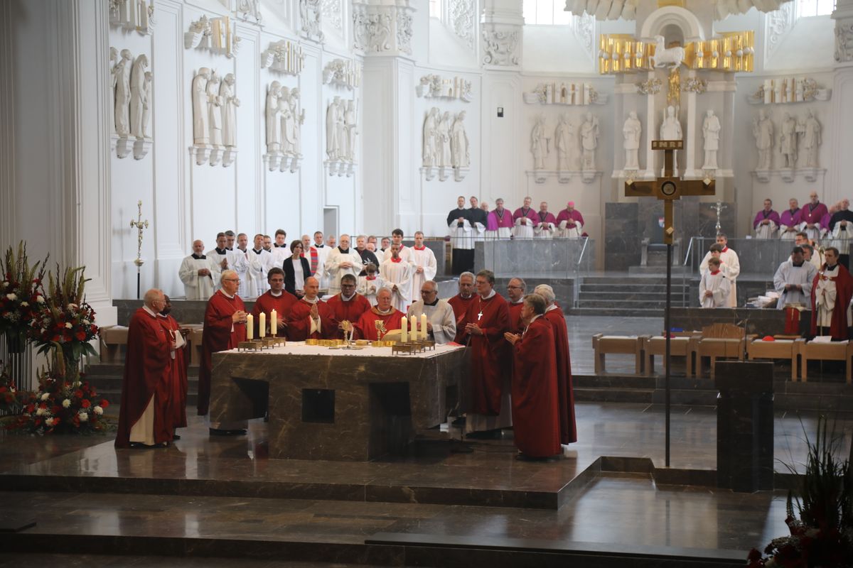 In seiner Predigt betonte Bischof Hofmann, die grundsätzlichen Fragen „Woher kommen wir? Wer sind wir? Wohin gehen wir?“ beschäftigten die Menschen zu allen Zeiten. „Das war vor 50 Jahren, als ich mein ‚Adsum‘ sprach, genauso wie heute in dieser Stunde des Dankens.“ Damals, in den 1960er Jahren, habe die Kirche scheinbar gefestigt dagestanden. Die Erfahrungen der nationalsozialistischen Schreckensherrschaft und die Folgen des Zweiten Weltkriegs hätten noch die ethischen Fragen des Wirtschaftswunders geprägt. Im Zweiten Vatikanischen Konzil habe sich die Kirche den gesellschaftlichen Fragen gestellt und weitgehend positive Resonanz erfahren.