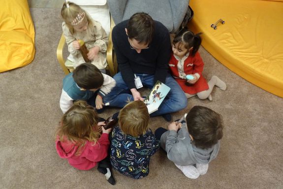Franz Wiehl, Trägervertreter der KiTa Margherita, kam zum Vorlesen zu den Kita-Kindern. Die jungen Zuhörenden gingen mit dem Vorleser auf eine Fantasiereise mit Hexen und sprechenden Tieren. „Bei den Kindern entsteht Interesse, selbst Bücher anzusehen und erste Buchstaben zu erkennen“, freute sich Wiehl. Das zu erleben, sei auch für den Vorleser ein Geschenk. Wiehl las aus seinen Lieblingskinderbüchern „Heule Eule“ und „Für Hund und Katz ist auch noch Platz“ vor.