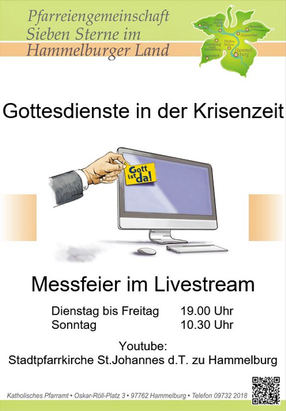 Den Trend zum Livestream hat das Seelsorgeteam der Pfarreiengemeinschaft „Sieben Sterne im Hammelburger Land, Hammelburg“ aufgegriffen. Seit Mittwoch, 18. März, werden auf YouTube Gottesdienste und Impulse eingestellt. Pfarrer Thomas Eschenbacher und Pfarrer i. R. Edwin Erhart feiern dienstags bis freitags um 19 Uhr sowie sonntags um 10.30 Uhr einen Gottesdienst in der Stadtpfarrkirche Sankt Johannes der Täufer in Hammelburg, sagt Pastoralreferent Markus Waite. Außerdem werde montags bis samstags jeweils um 11 Uhr ein Impuls gesendet. Es sei gar nicht so einfach, vor laufender Kamera zu sprechen, erklärt Waite: „Wenn ich mich bei der Predigt mal verspreche, sage ich den Satz einfach noch einmal. Aber bei einer Aufnahme ist der Anspruch hoch, es fehlerfrei zu machen.“ Die Gläubigen nehmen das Angebot an. „Spitzenreiter“ ist derzeit der Sonntagsgottesdienst vom 22. März mit über 1000 Aufrufen. Der Küster habe die Abrufe ausgewertet. Ergebnis: „Im Schnitt schaut jeder User bei einem Gottesdienst eine halbe Stunde zu.“ Für das Team ein Ansporn, noch mehr anzubieten. „Wir planen ein Hörspiel mit einem biblischen Text“, erzählt Waite. Gesendet werden soll es in den Tagen nach Ostern.
