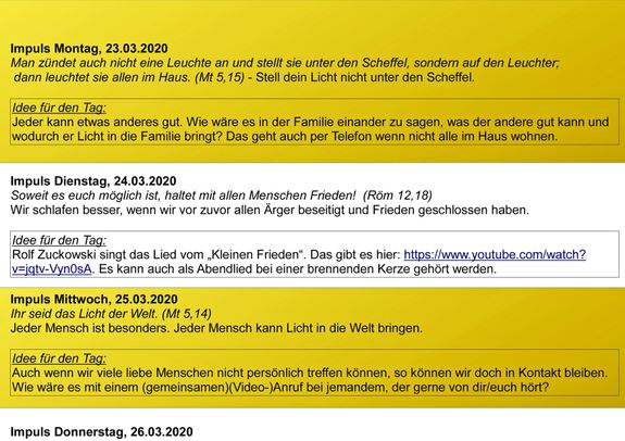 Impulse für jeden Tag enthält beispielsweise der „Hausbrief zur Corona-Zeit“ der Pfarreiengemeinschaft „Regenbogen im Bachgau, Pflaumheim“ und der Einzelpfarrei Großostheim. Er wurde am Sonntag, 22. März, erstmals per E-Mail verschickt. Gestaltet wird er vom Seelsorgeteam. Rund 20 Interessenten haben sich bereits angemeldet, berichtet Gemeindereferent Simon Marx. Auf der Vorderseite ist das Sonntagsevangelium mit einem kurzen Impuls abgedruckt. Auf der Rückseite finden sich die täglichen Impulse mit Ideen zur Umsetzung. „Soweit es euch möglich ist, haltet mit allen Menschen Frieden!“, heißt es etwa am Dienstag. Dazu gibt es einen Link zum Lied vom „Kleinen Frieden“, das man gemeinsam als Abendlied hören kann. Knifflig wird es beim „Bibelkuchen-Rätsel-Rezept“ für den kommenden Sonntag. Wer weiß schon auf Anhieb, welche Zutat sich hinter „1,5 Tassen Deuteronomium 32,14a“ versteckt?