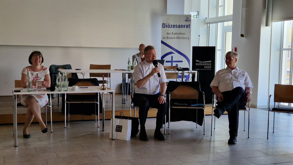Am Vormittag des eintägigen Arbeitstreffens des höchsten Laiengremiums im Bistum Würzburg fand ein Austausch der Vertretungen der Pastoralen Räume aus ganz Unterfranken mit Generalvikar Vorndran statt. Zum Austausch mit den Vertretungen der katholischen Verbände und Organisationen kam am späten Nachmittag noch Weihbischof Paul Reder mit dazu. Besprochen wurden unter anderem die sich bereits abzeichnenden Auswirkungen der vor kurzem im Diözesanforum besprochenen Strategischen Ziele, das Miteinander von Hauptberuflichen und freiwillig Engagierten in den Pastoralen Räumen, die immer weiter zunehmende Verwaltungsarbeit beim pastoralen Personal oder auch der Umgang mit Mitgliedern der AfD in den Laienräten und Kirchenverwaltungen des Bistums Würzburg. Viele Sorgen und Nöte aus den Pastoralen Räumen und Verbänden kamen dabei zur Sprache, es waren aber auch viel Mut zur Veränderung und Hoffnung zu spüren. Generalvikar Vorndran dankte allen Anwesenden für ihr ehrenamtliches Engagement: „Wir sind in einem Veränderungsprozess. Es tut gut zu hören, wie toll Sie diesen vor Ort begleiten. Lassen Sie uns diesen gemeinsamen Weg weitergehen, damit es in Ihren Gemeinden möglich wird, kirchliches Leben zukunftsfähig weiterzuentwickeln.“