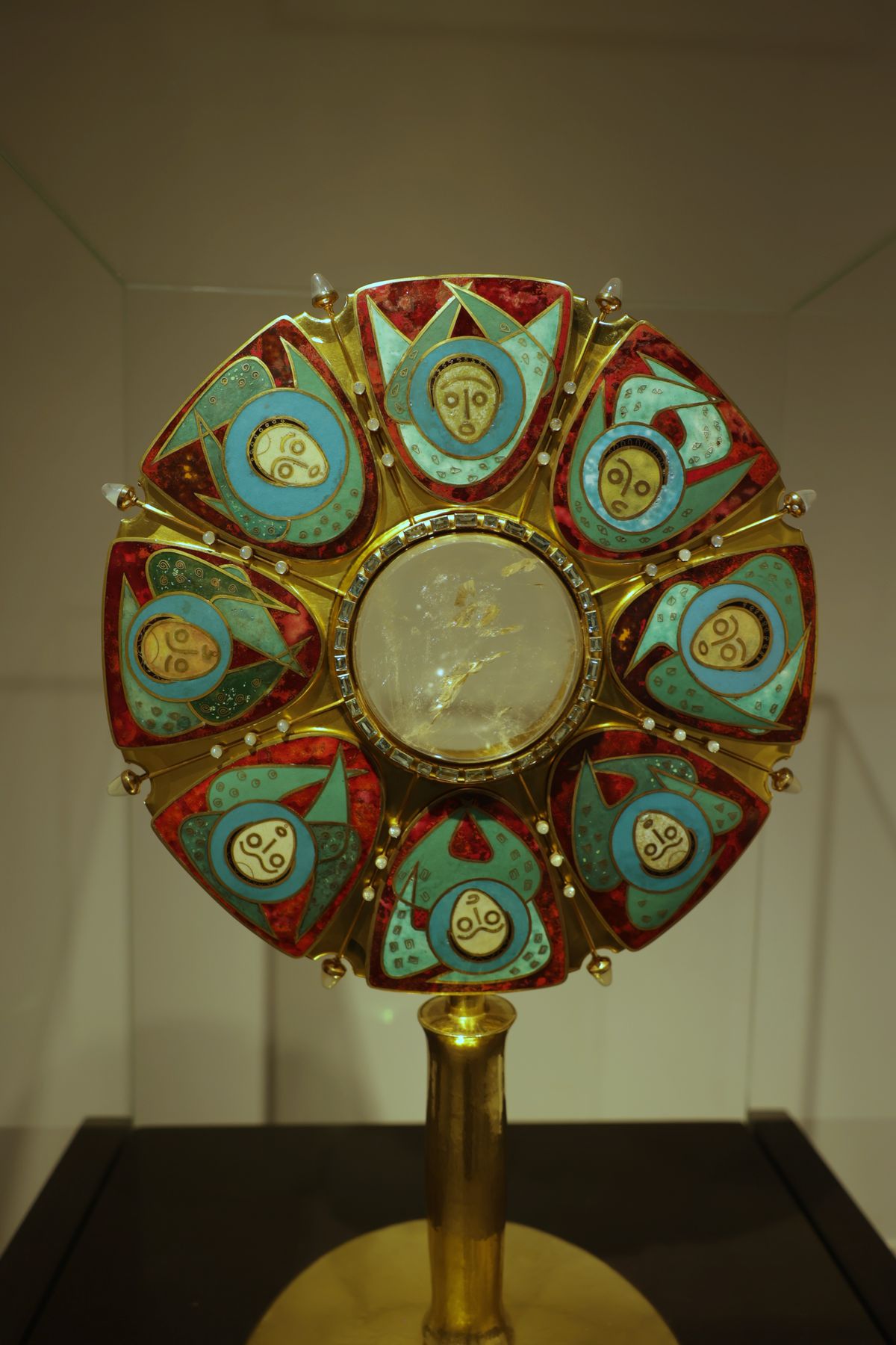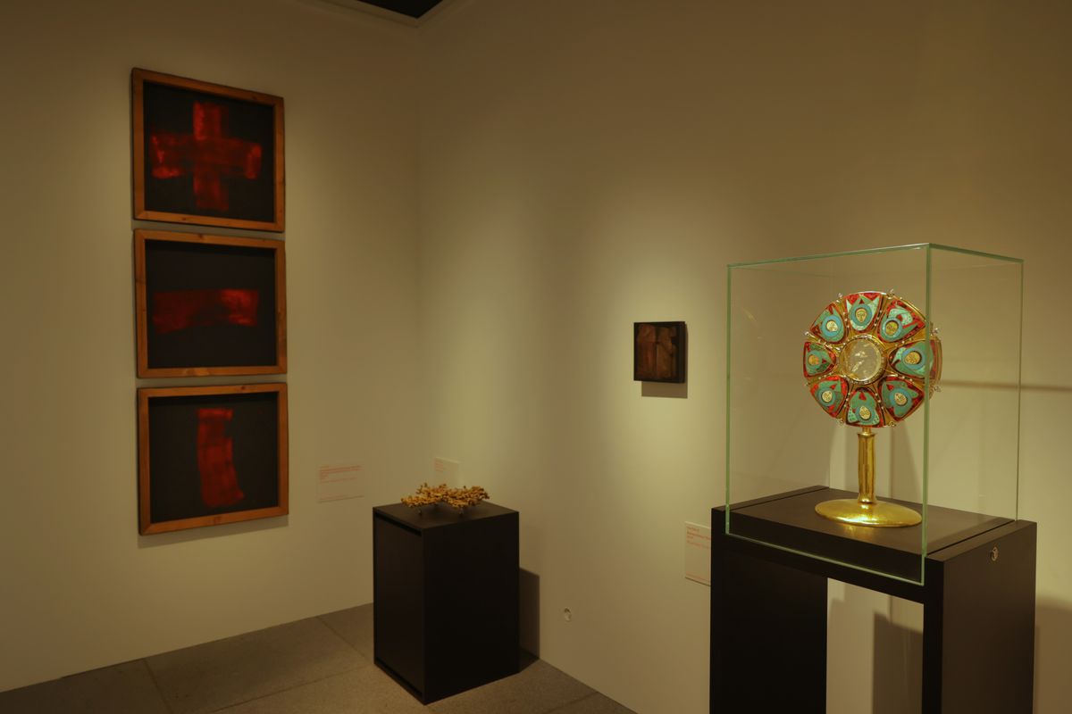Über lange Zeit hinweg sei die künstlerische Rolle von Frauen hauptsächlich auf traditionelles Kunsthandwerk beschränkt gewesen, erklärte Kurator Christoph Deuter. Besonders in Nonnenklöstern seien in der Barockzeit reich bestickte Messgewänder sowie aufwändig gestaltete Klosterfrauenarbeiten aus Glassteinen, Perlen, Pailletten, Gold- und Silberdrähten entstanden. „Die Monstranz, eine Goldschmiedearbeit von Schwester M. Astrid Bartholme von den Oberzeller Franziskanerinnen, lässt sich vielleicht schon beispielhaft als Bruch mit der traditionellen Rolle von Klosterfrauen bei der Ausübung religiösen Kunsthandwerks verstehen.“