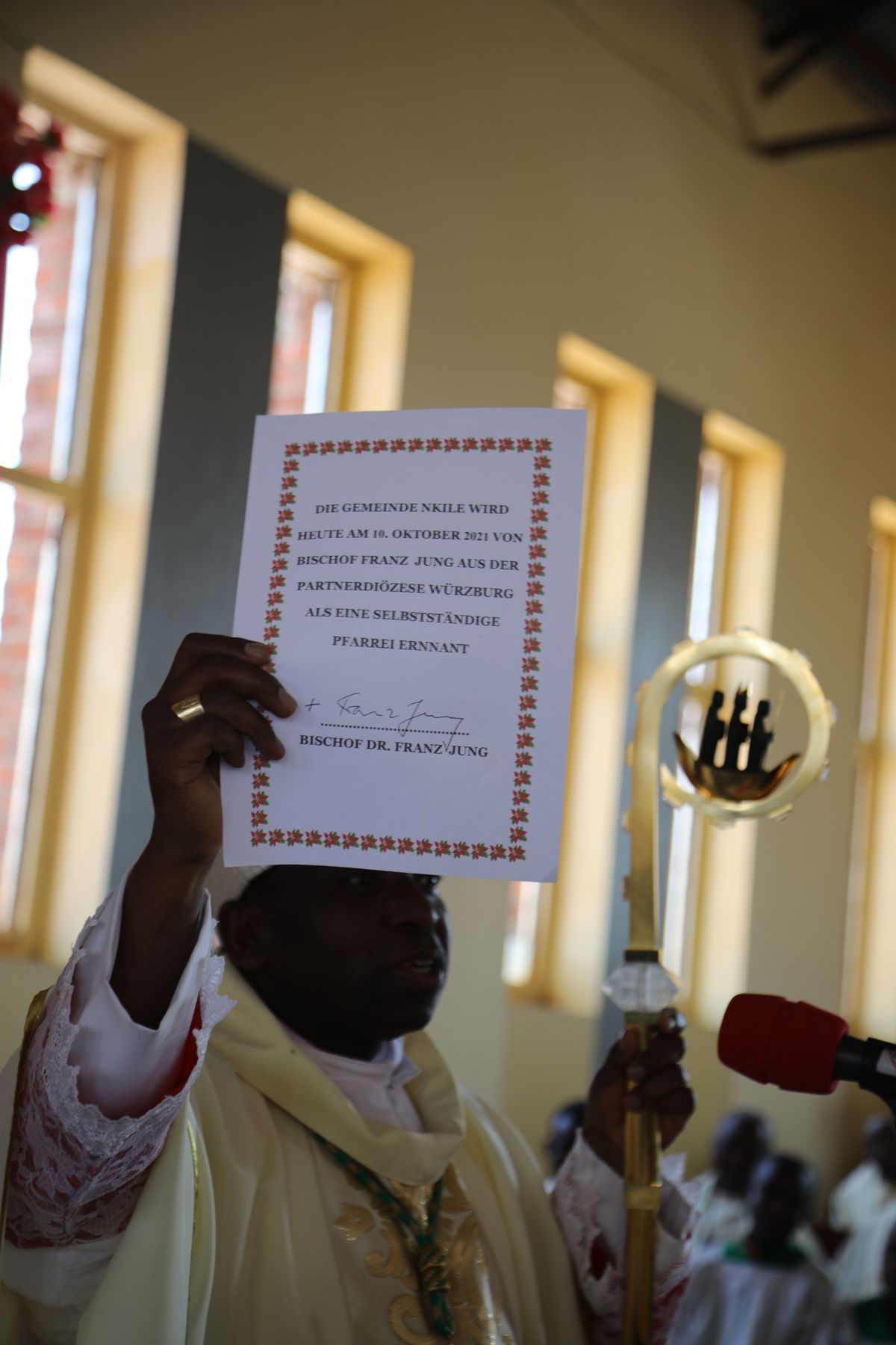 Die Begeisterung der Gläubigen hatte einen Grund: Zum einen feierten sie das 50-jährige Bestehen ihrer Gemeinde, zum anderen ernannte Bischof Jung später im Gottesdienst die Gemeinde zur eigenständigen Pfarrei. Was in Deutschland eher ein Verwaltungsakt ist, löste in Nkile Begeisterungsstürme hervor. Einige Menschen stürmten vor zum Altar, andere rollten sich sogar vor Freude über den Boden. Außerdem erklangen Vuvuzelas.